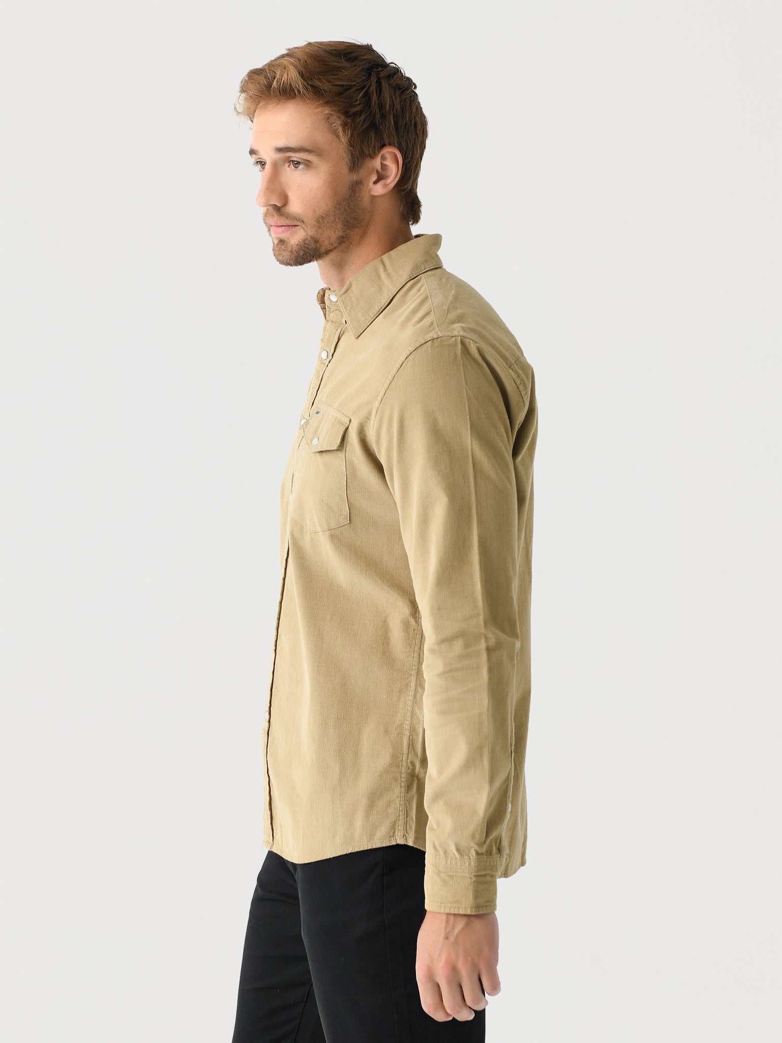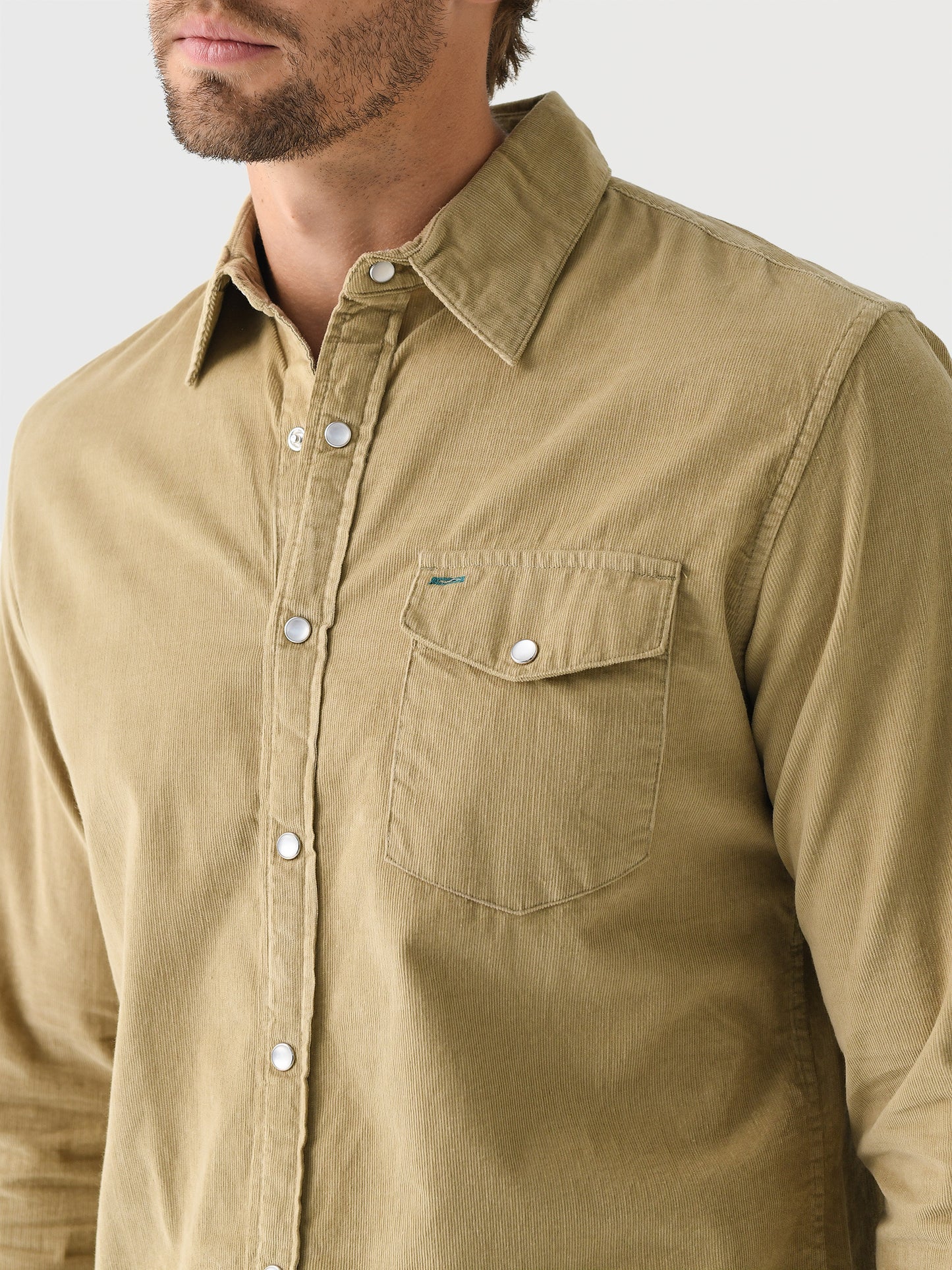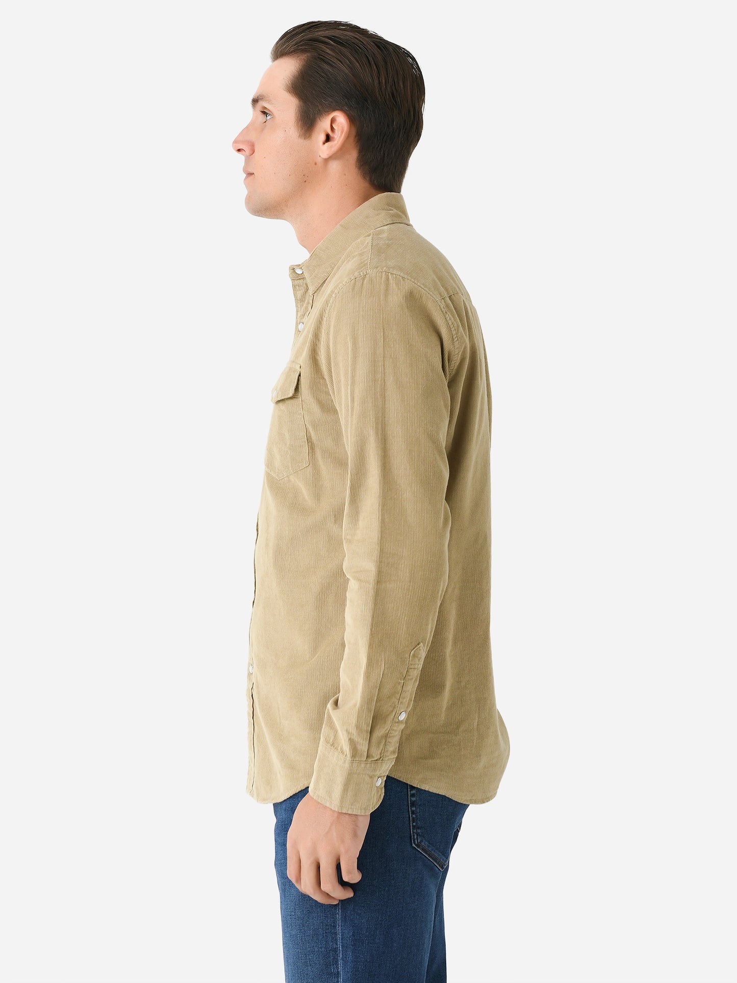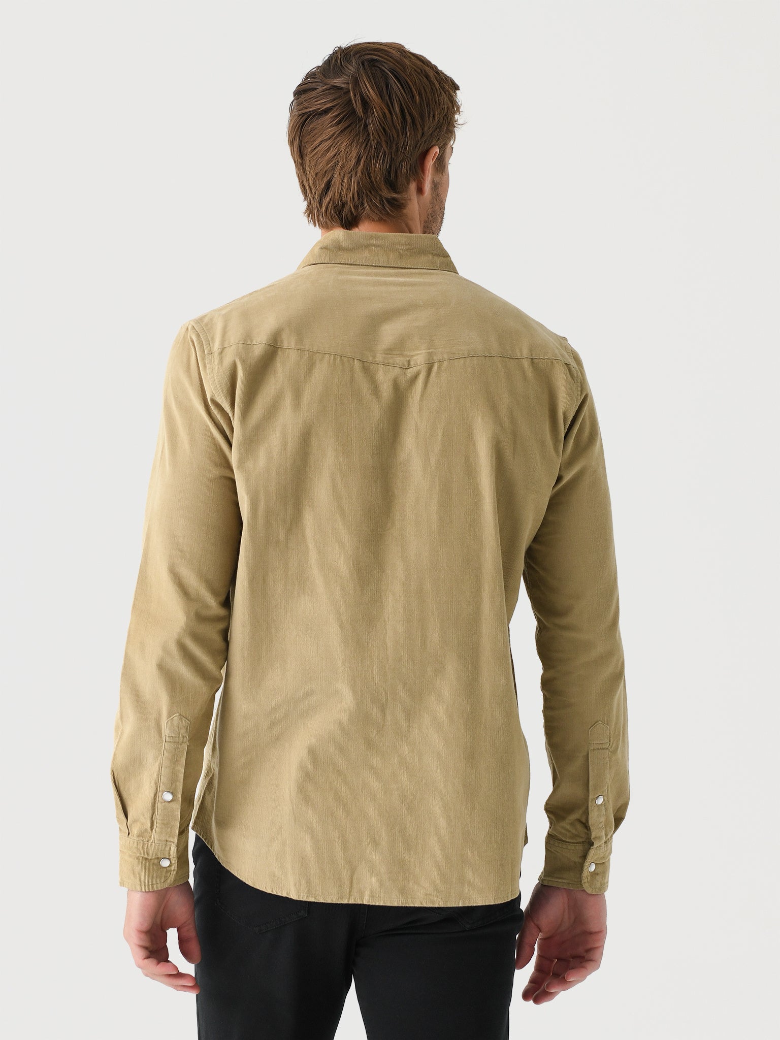 A casual button-down shirt with a western-inspired silhouette made from thin wale corduroy with pearl snap buttons.