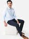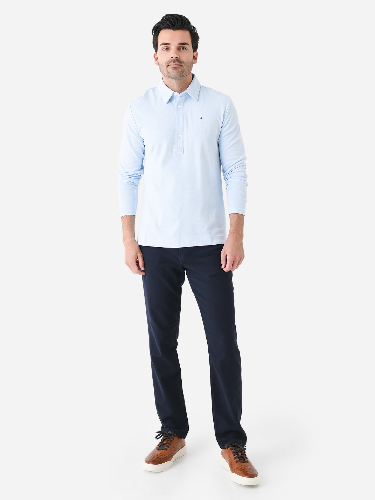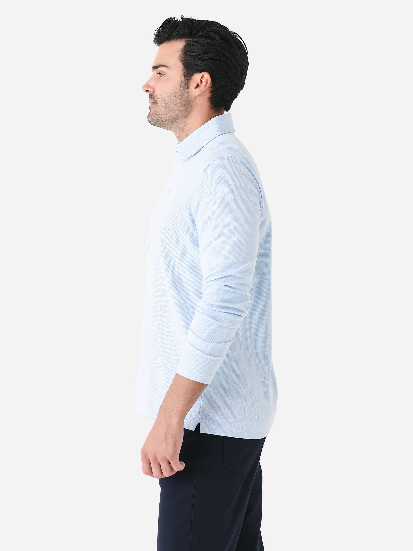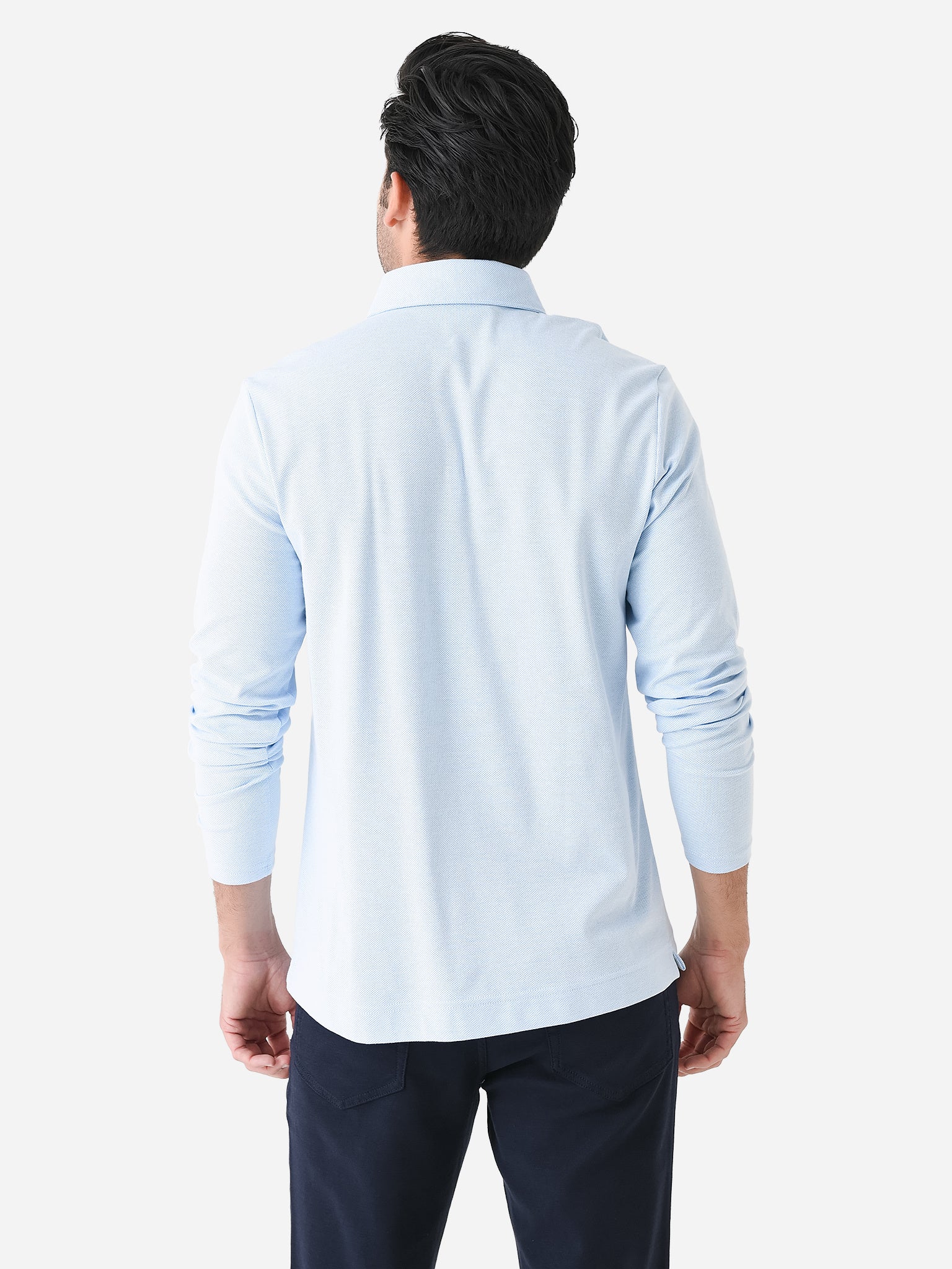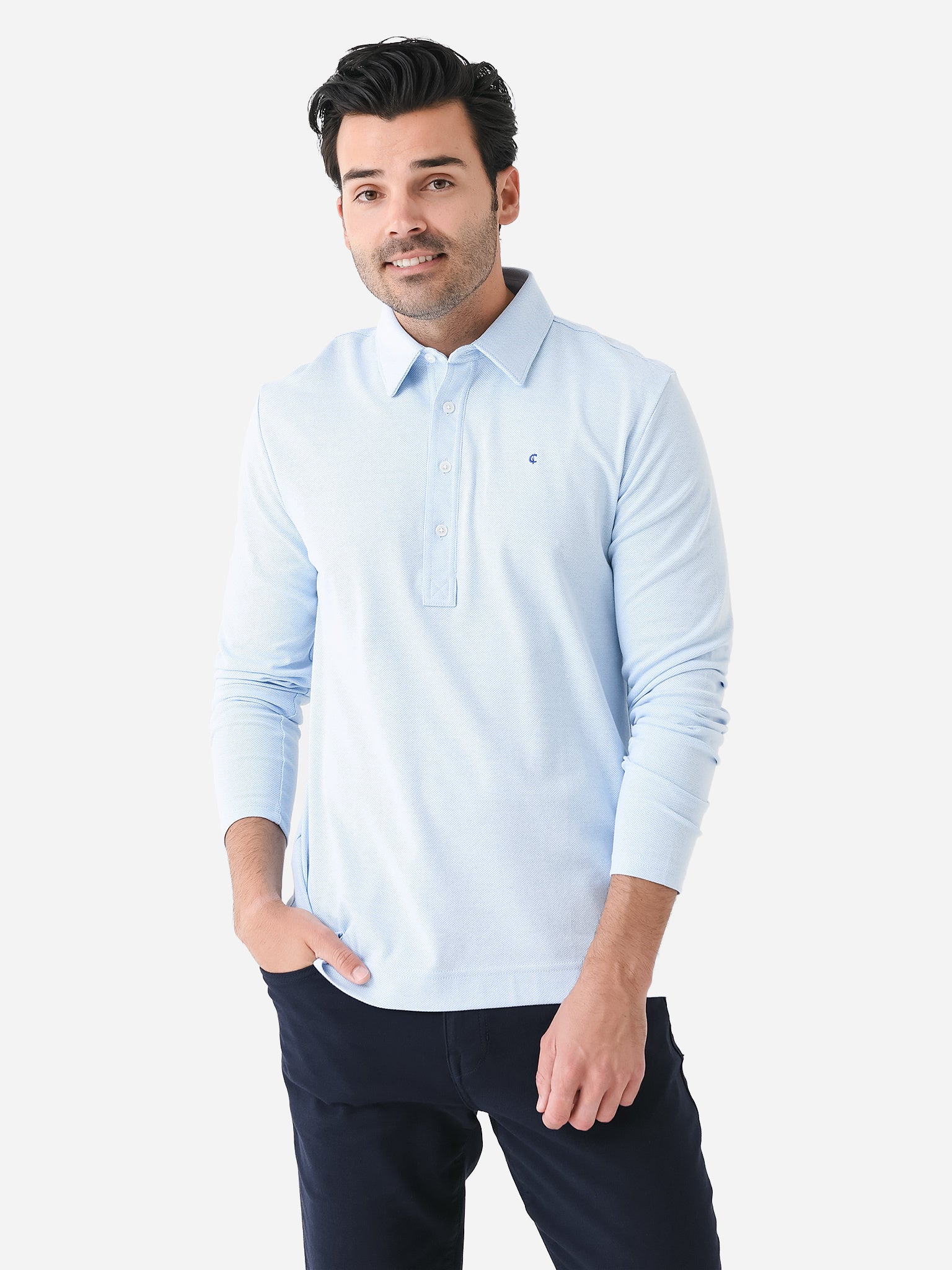 A long-sleeved polo made from a performance jacquard fabric featuring removable collar stays and a four-button placket.