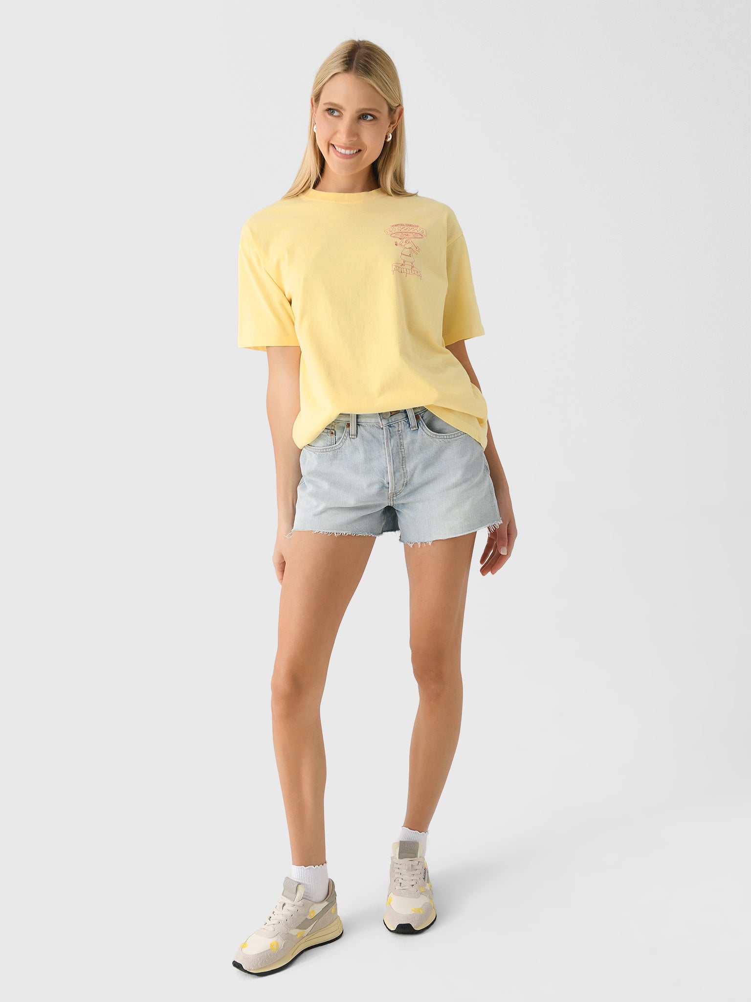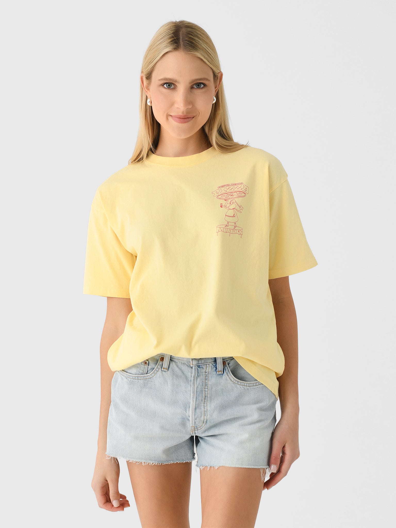 A boyfriend-style tee made from soft organic cotton featuring a playful pizza party graphic.