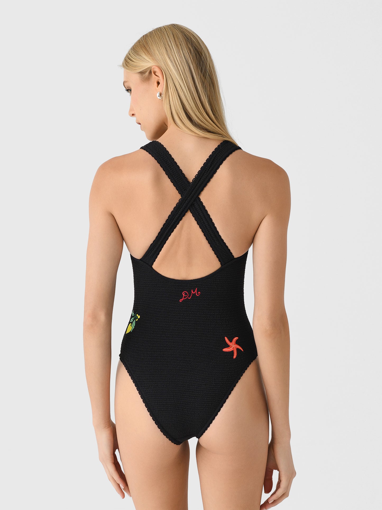 Elevate your swimwear with the Tashi Swimsuit. It features vibrant motif embroidery, a flattering scoop neck, and a sporty criss-cross back. The high-cut leg and delicate picot trim provide a luxurious finishing touch for any poolside occasion.