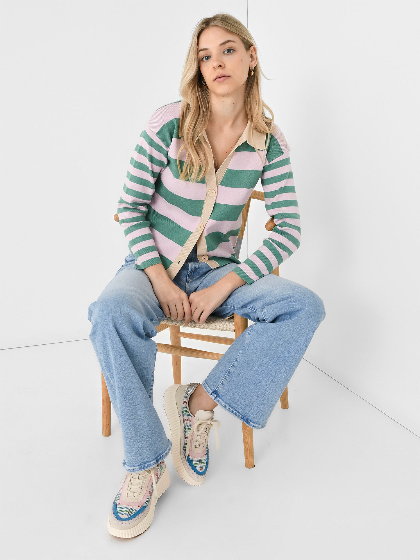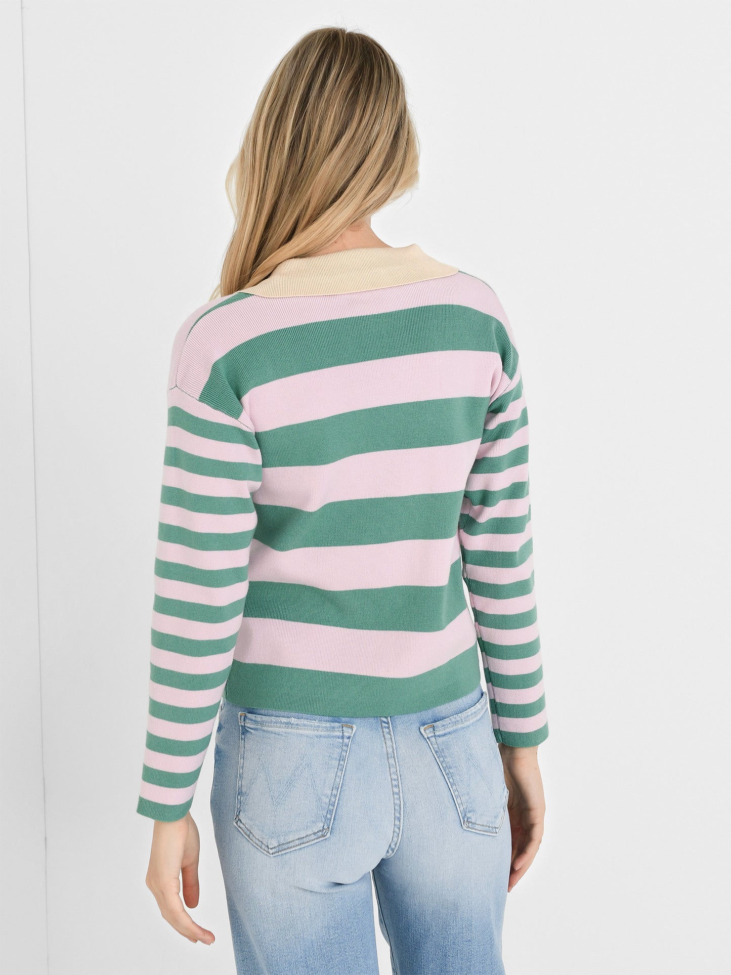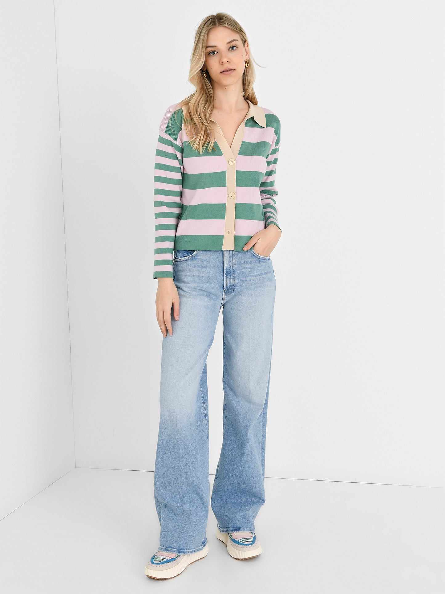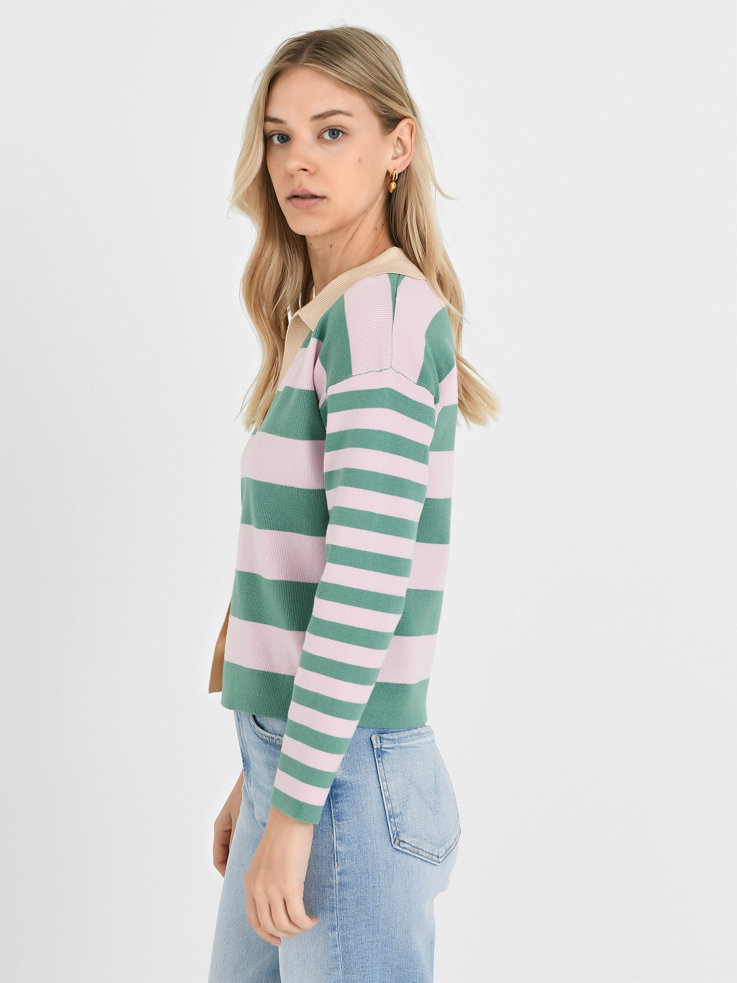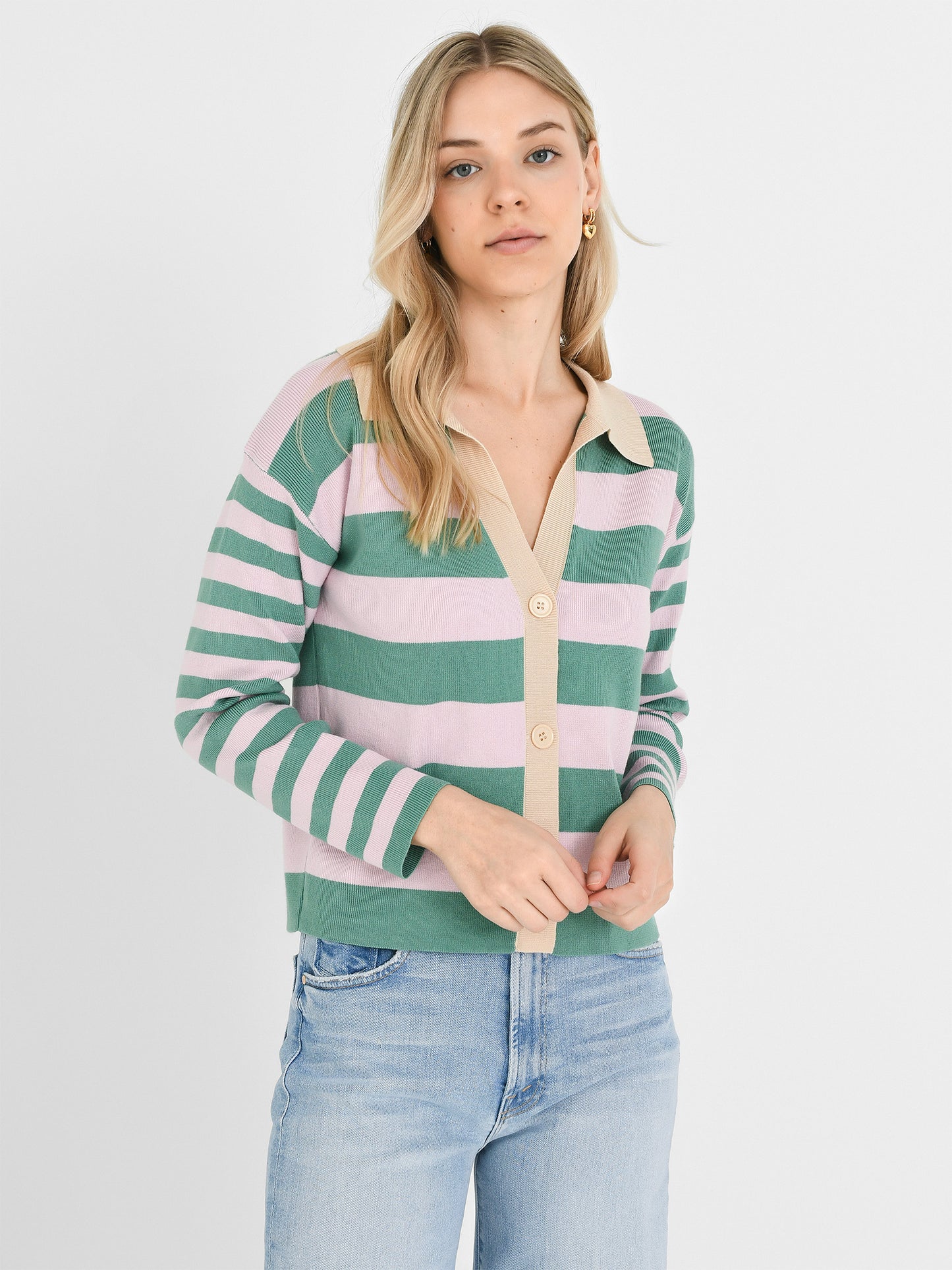 A polo-style cardigan with a two-tone stripe print.