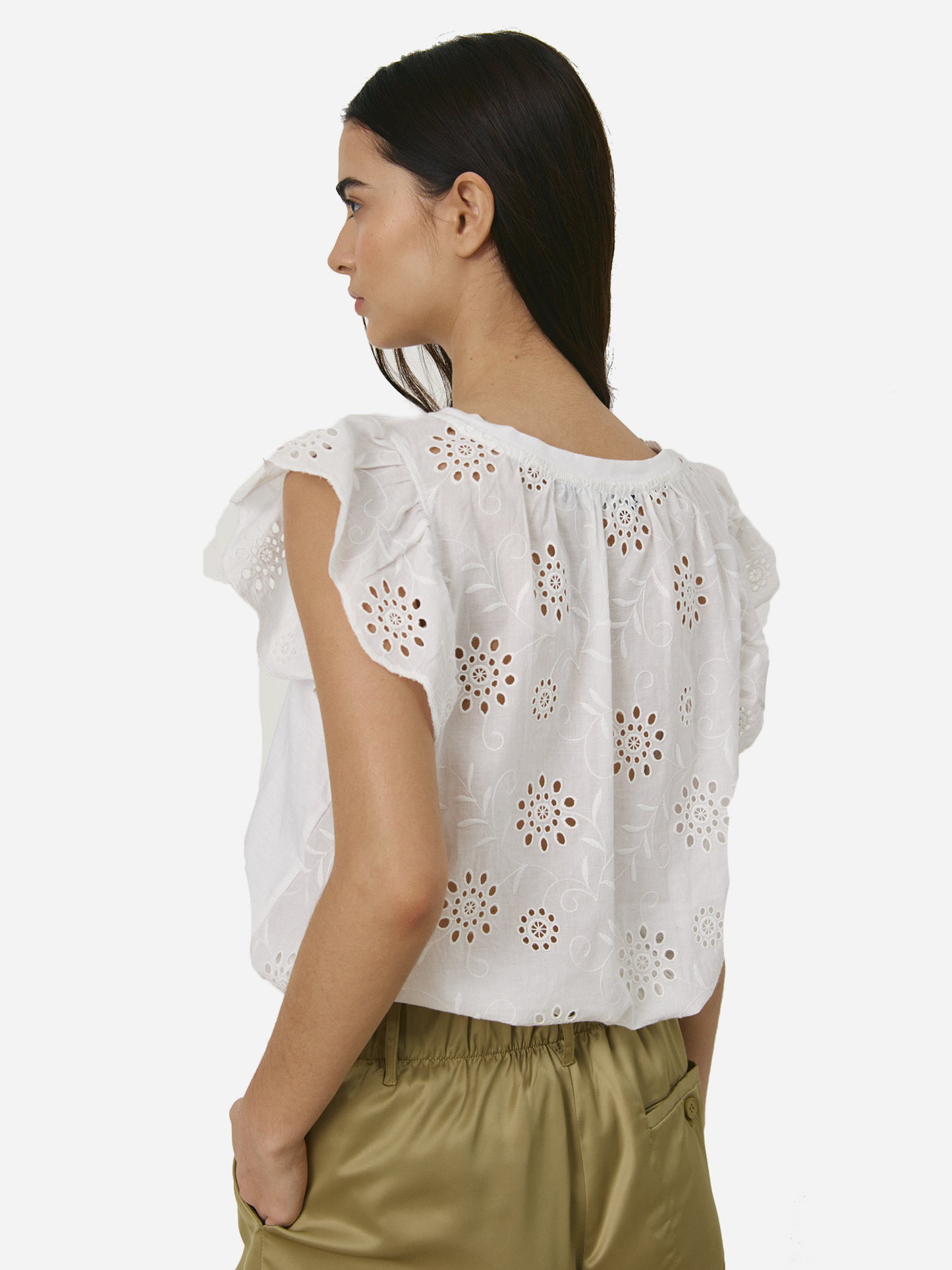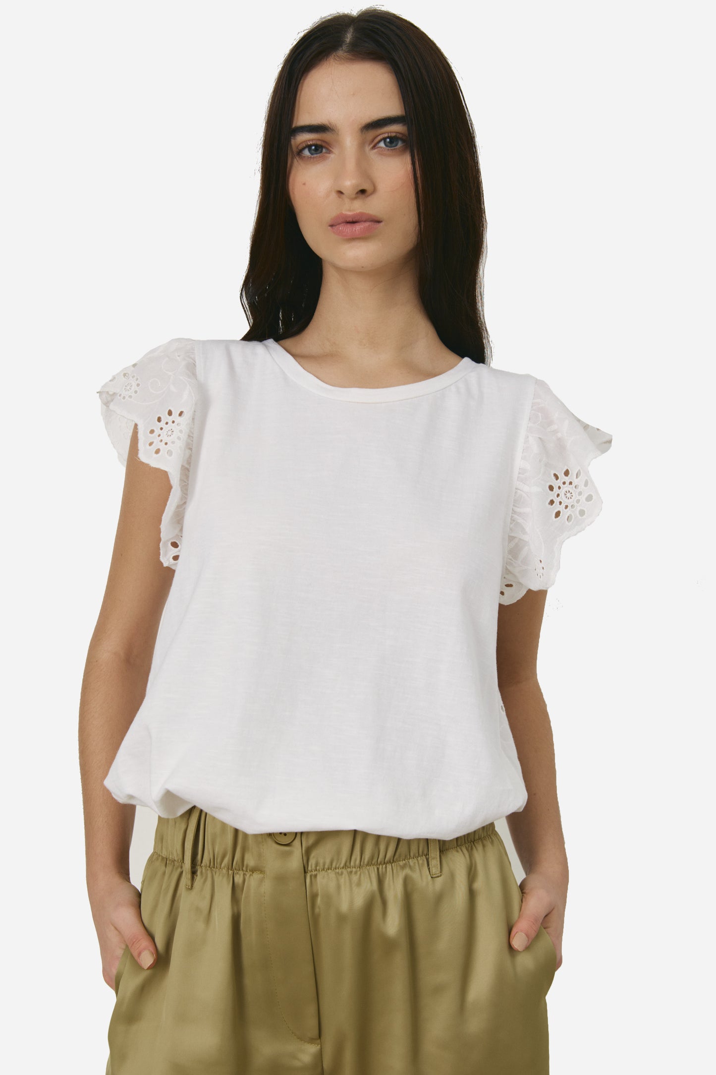 A lightweight t-shirt with an embroidered eyelet lace back and flutter sleeves.