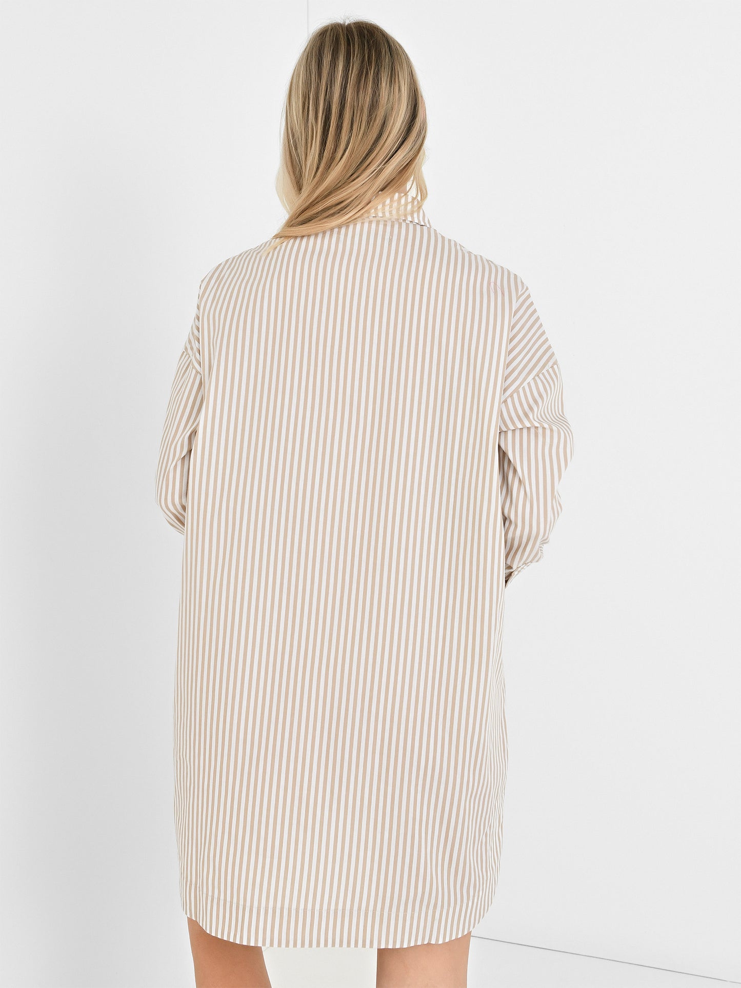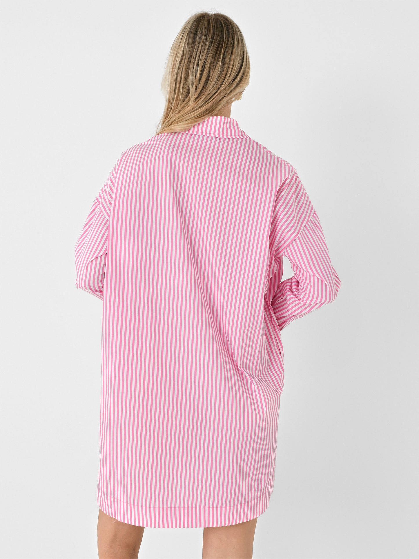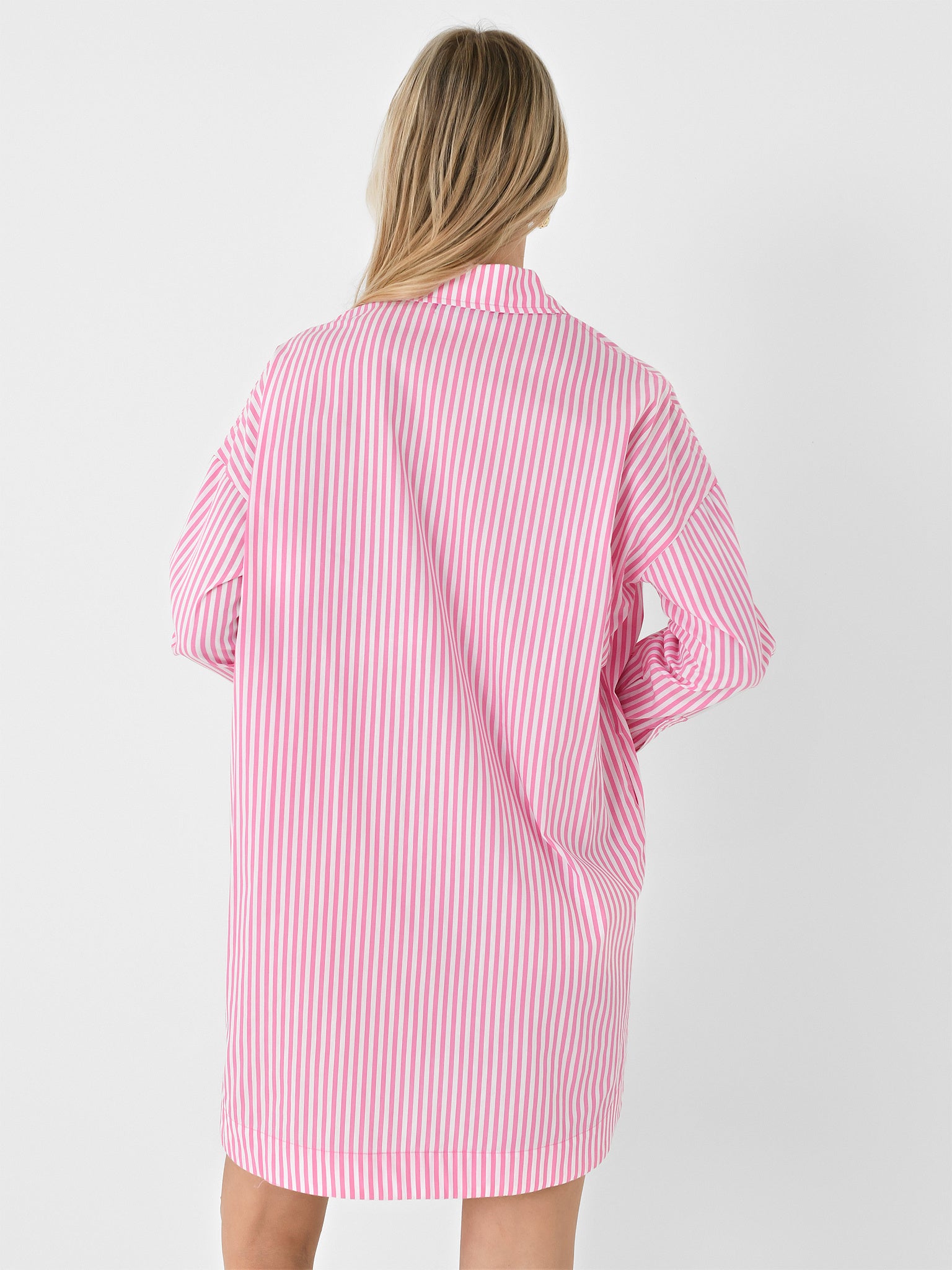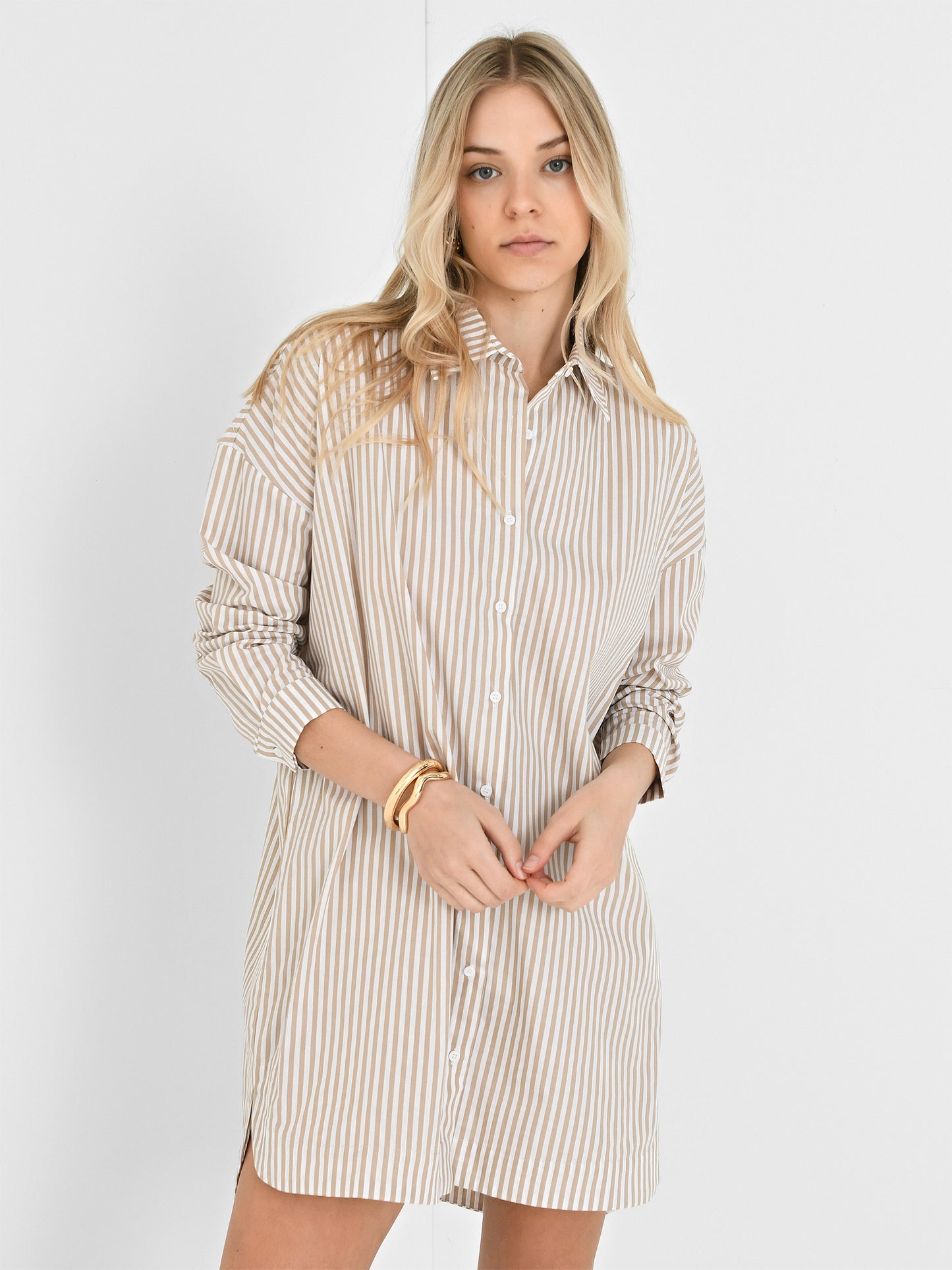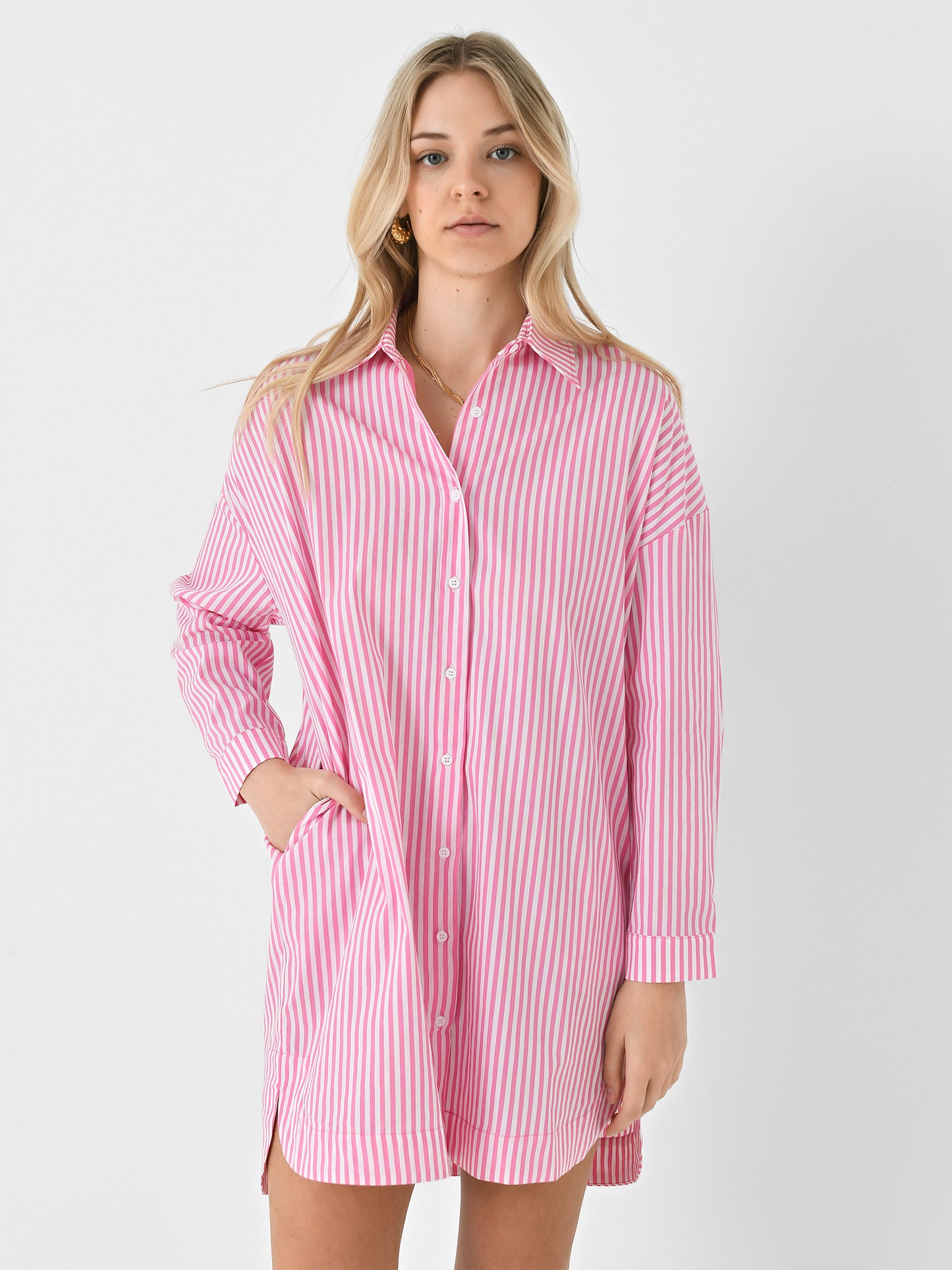 A mini shirt-style dress made from lightweight fabric with a striped print.