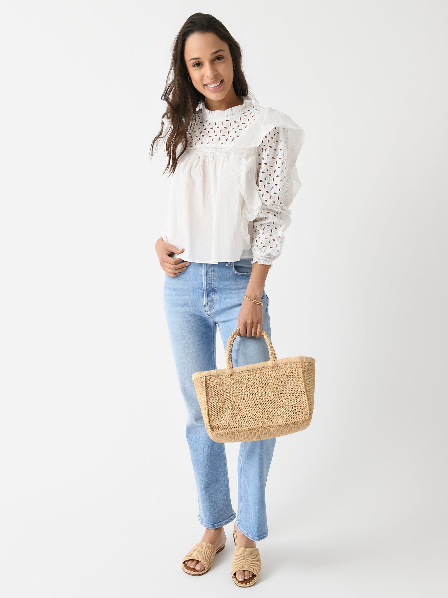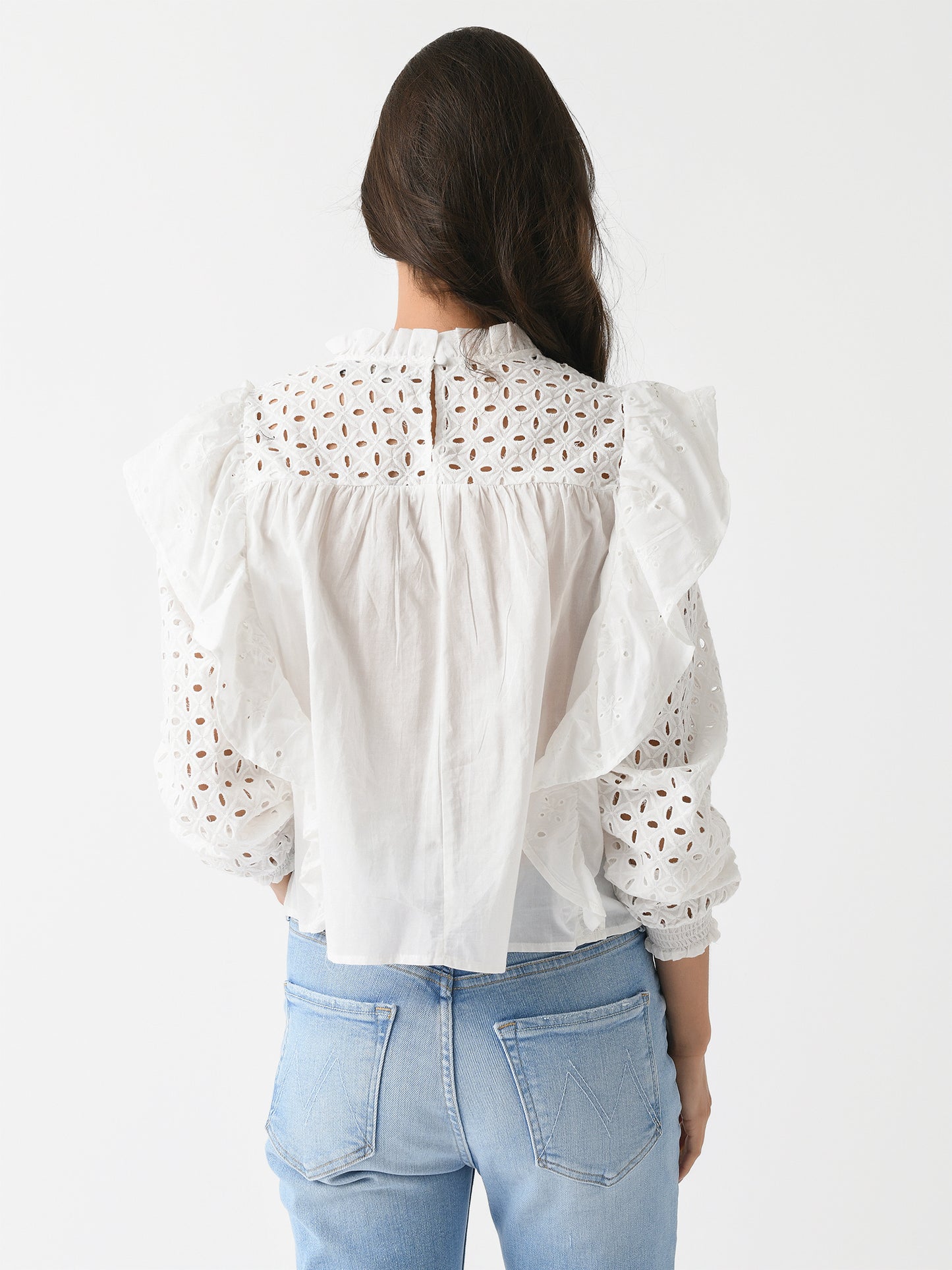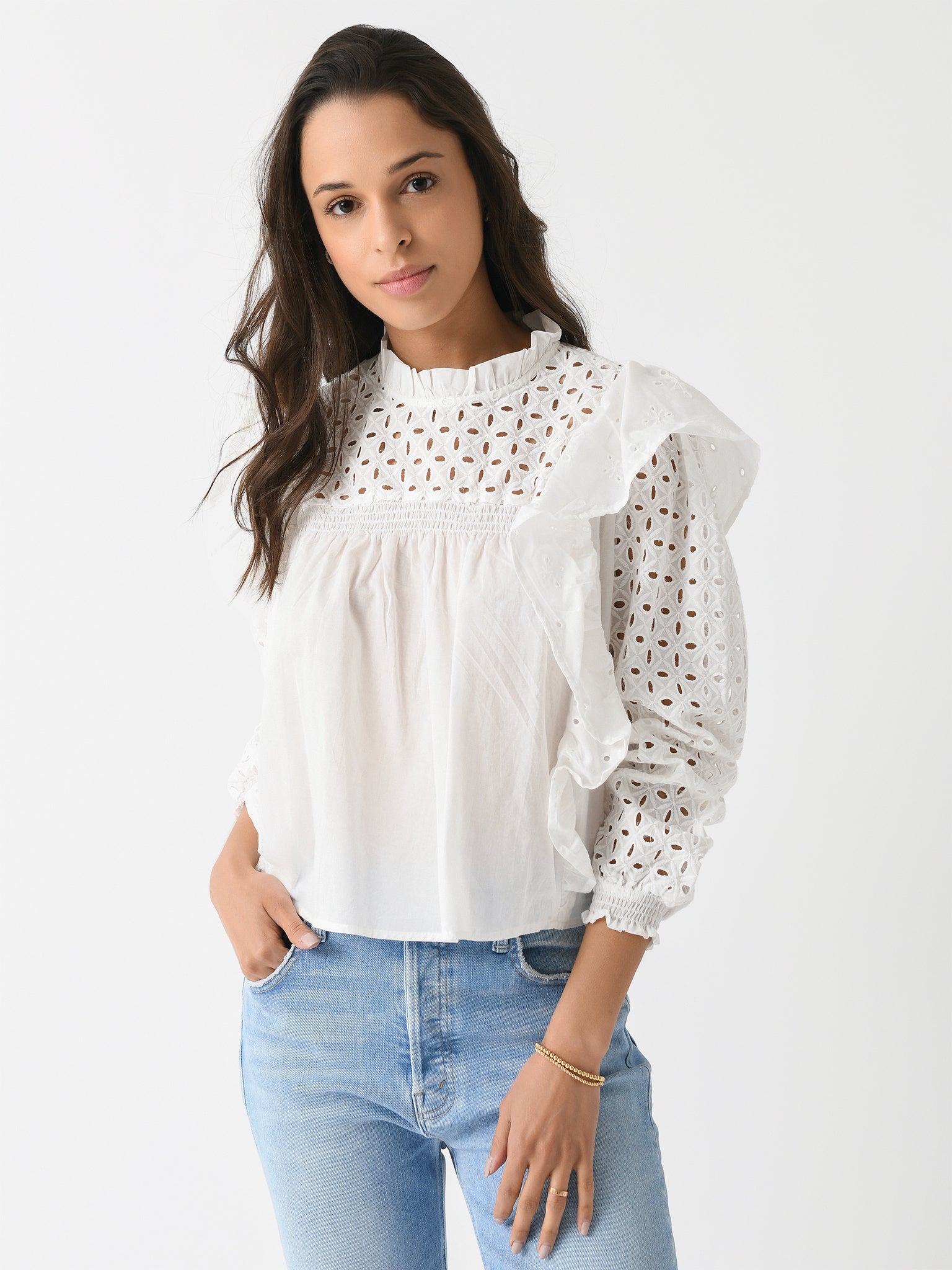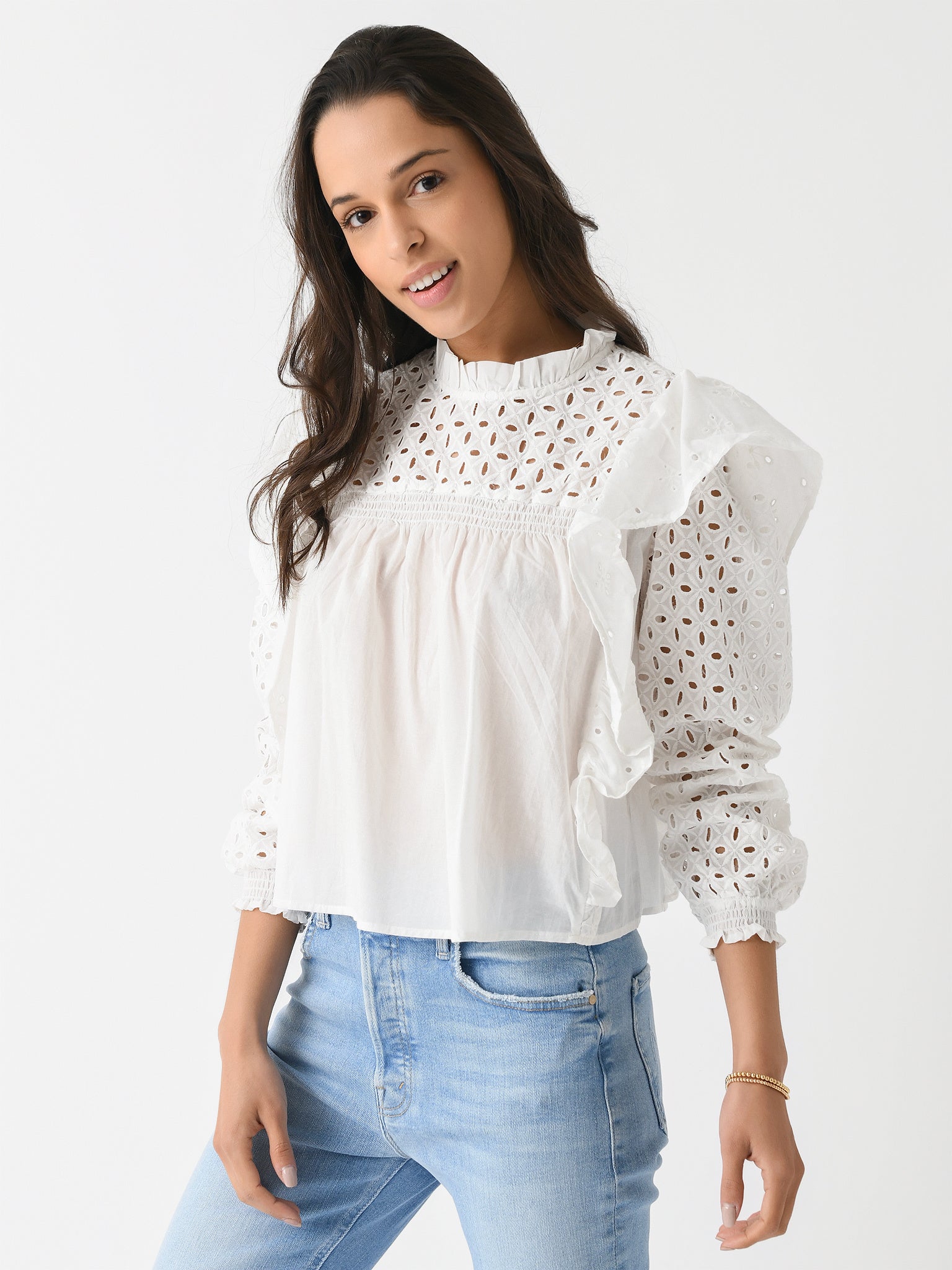 A lightweight blouse with feminine eyelet lace details and cascading ruffle trims.