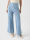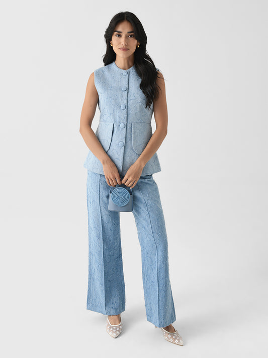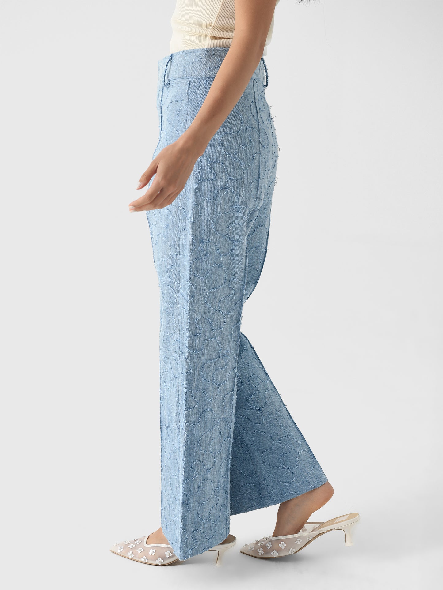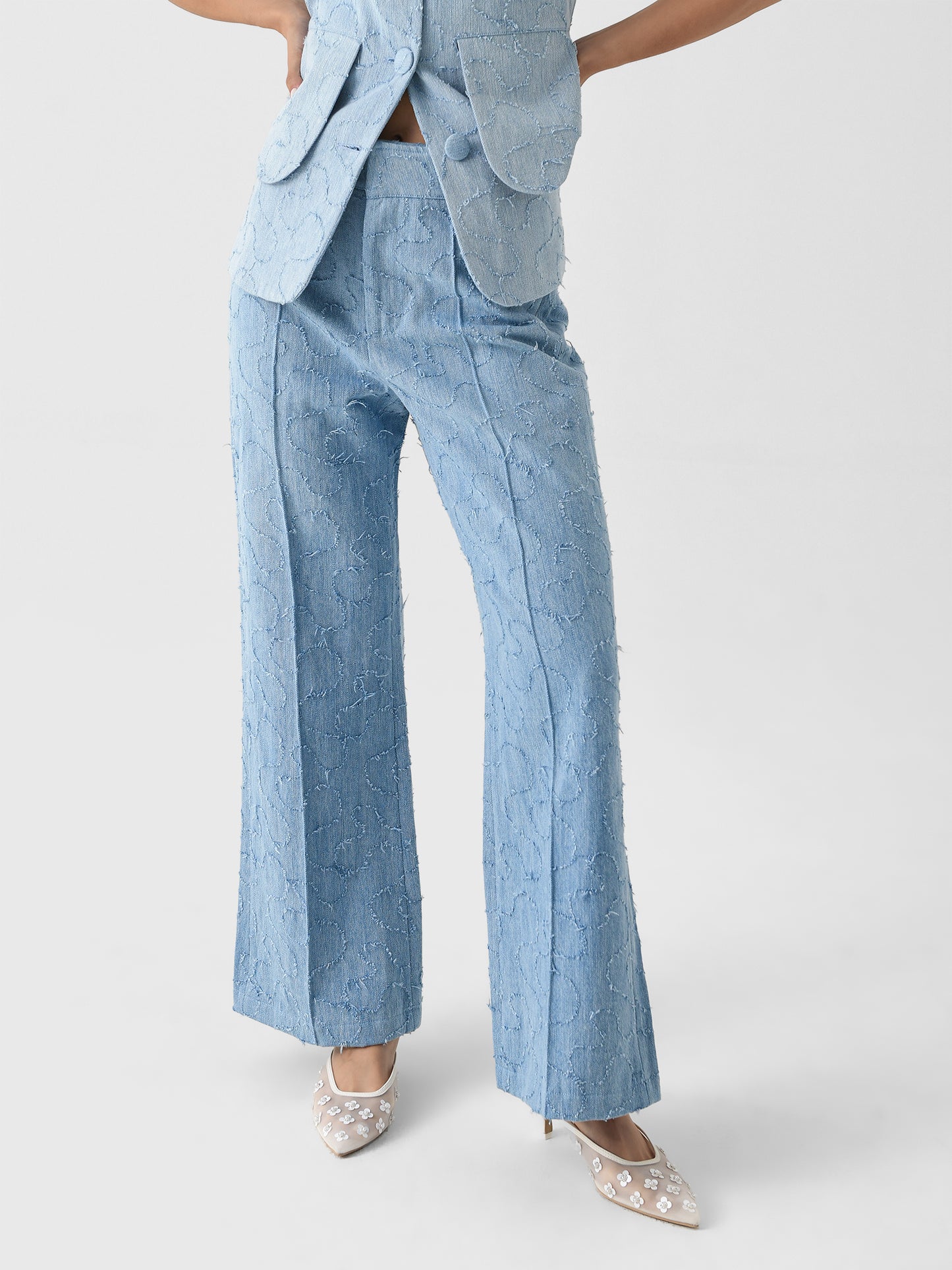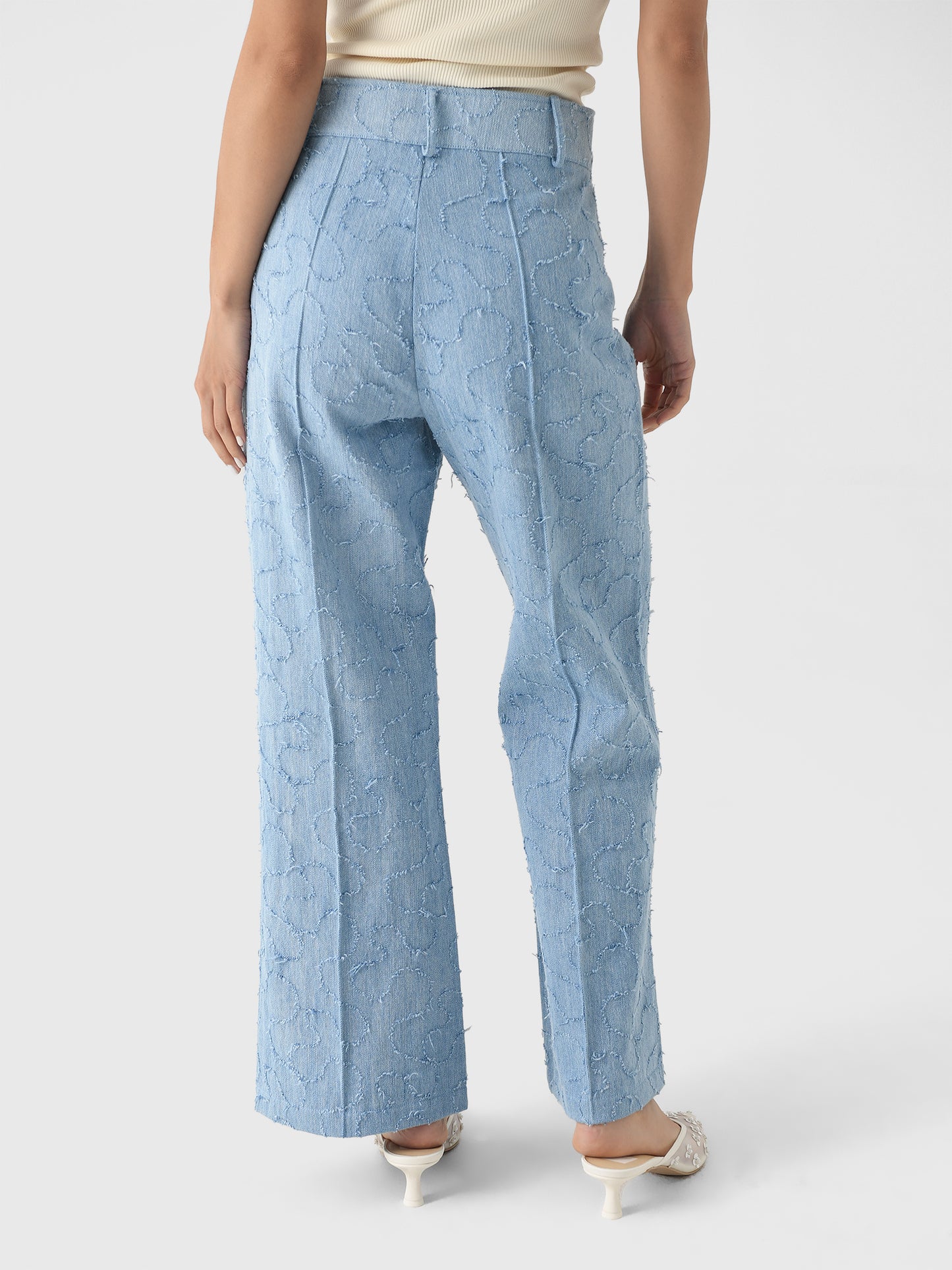 This tailored pant is made from washed denim and features artfully frayed swirling patterns, a high waist, and a flare leg with sharp creases.
