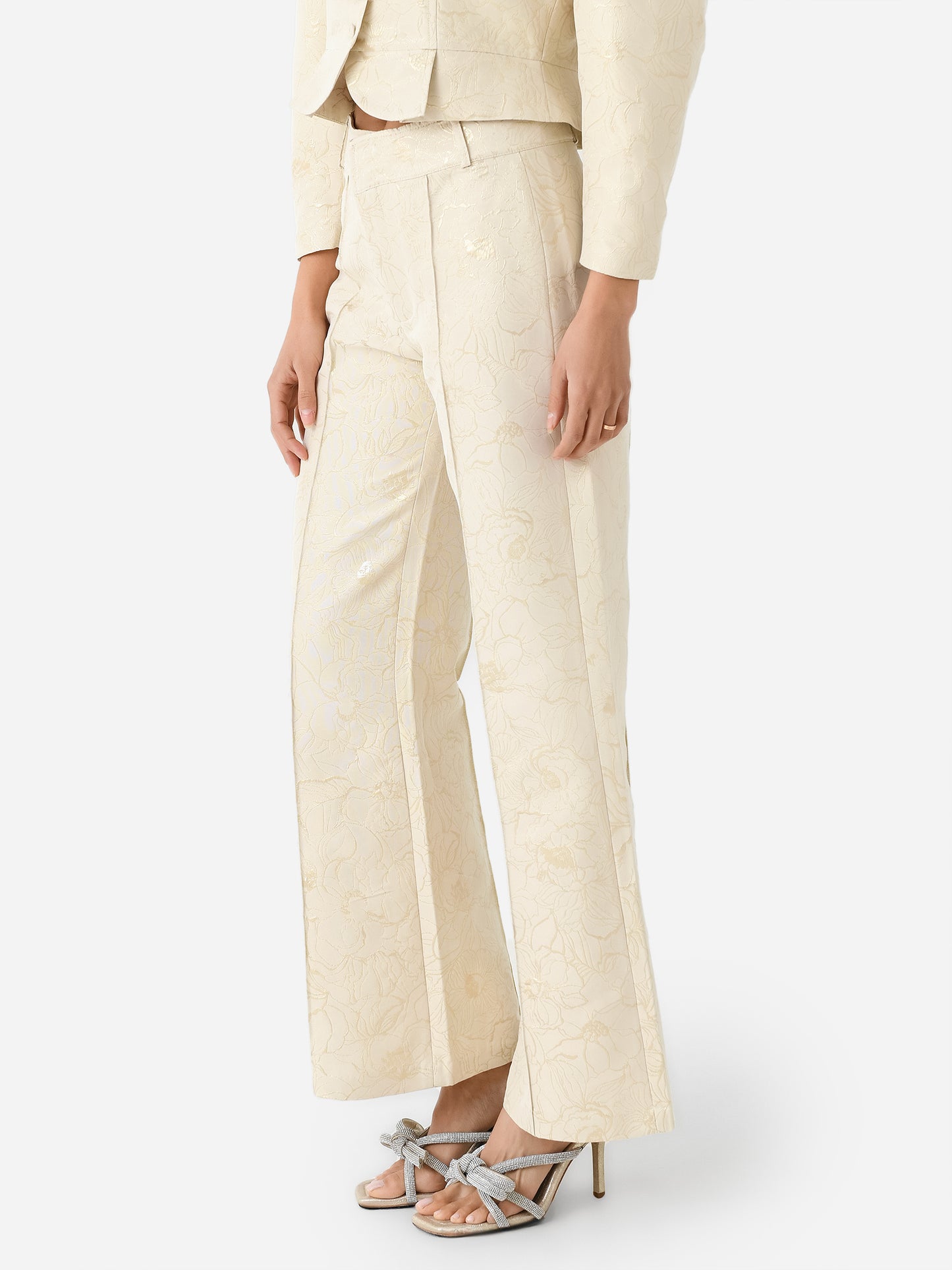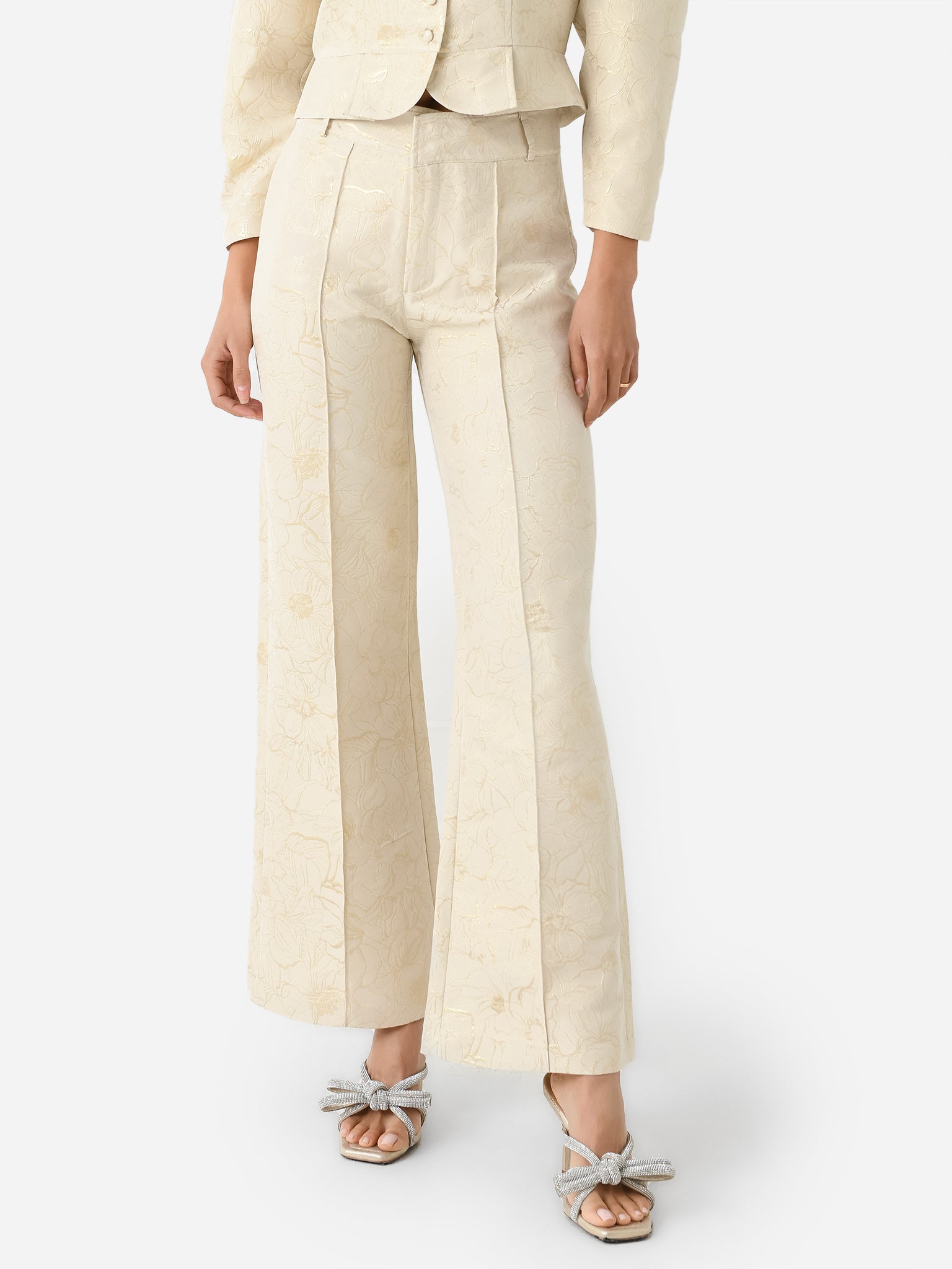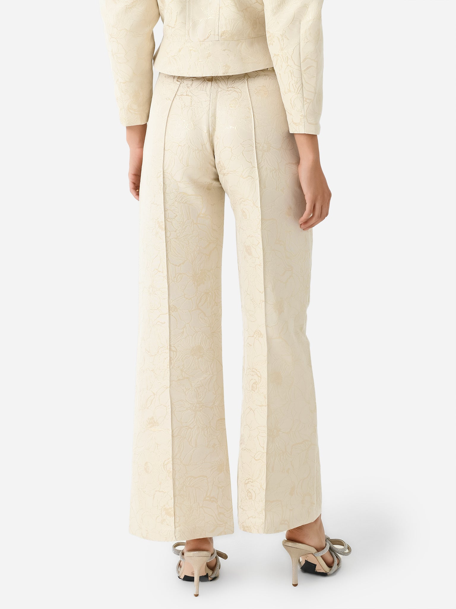 A slightly cropped, flared pant made from beautiful rose jacquard fabric.