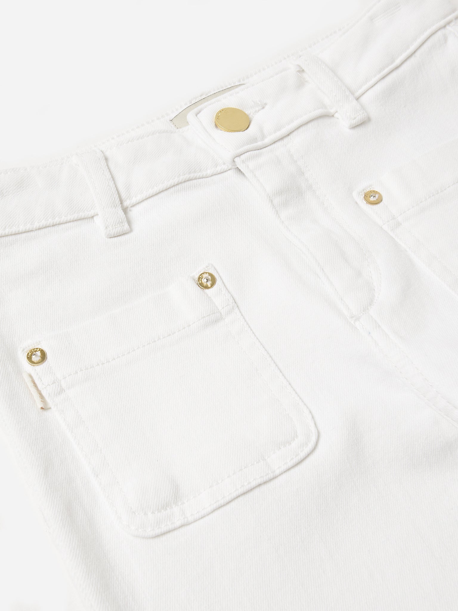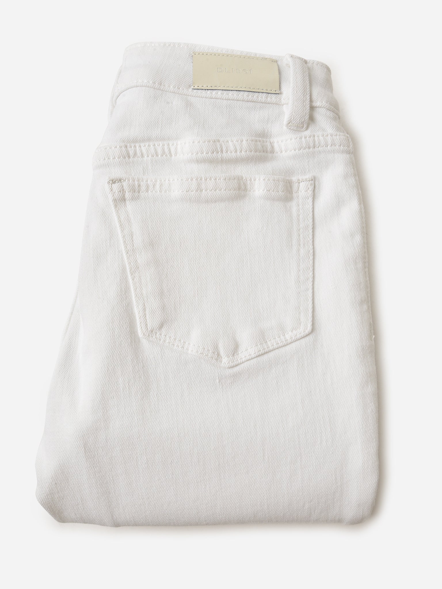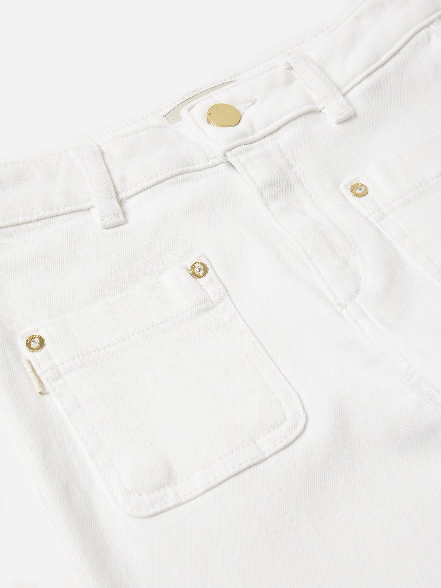 A white high-rise jean made from stretch denim with a bootcut silhouette.