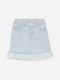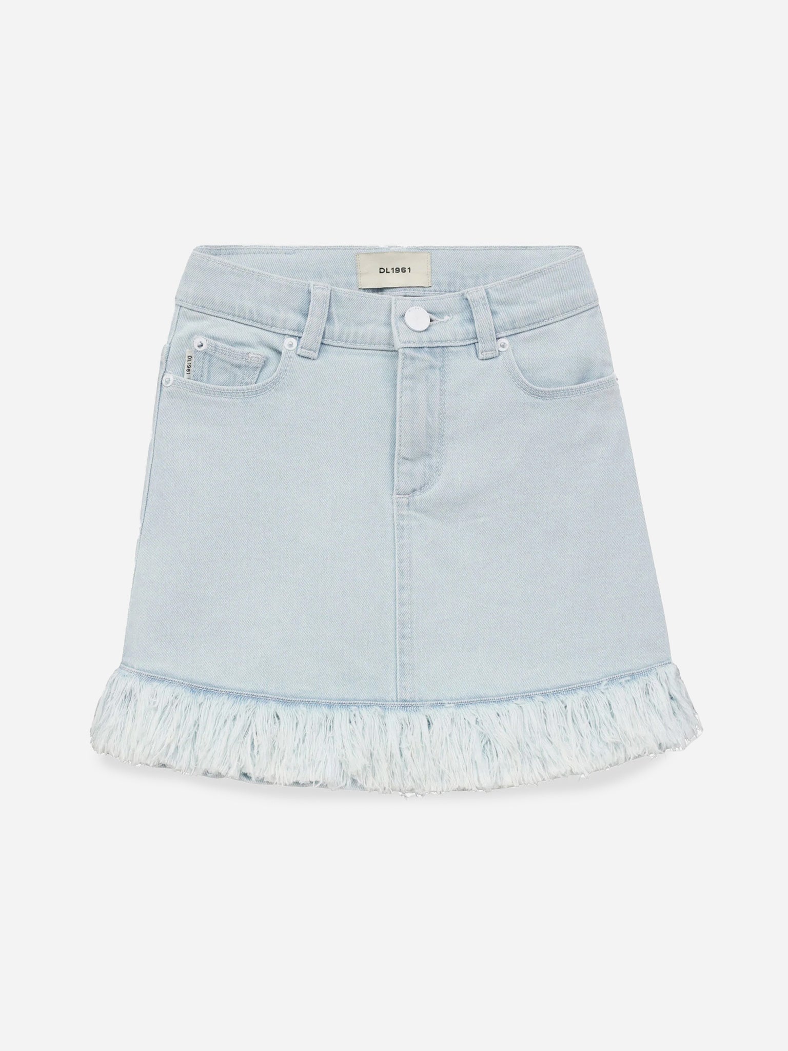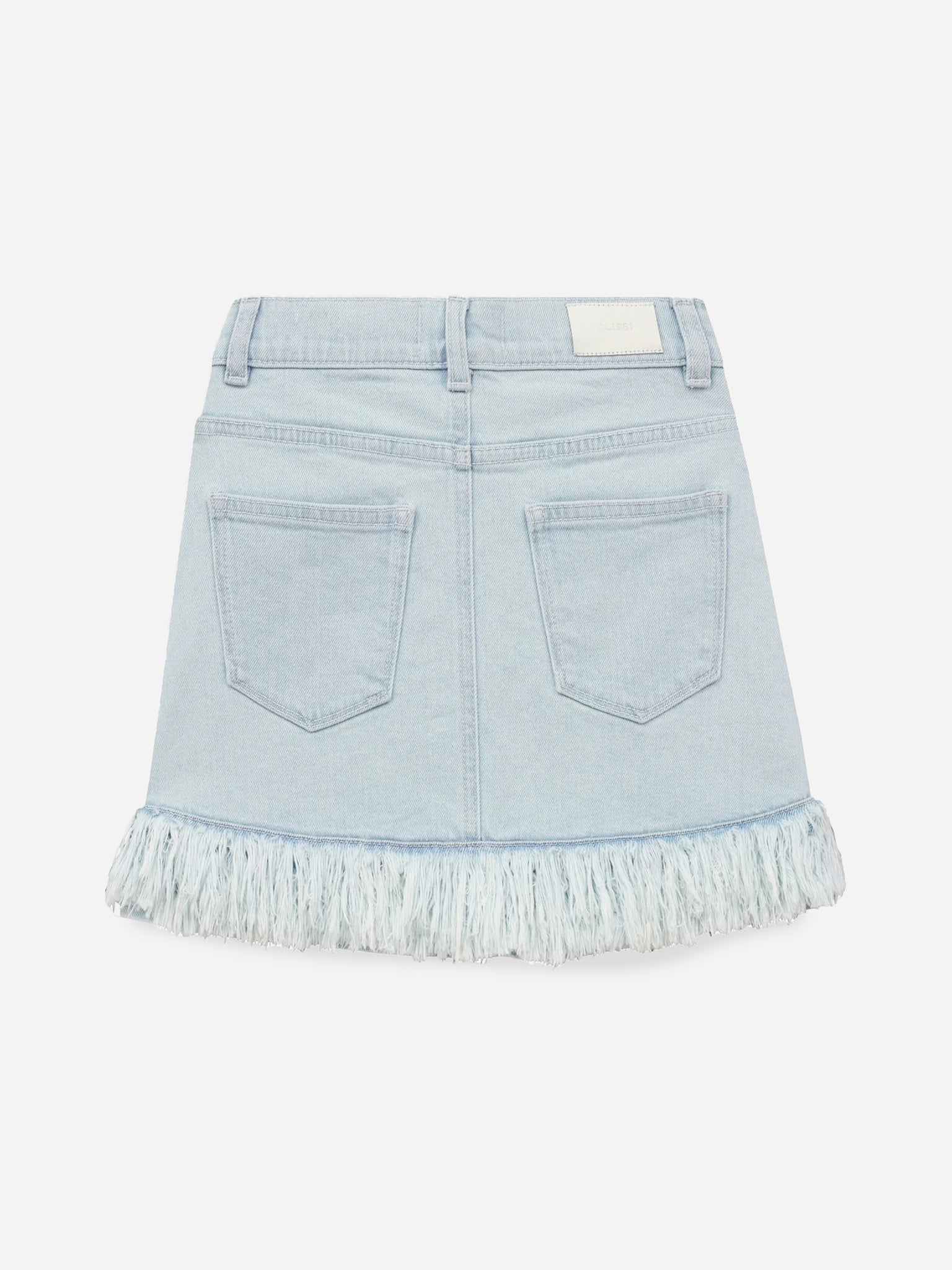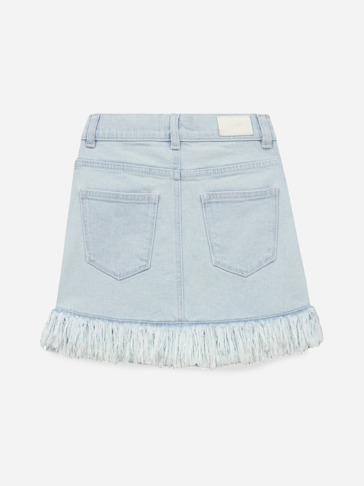 A trendy mini skirt in ultra-light wash denim with a shaggy fringe hem.