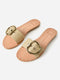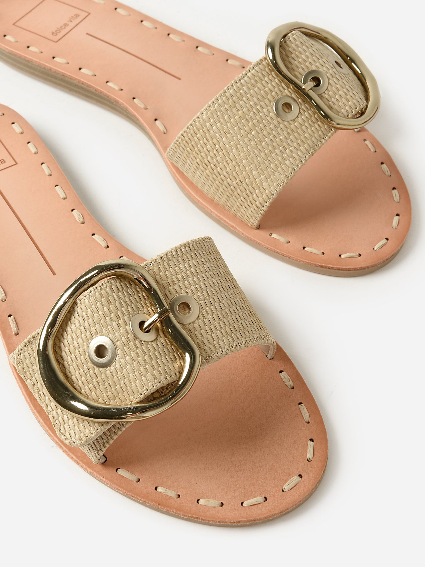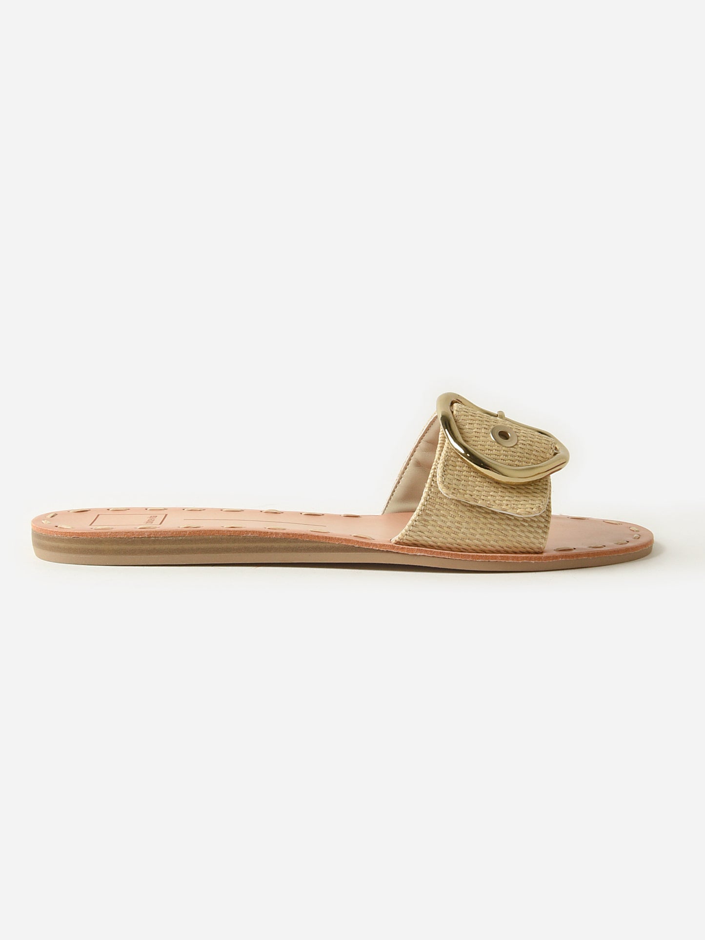 A chic slide sandal with a raffia strap and asymmetrical metal buckle.
