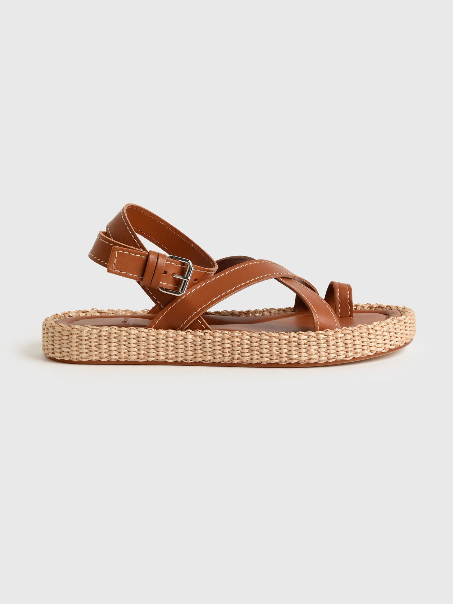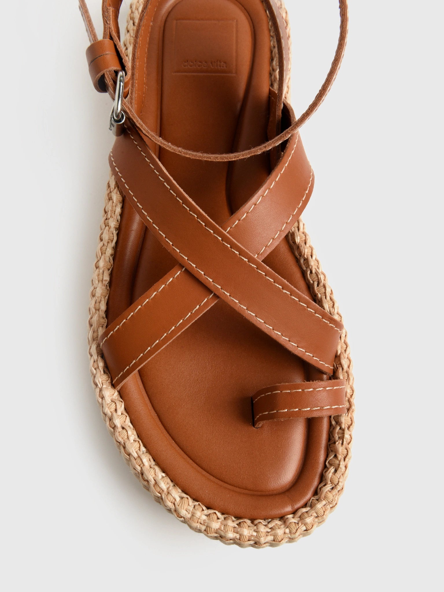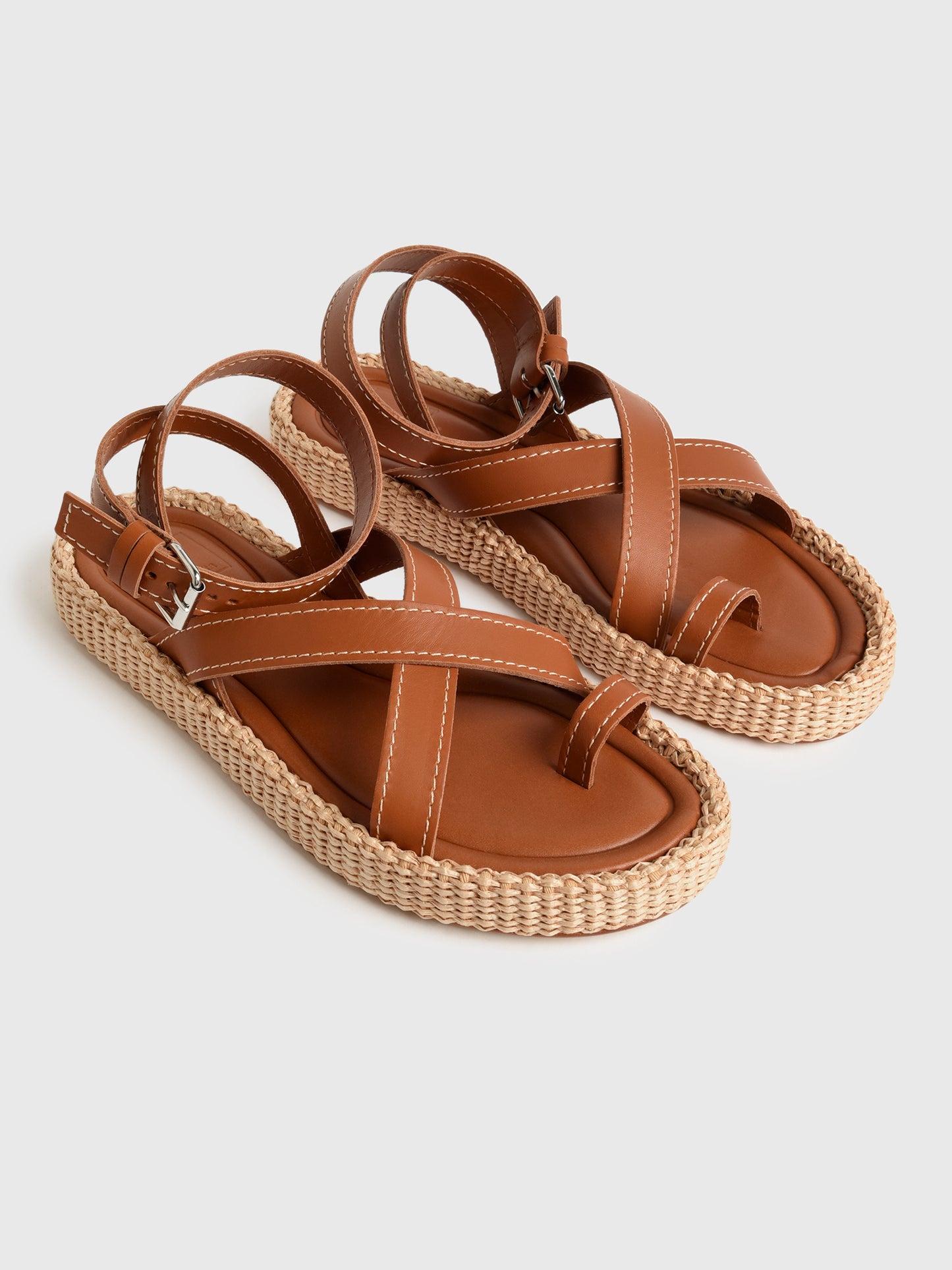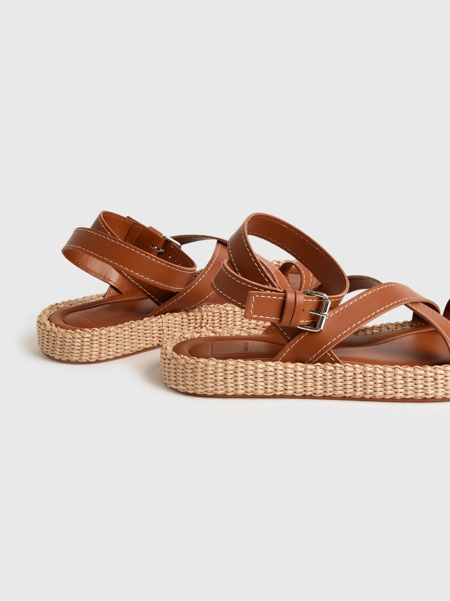 This functional sandal features thick criss-cross straps, an ankle buckle, and a textured platform sole.