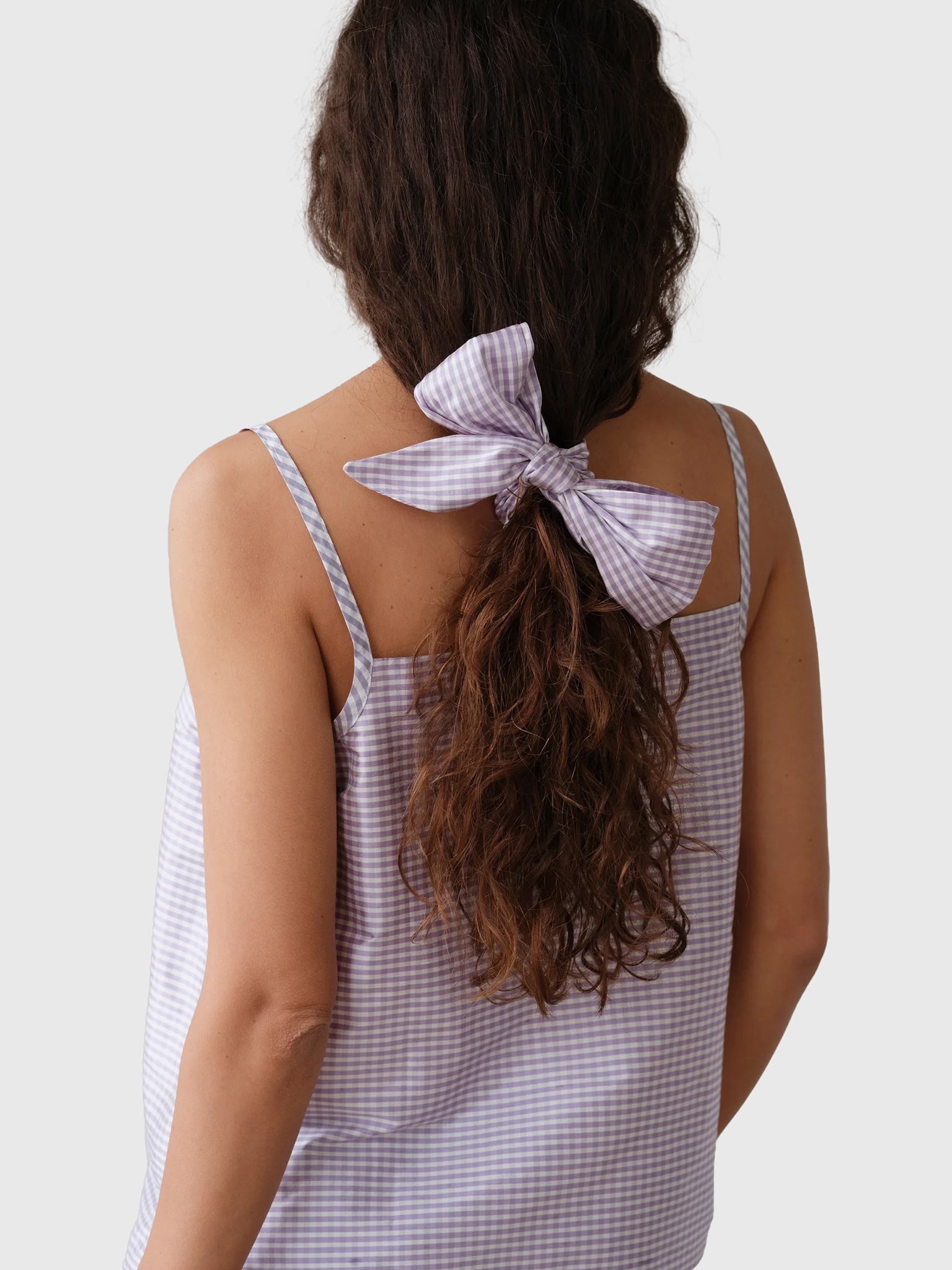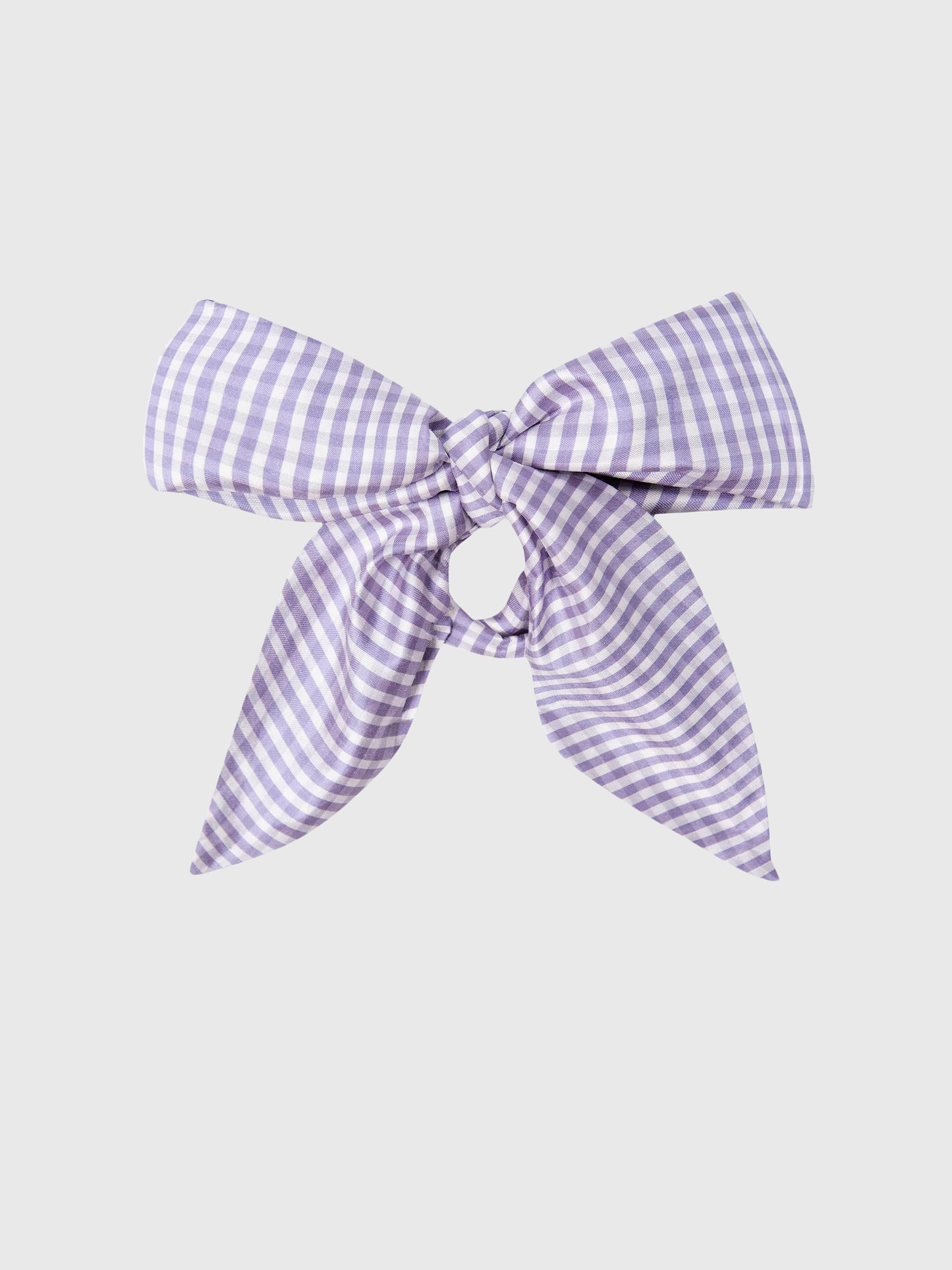 A light purple gingham bow made from soft silk taffeta.