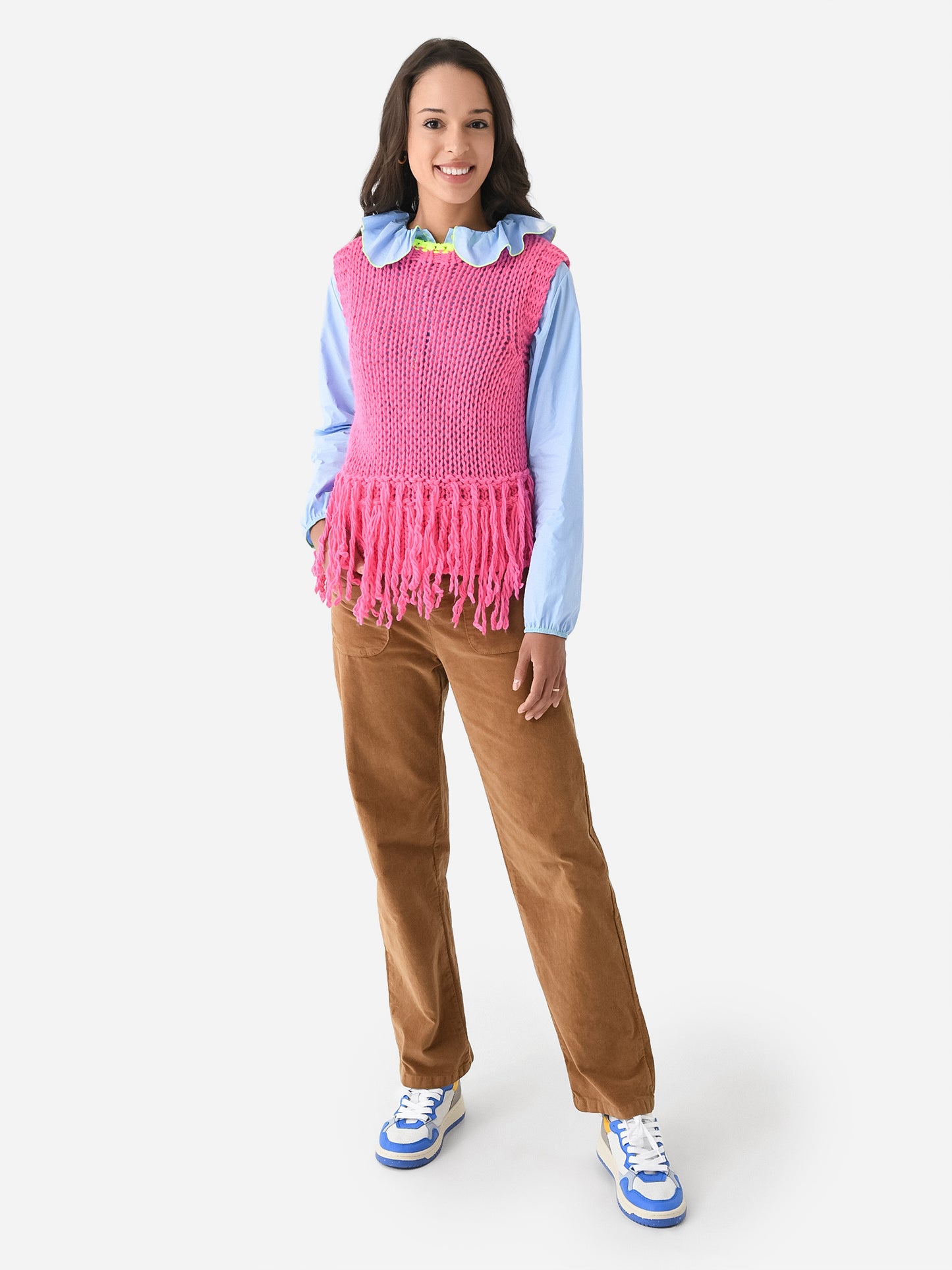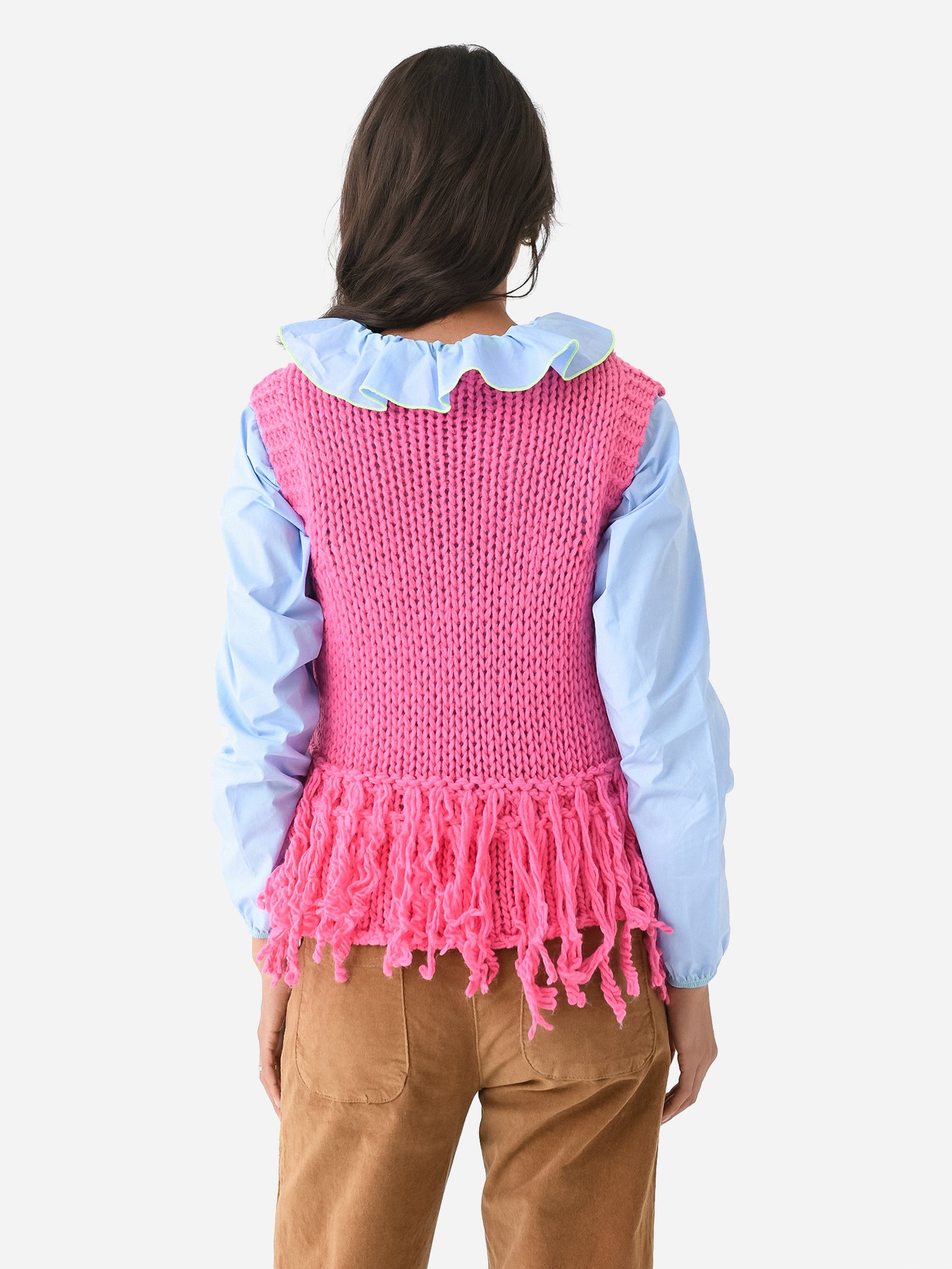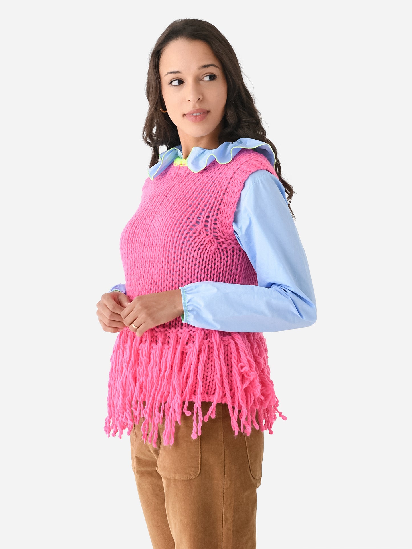 Chunky knit sweater vest with a fringe hem and contrast neckline.