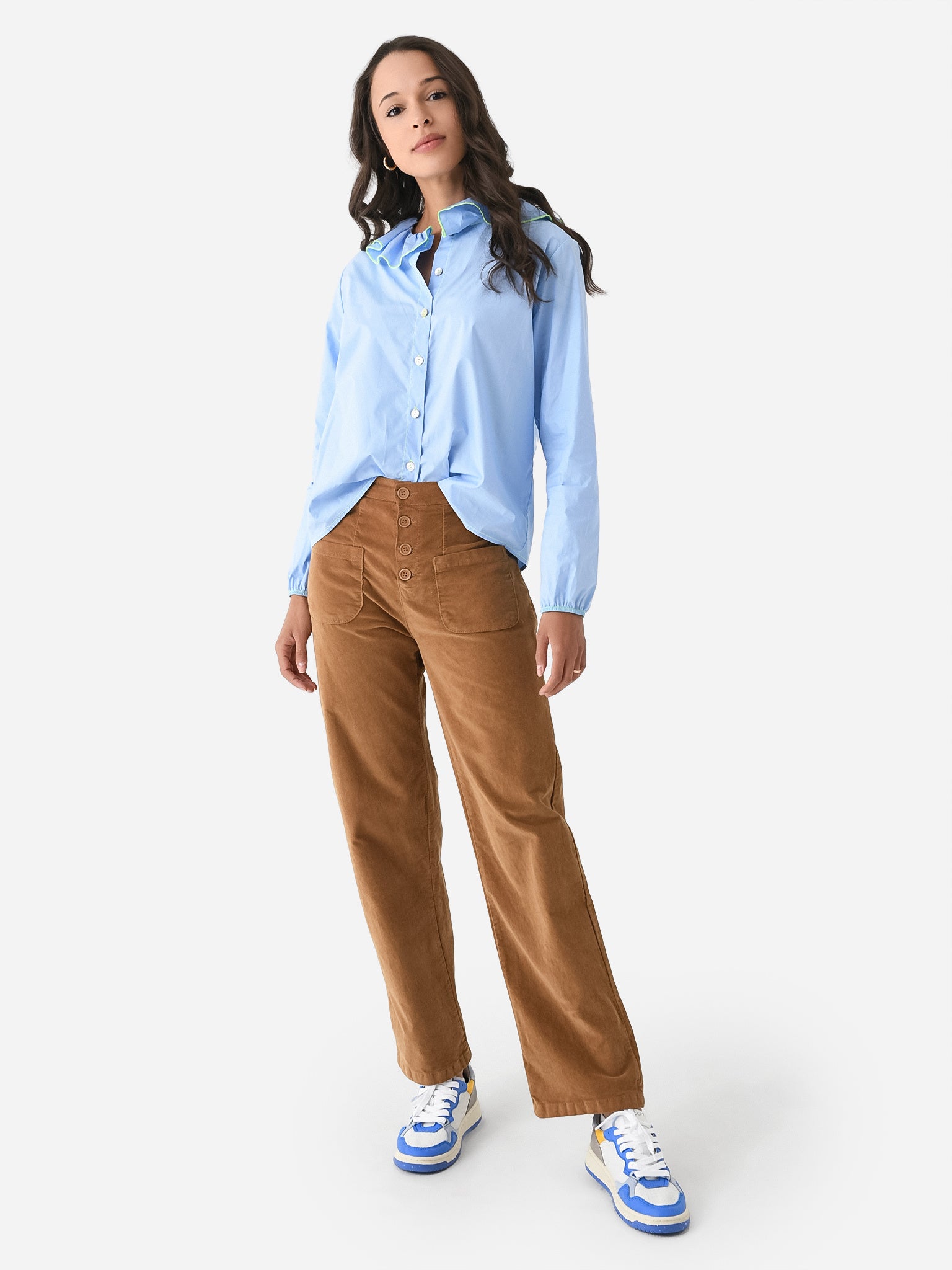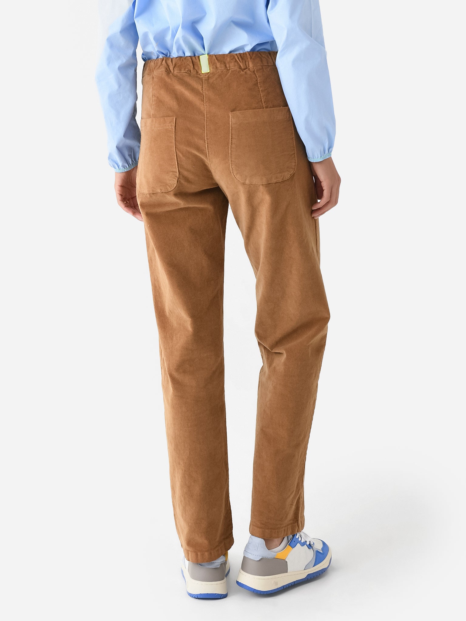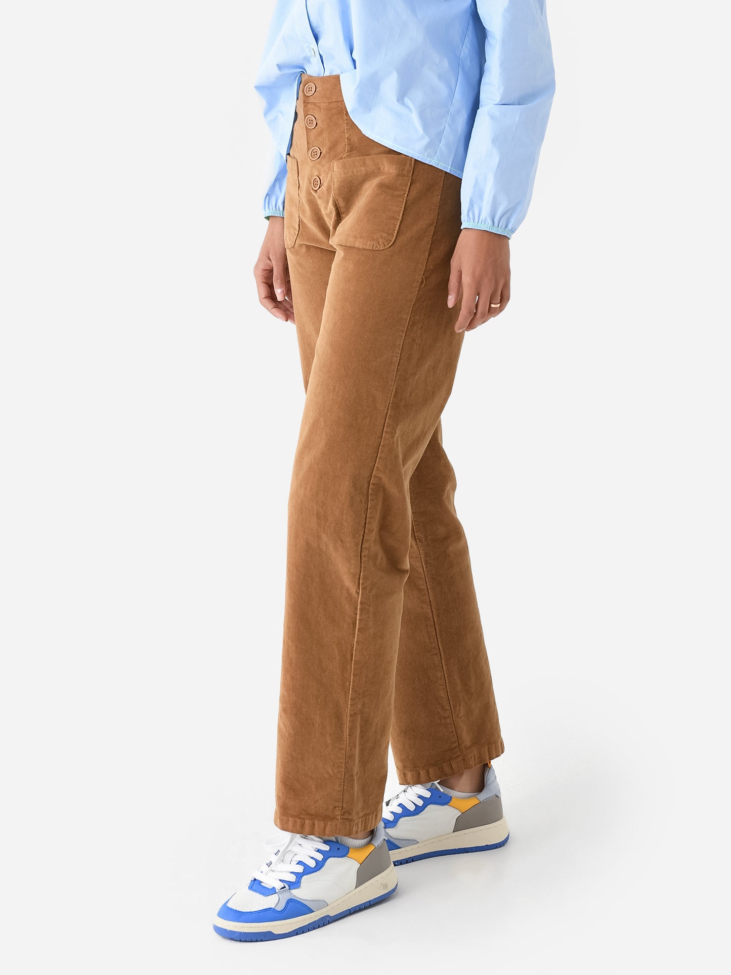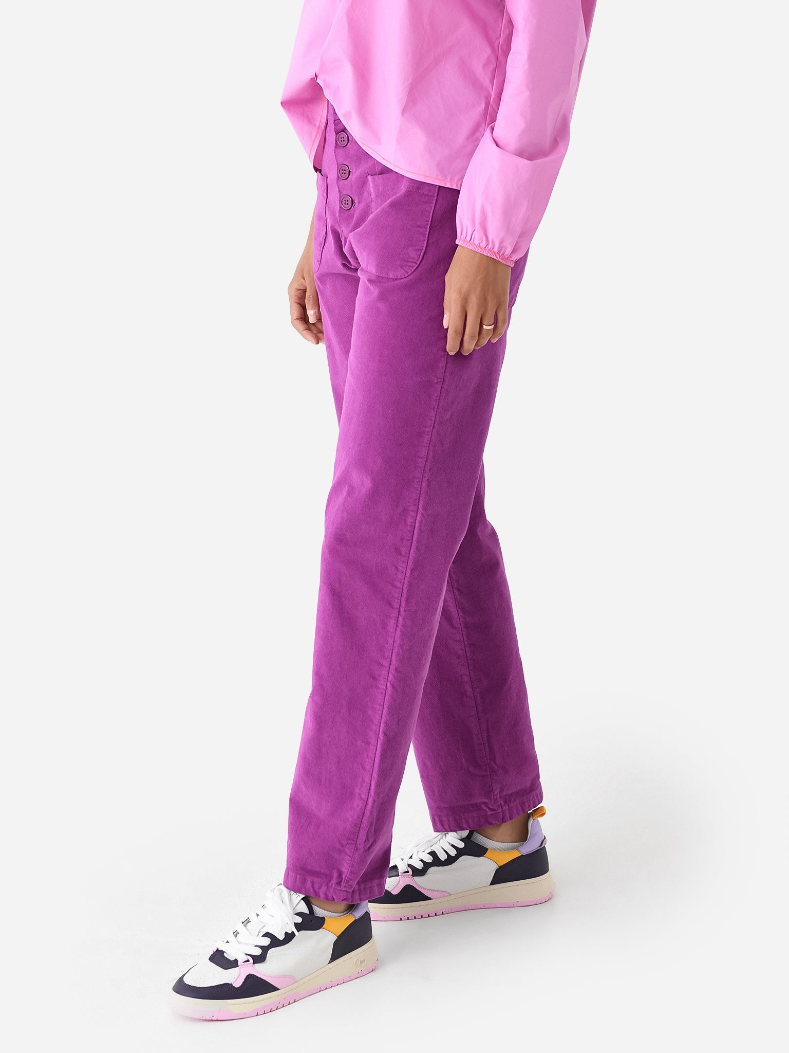 Straight leg pant made from soft velvet with a button-fly closure and four-pocket styling.
