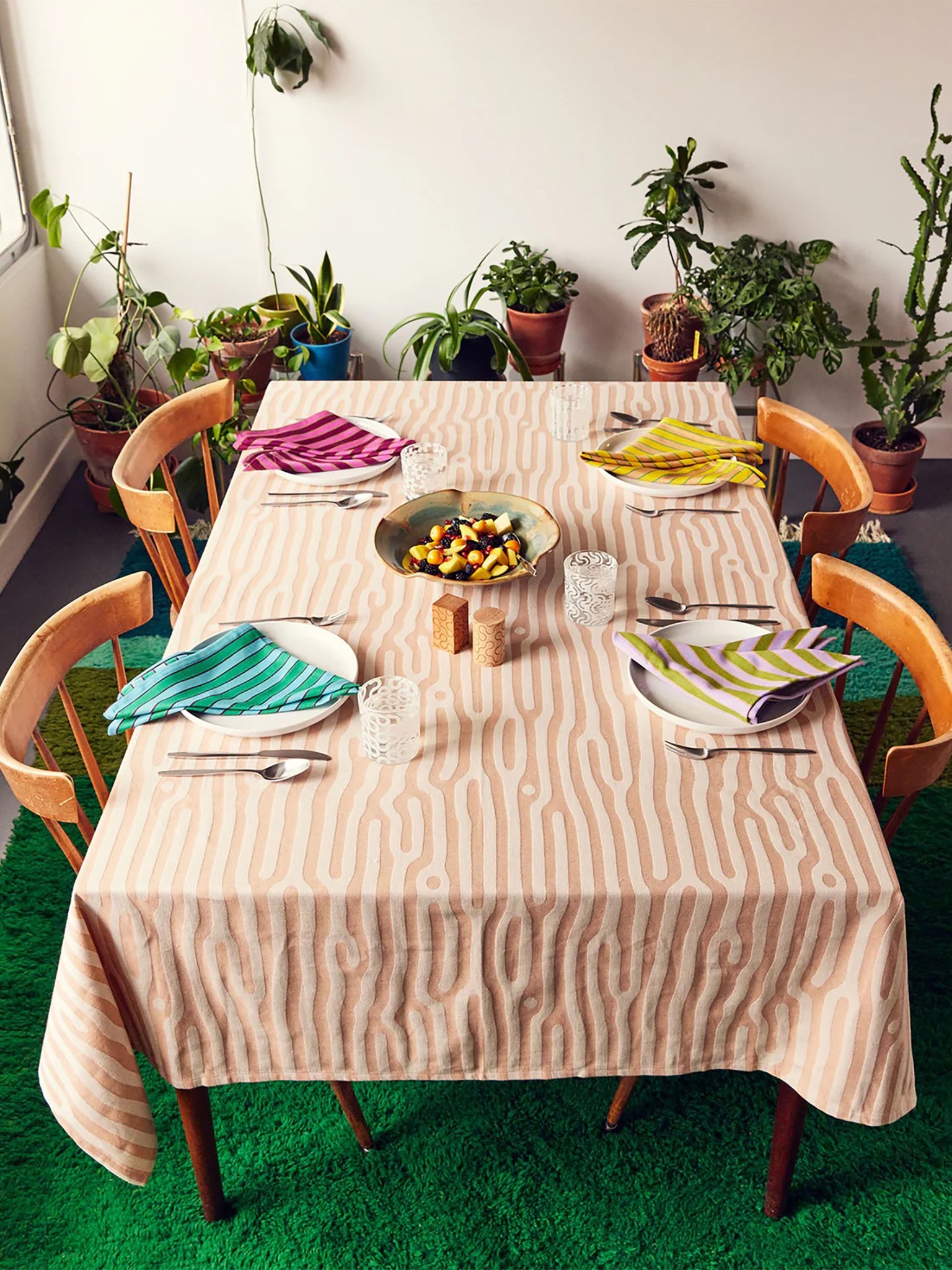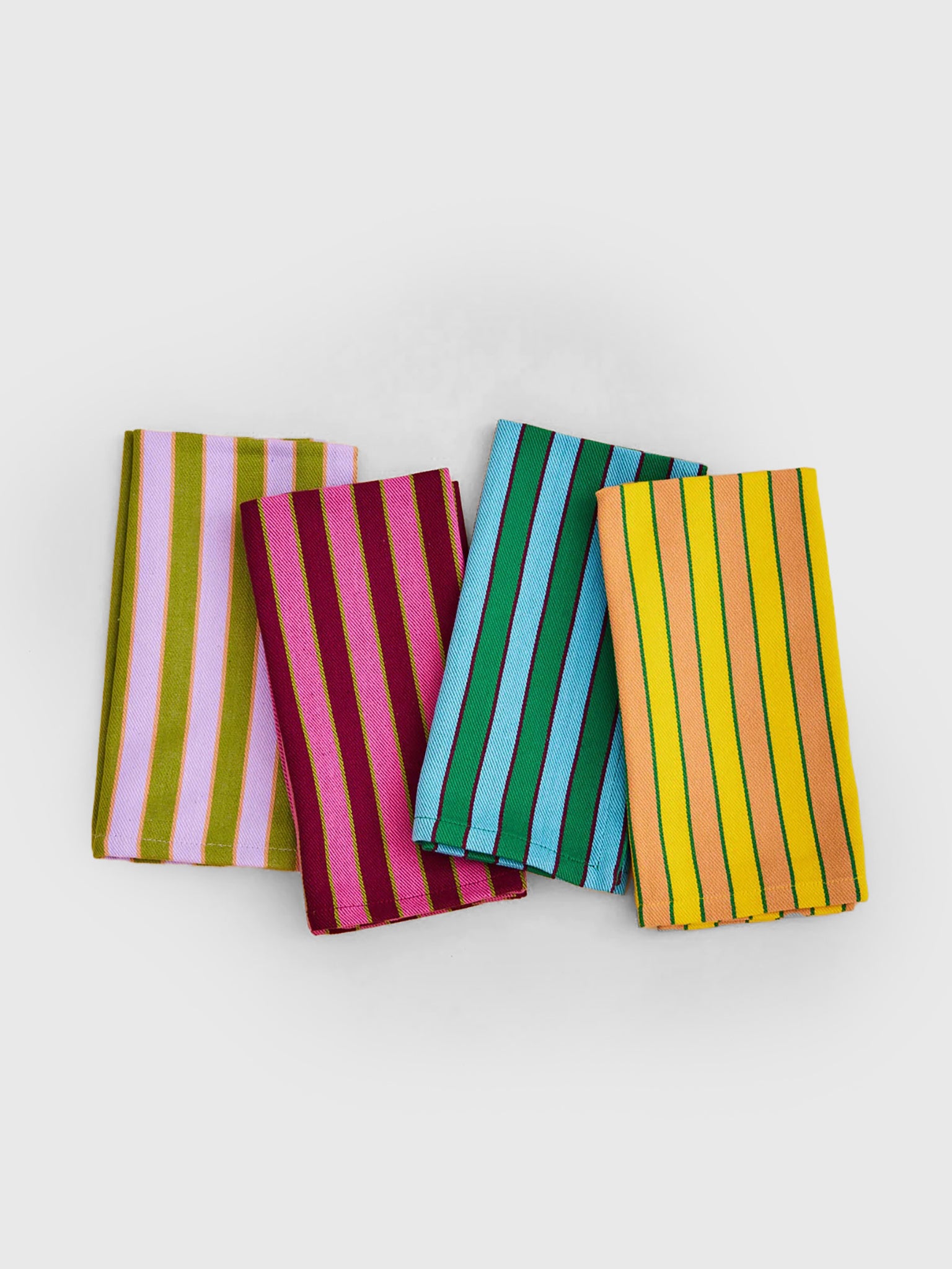 A set of four multi-colored striped napkins made from woven cotton twill.