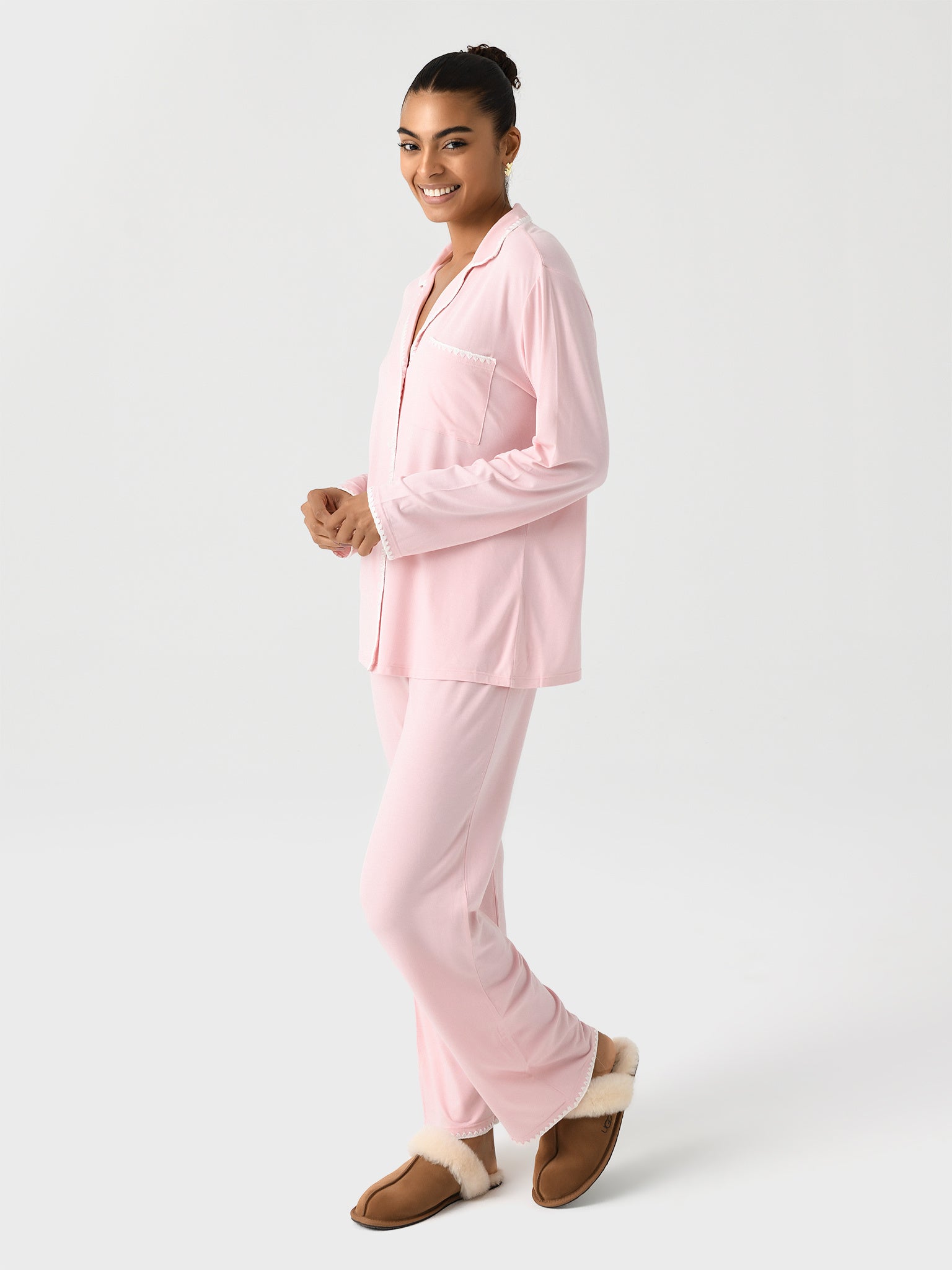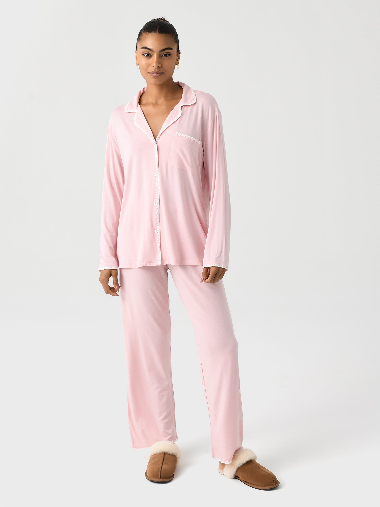 An incredibly soft pajama top and pant set featuring unique whipstitch trims.