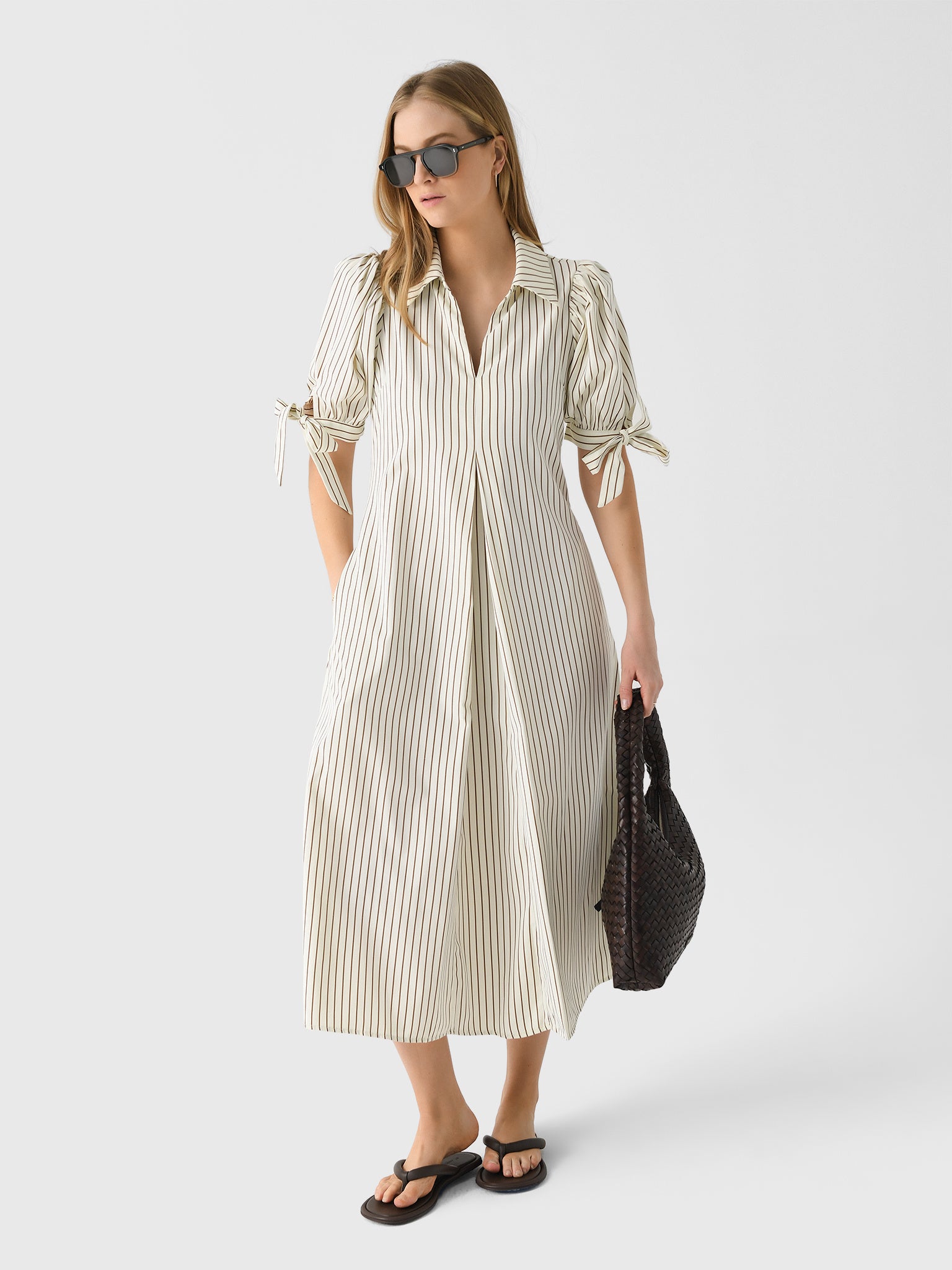 This long dress features a loose, comfortable design with puff sleeves, self-tie cuffs, and a front pleated detail.