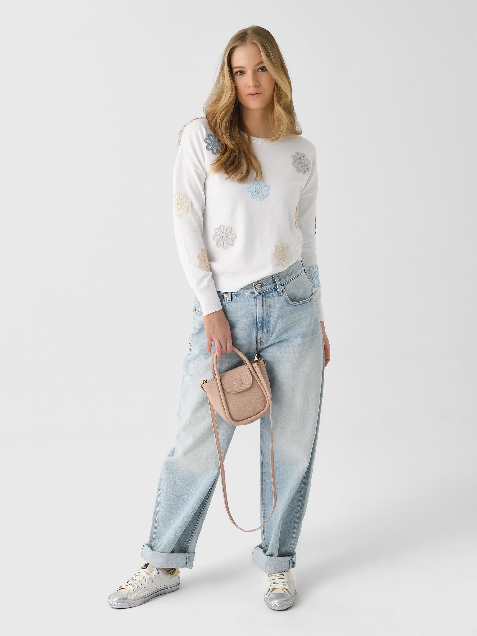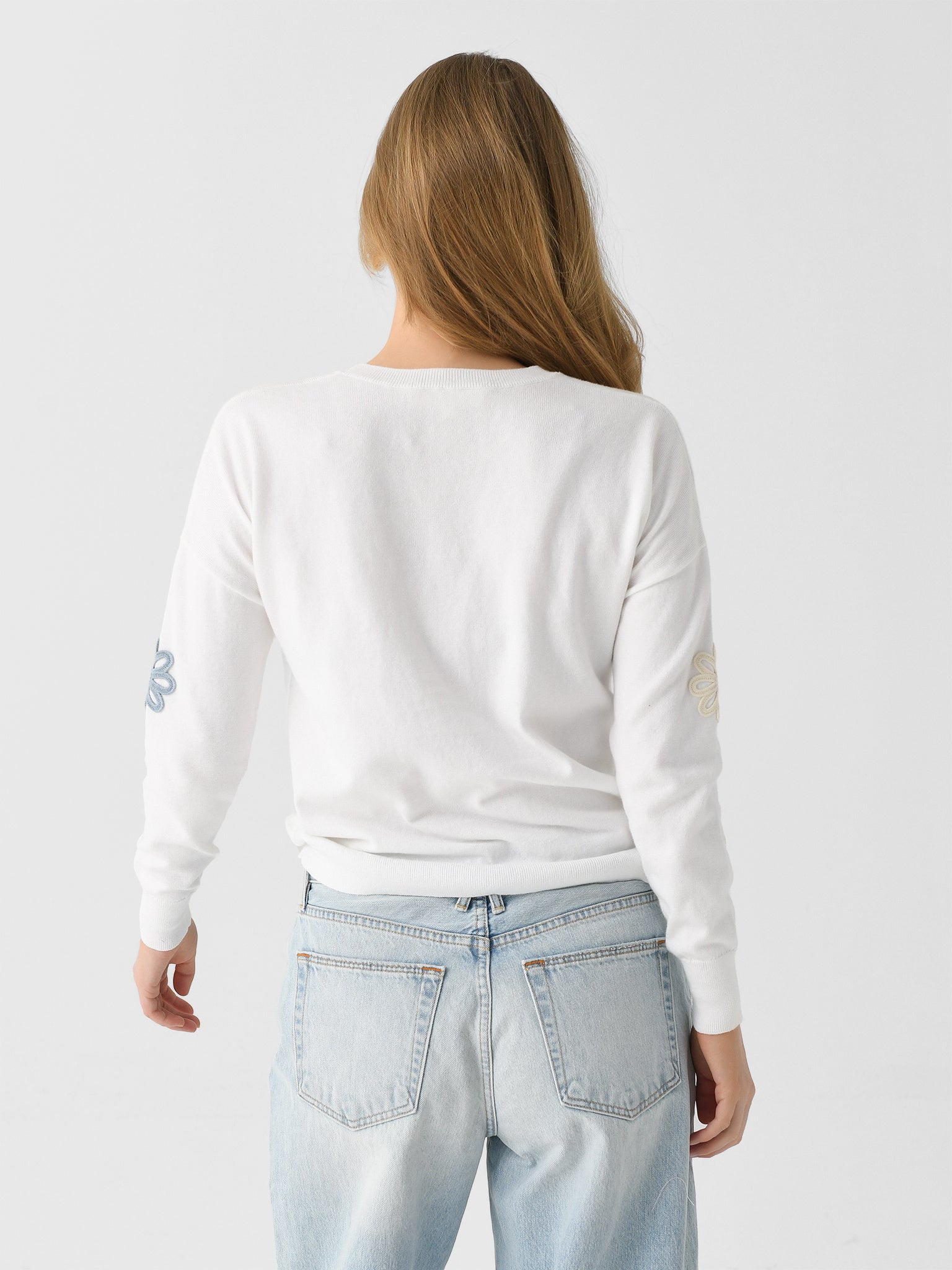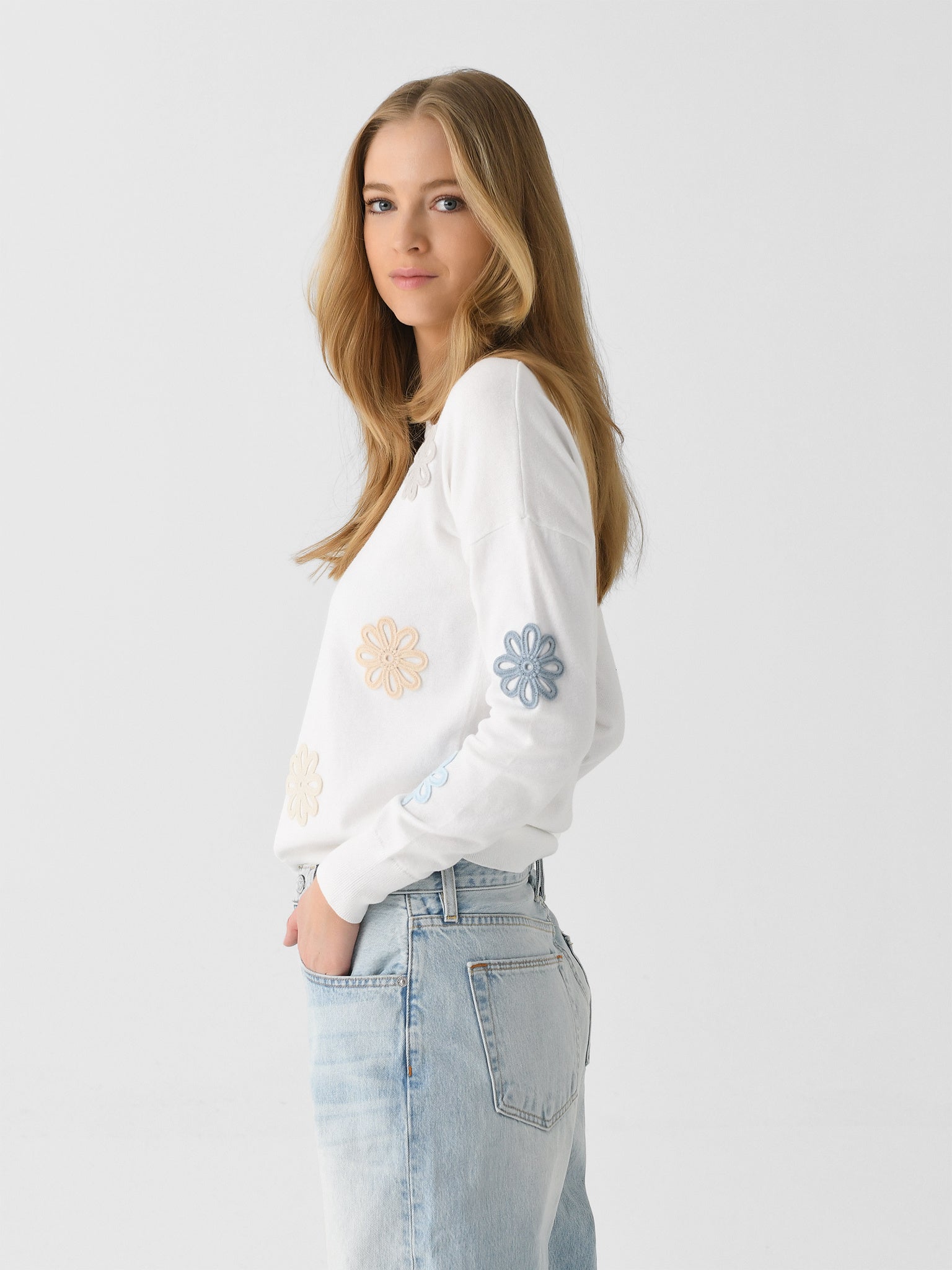 This lightweight crewneck sweater is made from soft cotton and features muted pastel floral appliqués.