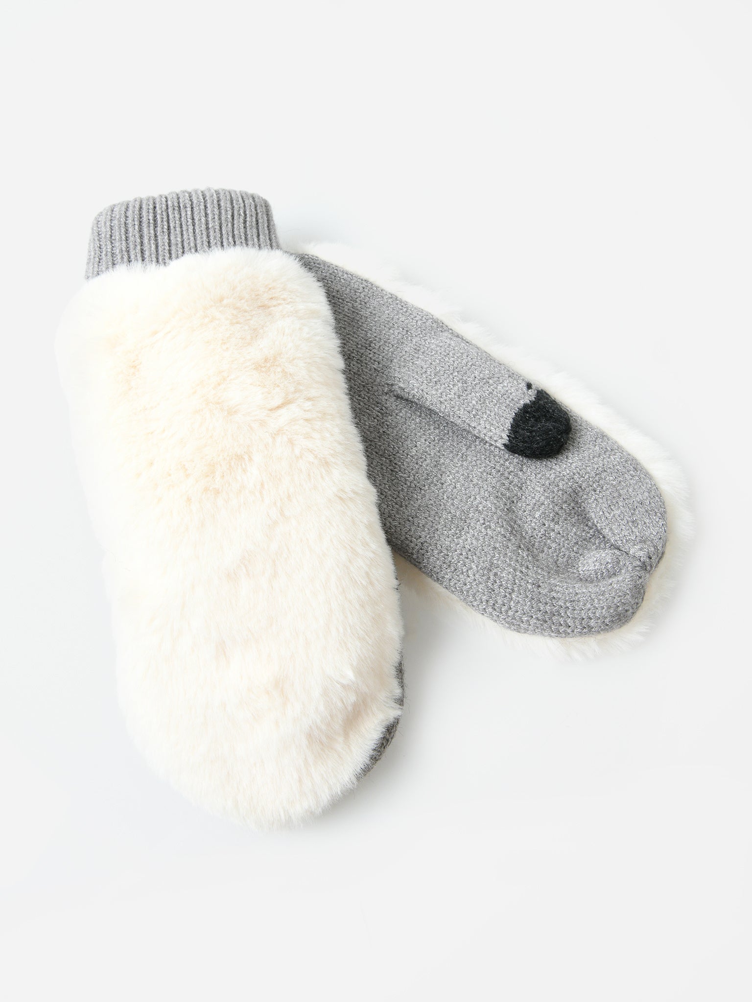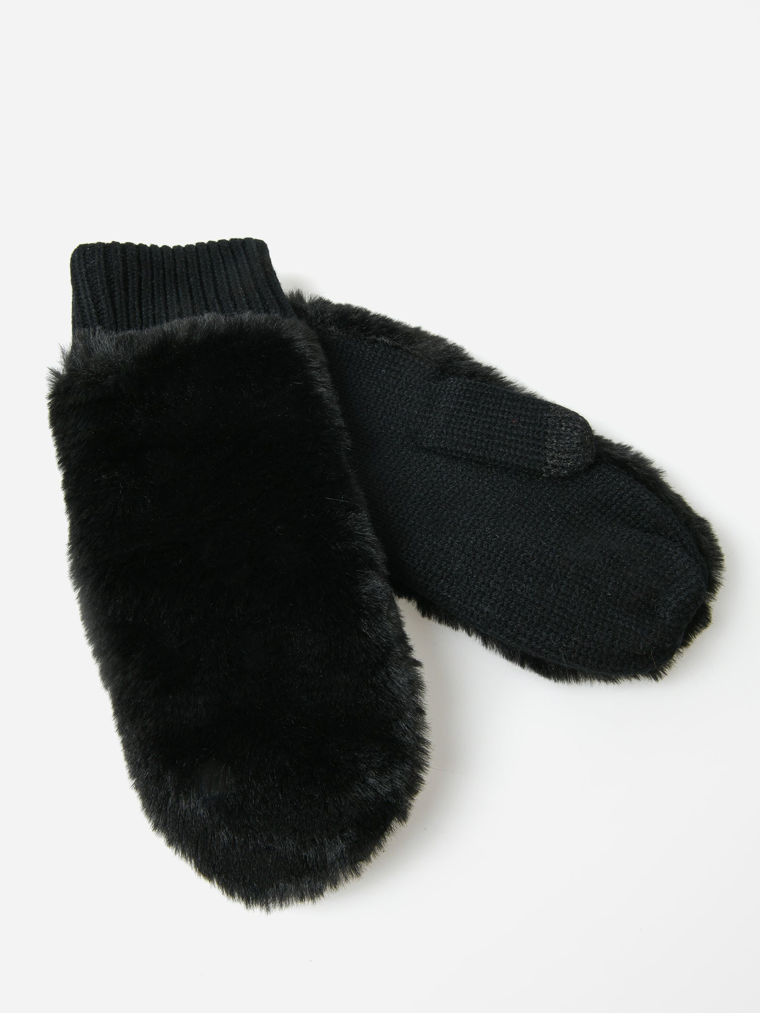 A pair of faux fur mittens with a contrast knit palm.