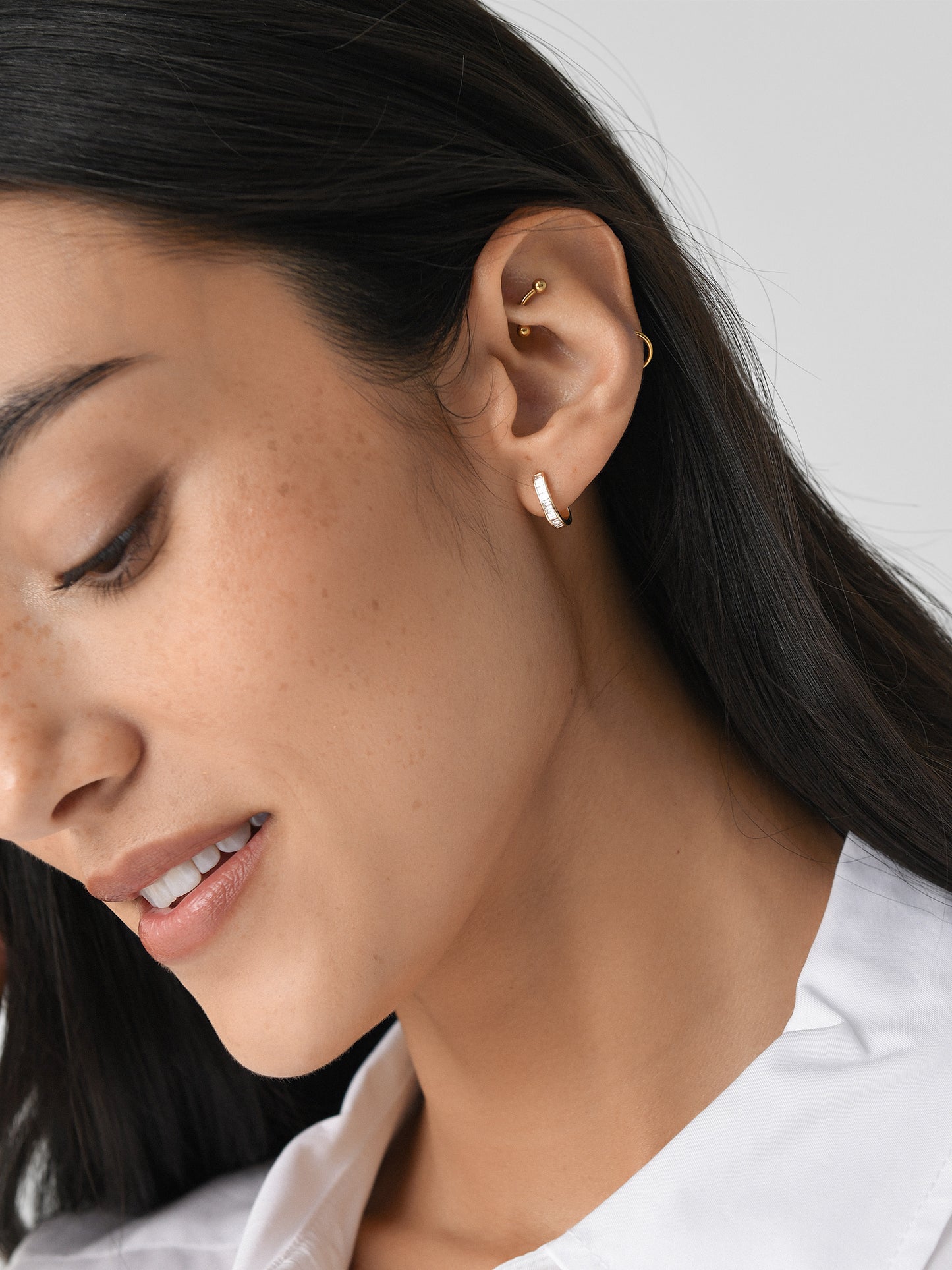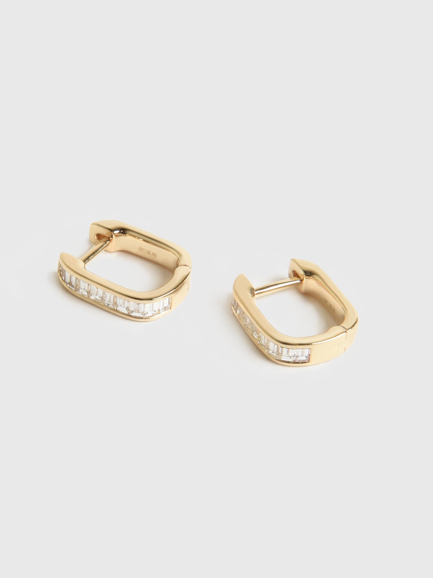 These 14-karat yellow gold huggie earrings feature sparkling baguette-cut diamonds.