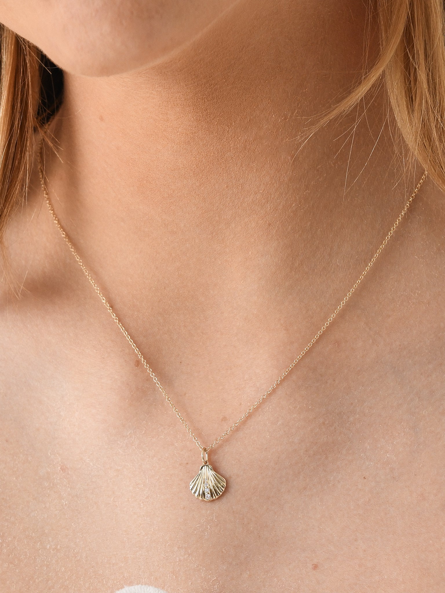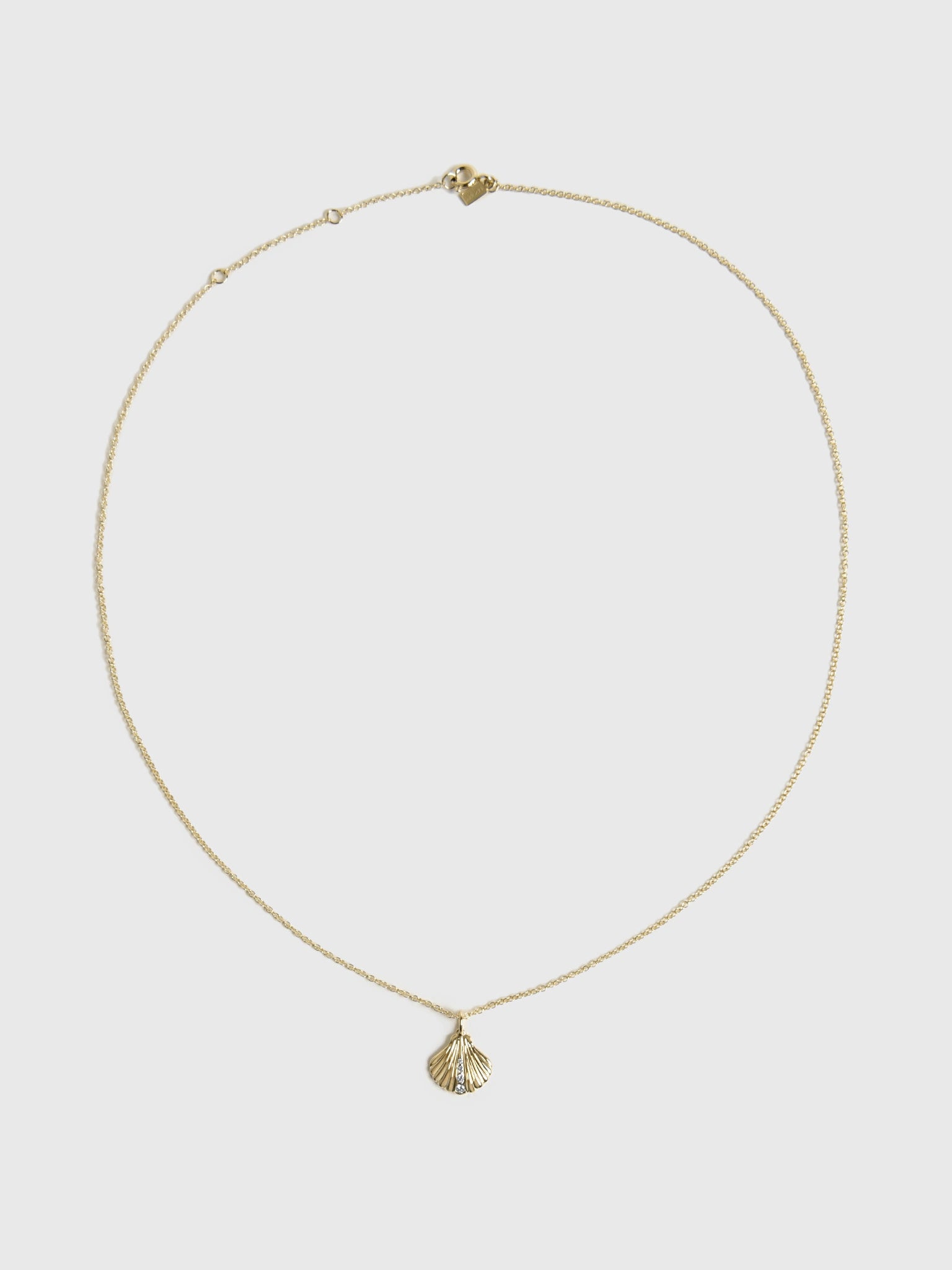 A 14-karat yellow gold necklace with a diamond-embellished shell pendant.