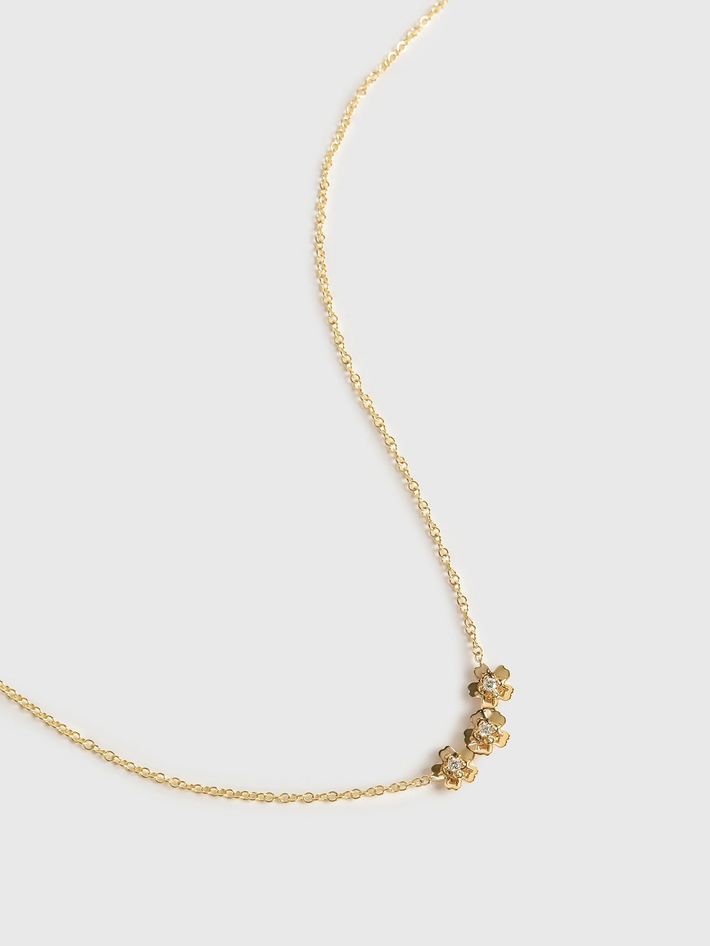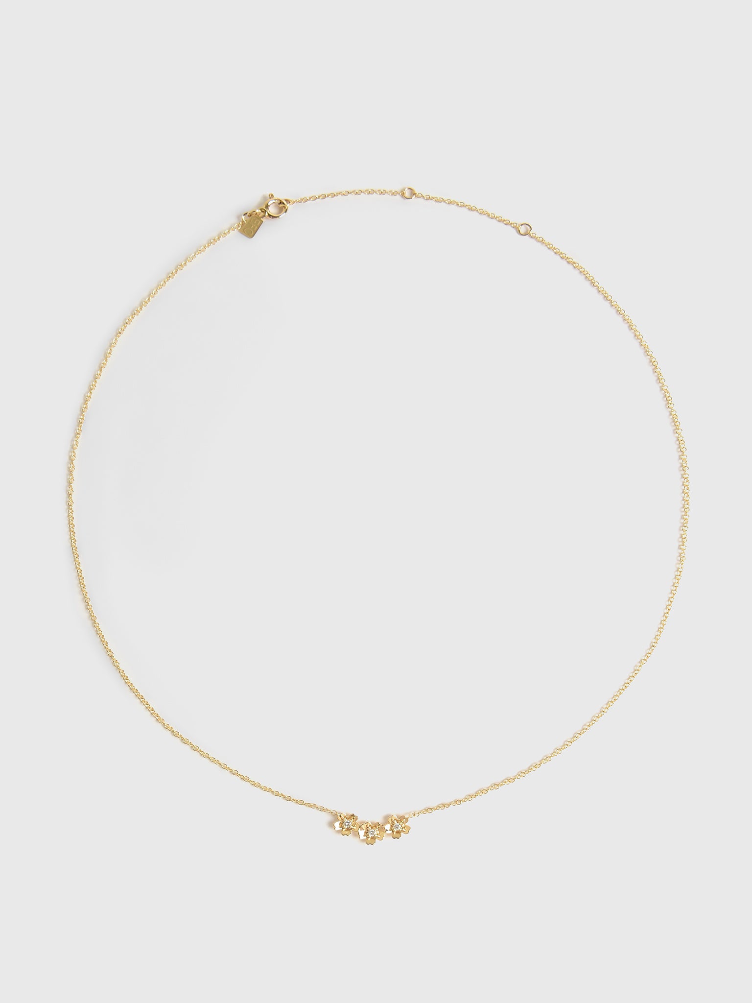 This spring-ready necklace is made from 14-karat yellow gold and features a triple cherry blossom design with sparkling diamond centers.