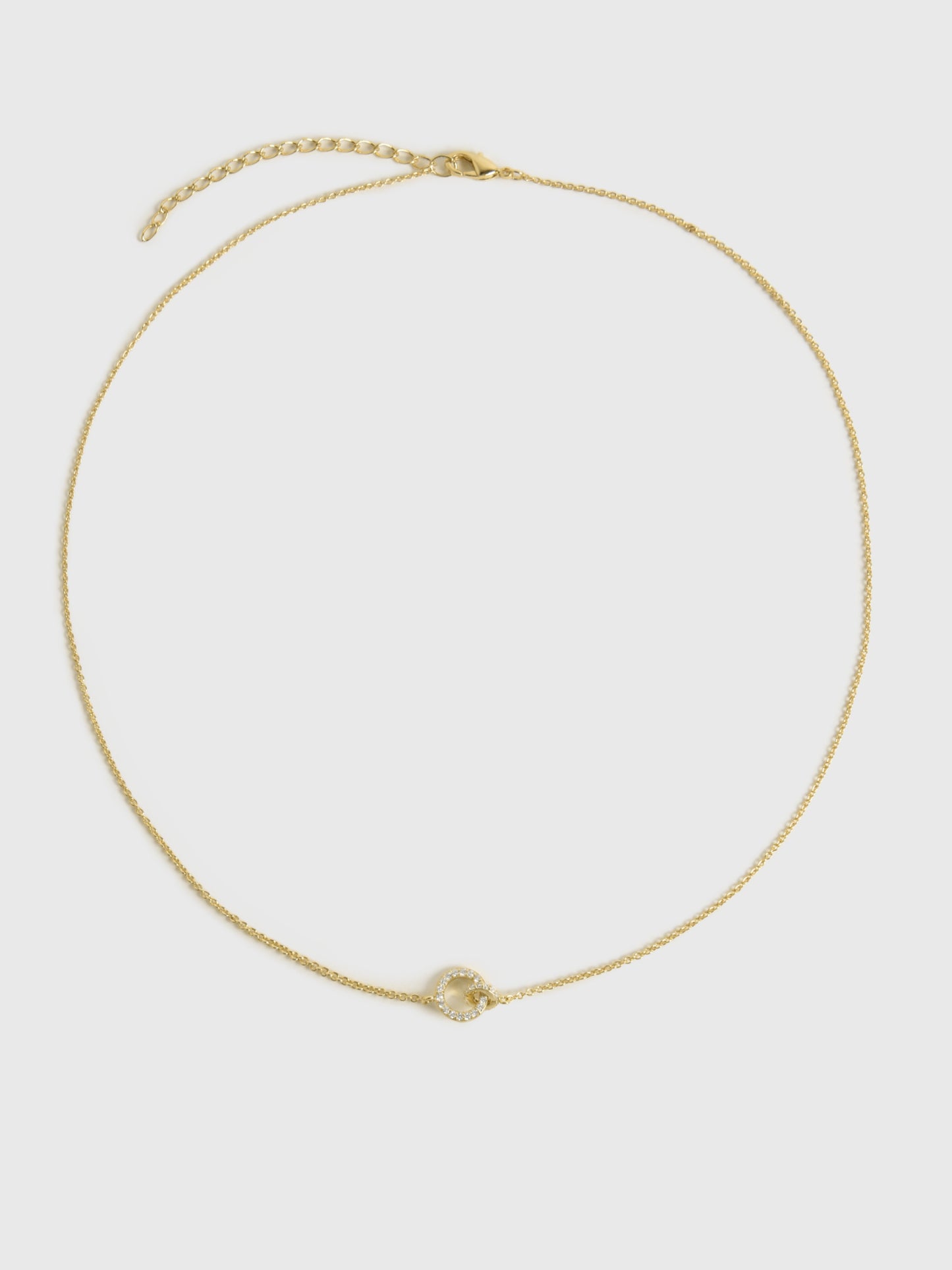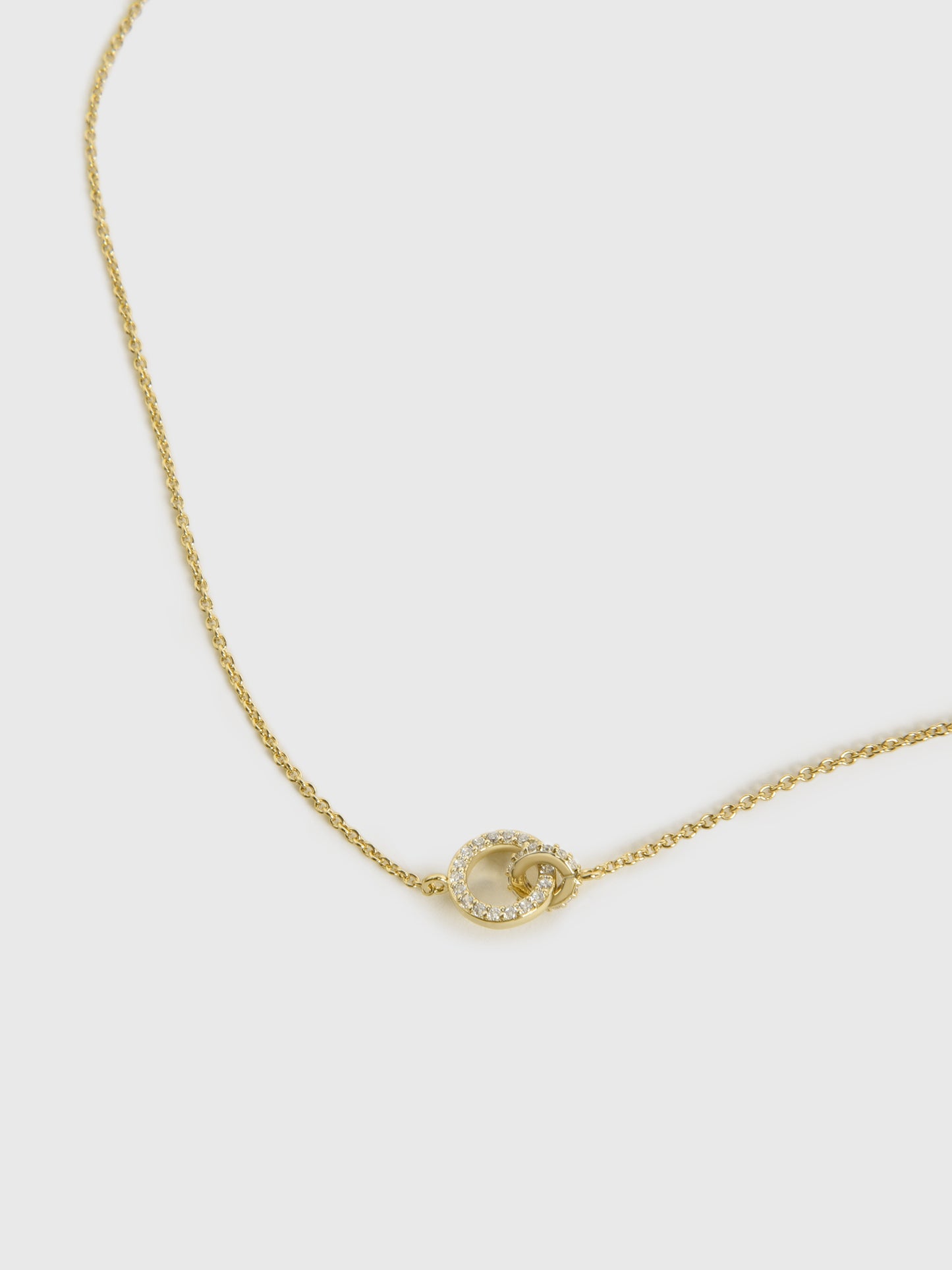 A 14-karat gold-plated necklace featuring dainty interlocking rings embellished with pavé crystals.
