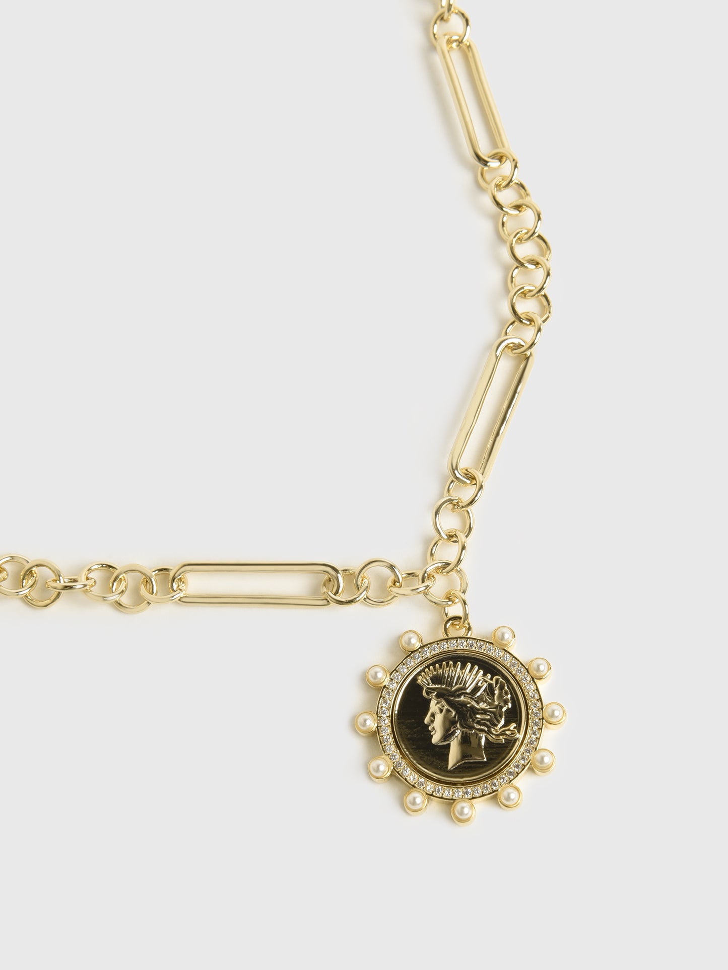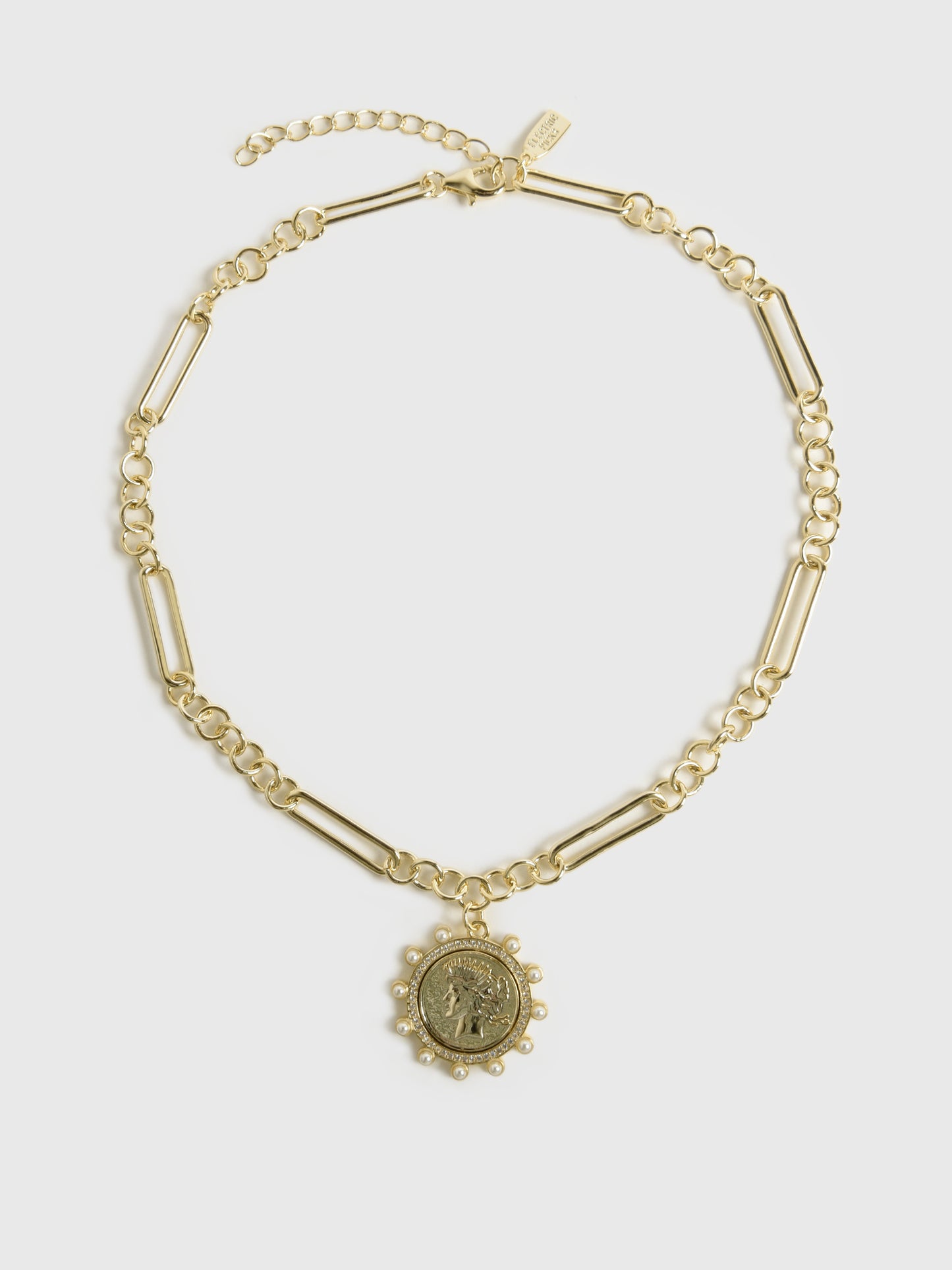 A 14-karat gold-plated brass necklace featuring a spartan pendant surrounded by pavé crystals and pearls.