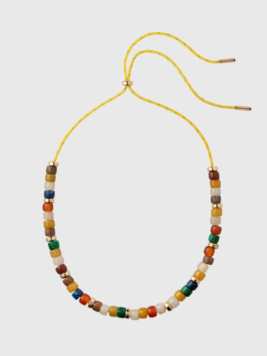 The Pia Necklace is the vibrant, gemstone-filled strand you'll want to wear daily. Hand-strung with a warm, earthy mix of yellow jade, malachite, quartz, carnelian, and lapis lazuli, and accented by 18-karat gold-plated rondelles. Its adjustable design ensures effortless versatility, letting you style the necklace long or short to suit your look.