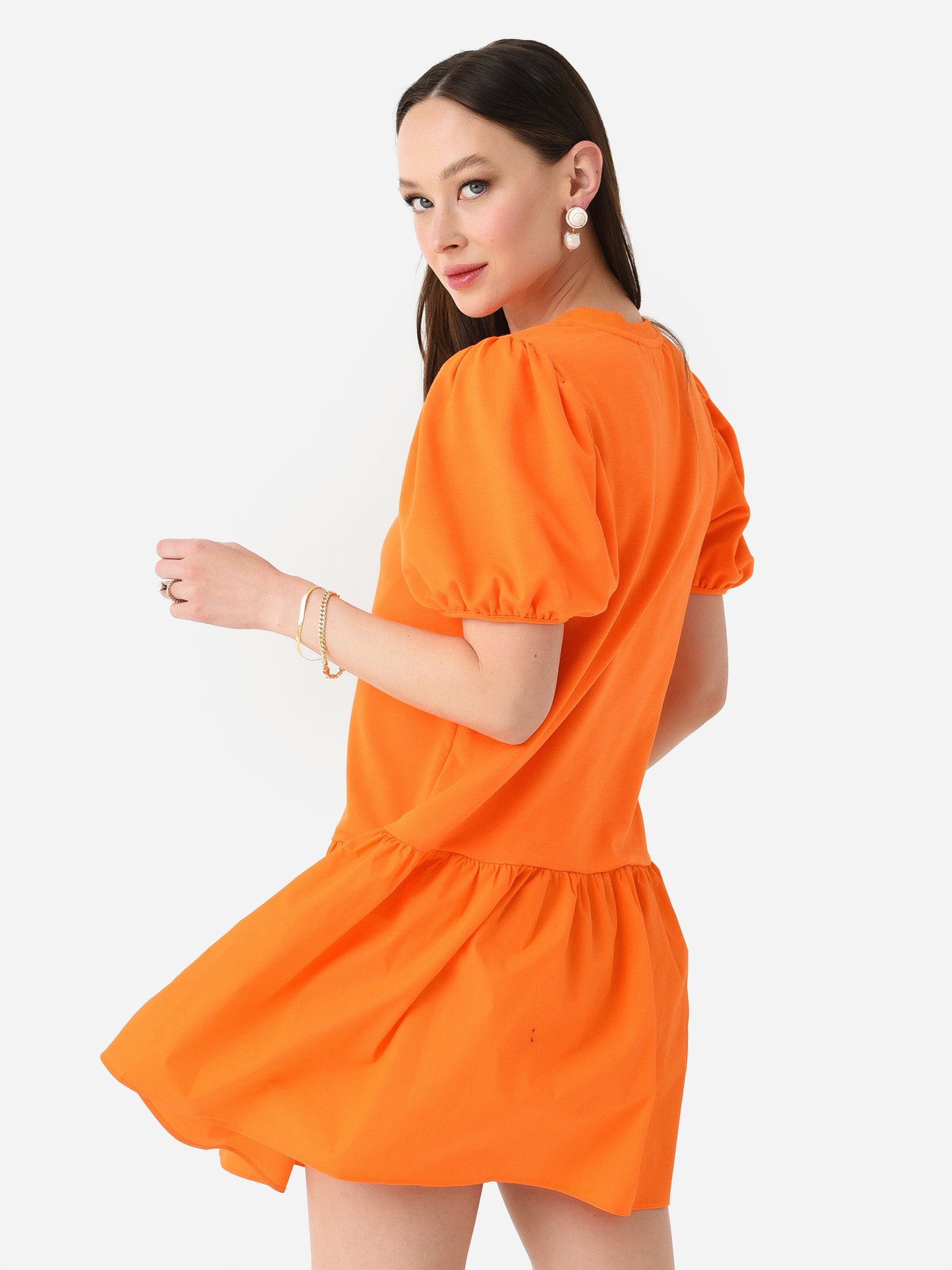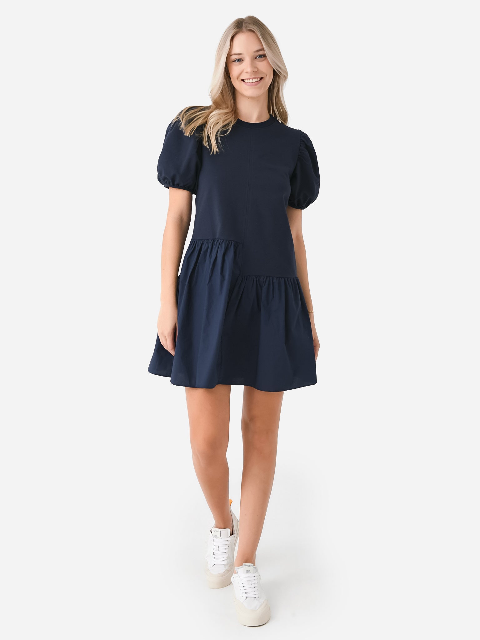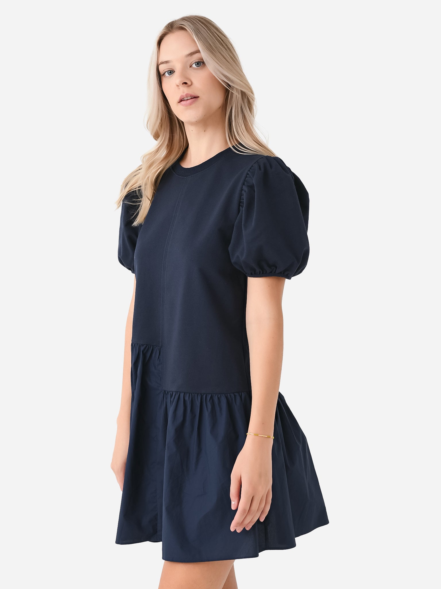 Puff sleeve mini dress with a knit bodice and flowy cotton skirt.
