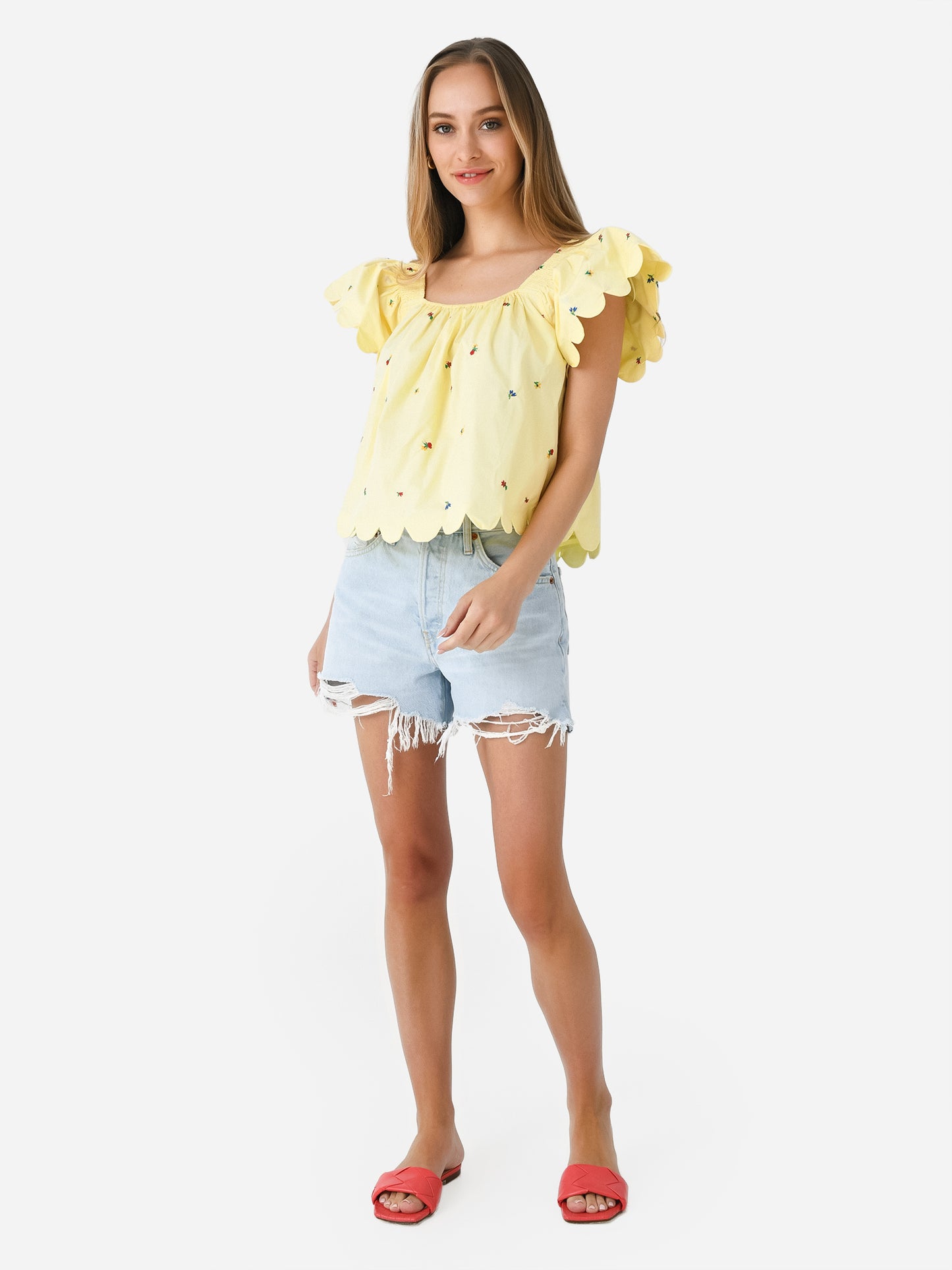 Fluttery top with an embroidered print and scalloped edges.