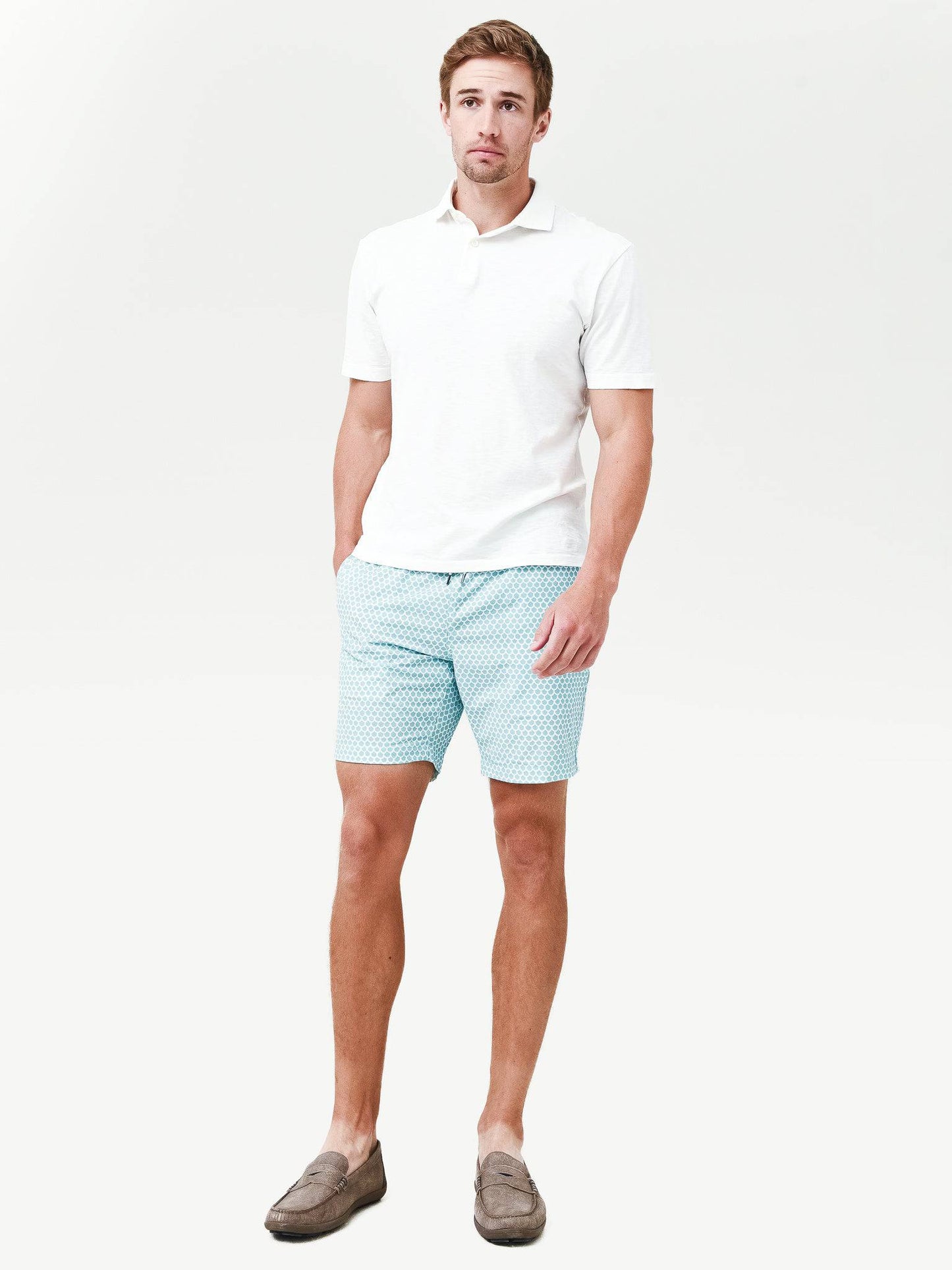 - Model is wearing size Medium swim trunk.