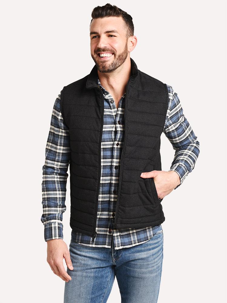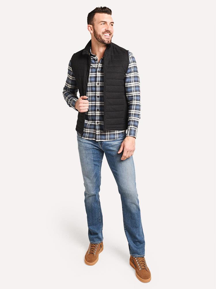 Styled with Faherty Brand shirt style # MWF1928, Citizens of Humanity jean styLe # 6108B-1147 and Veja sneaker style # QR031642. Model is wearing size Medium vest, shirt and size 32 pant.
