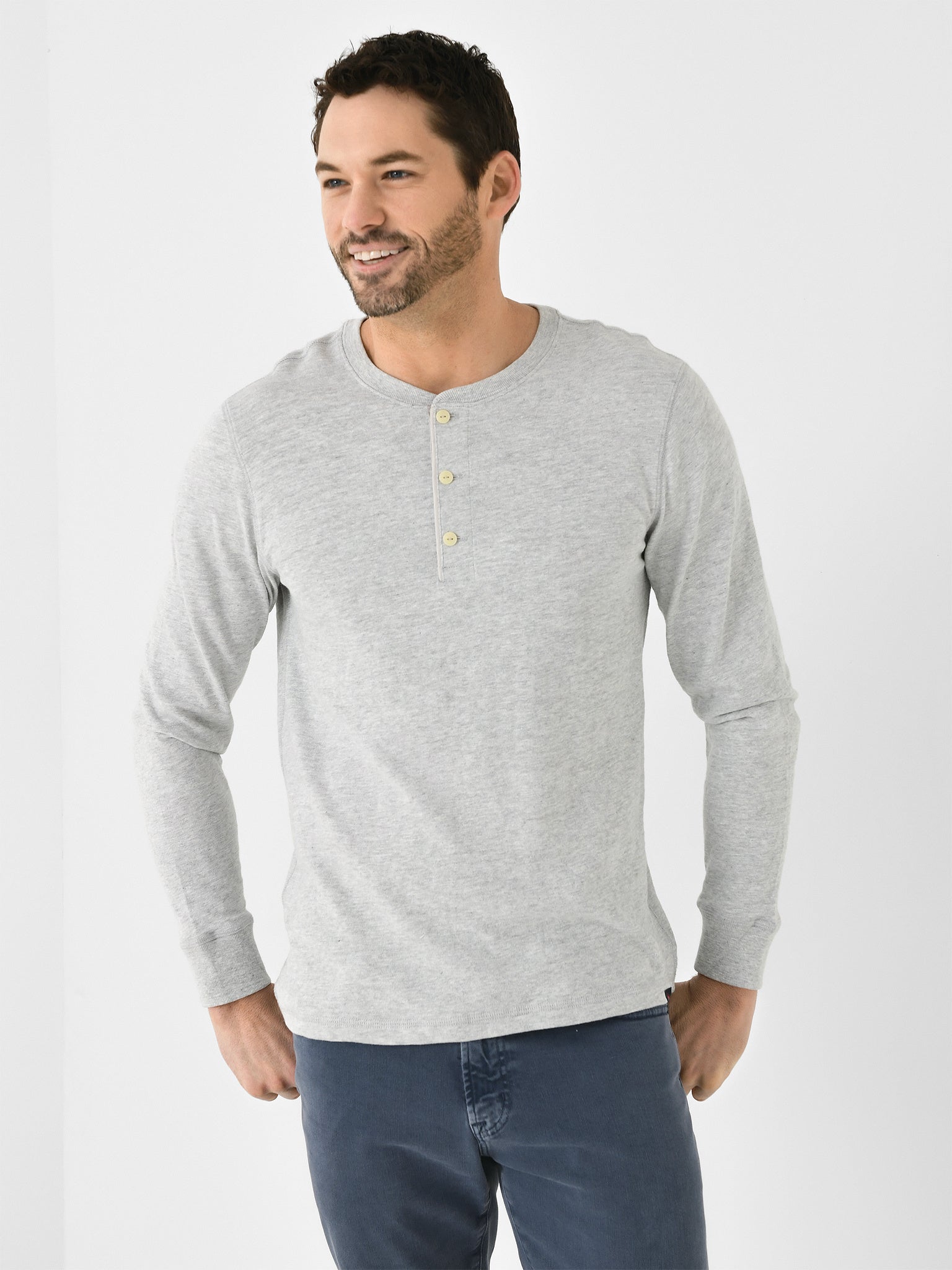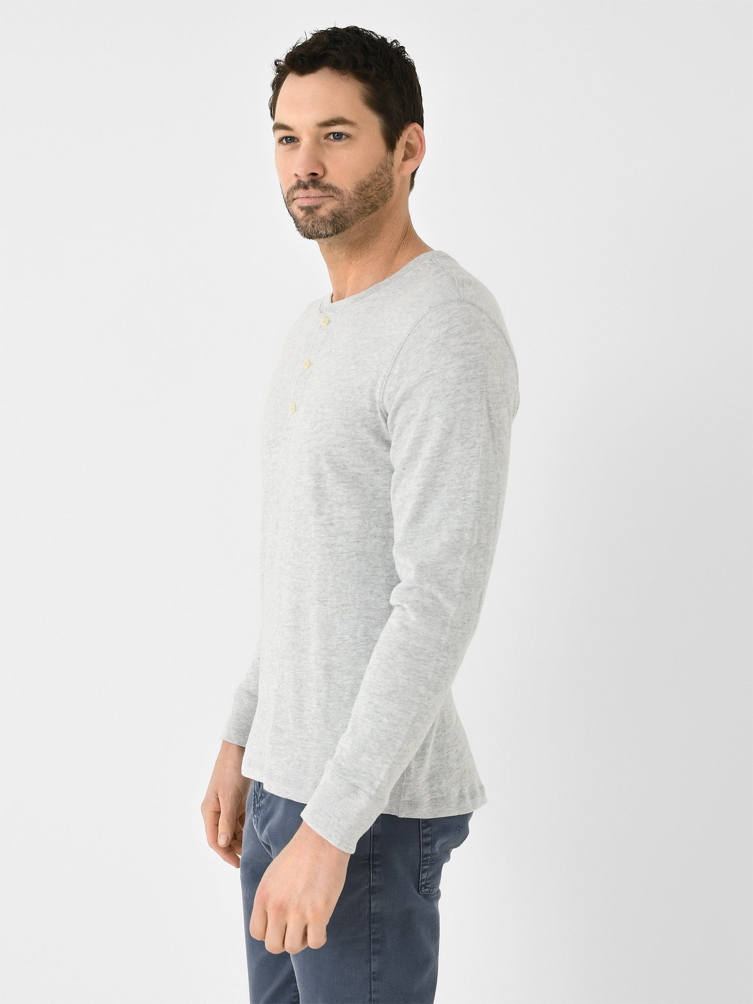 A slub-knit henley shirt made from soft, high-quality organic cotton.