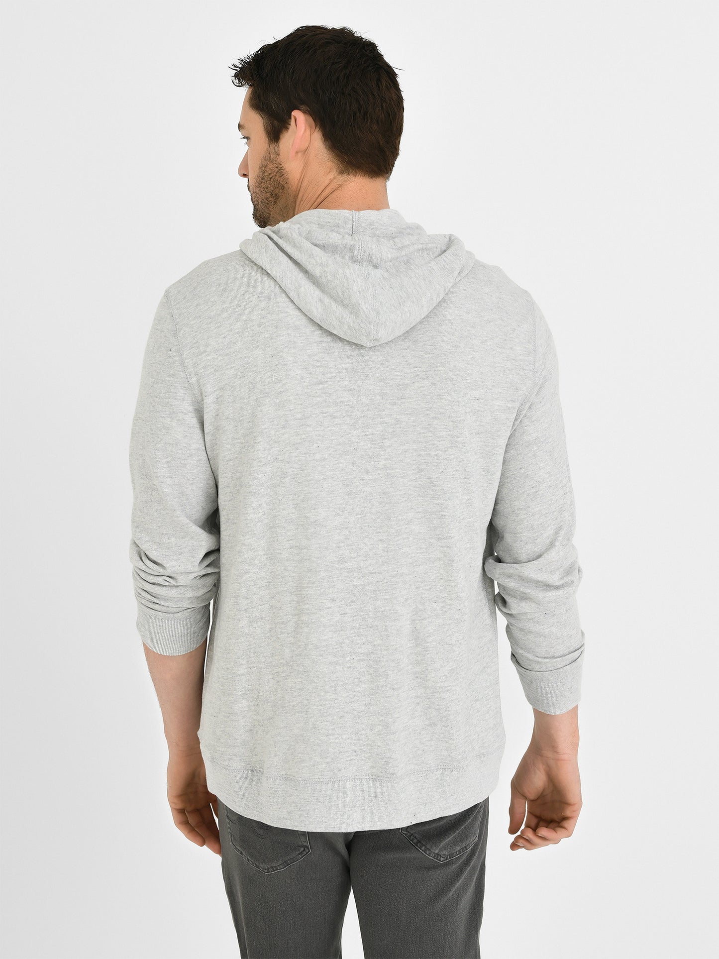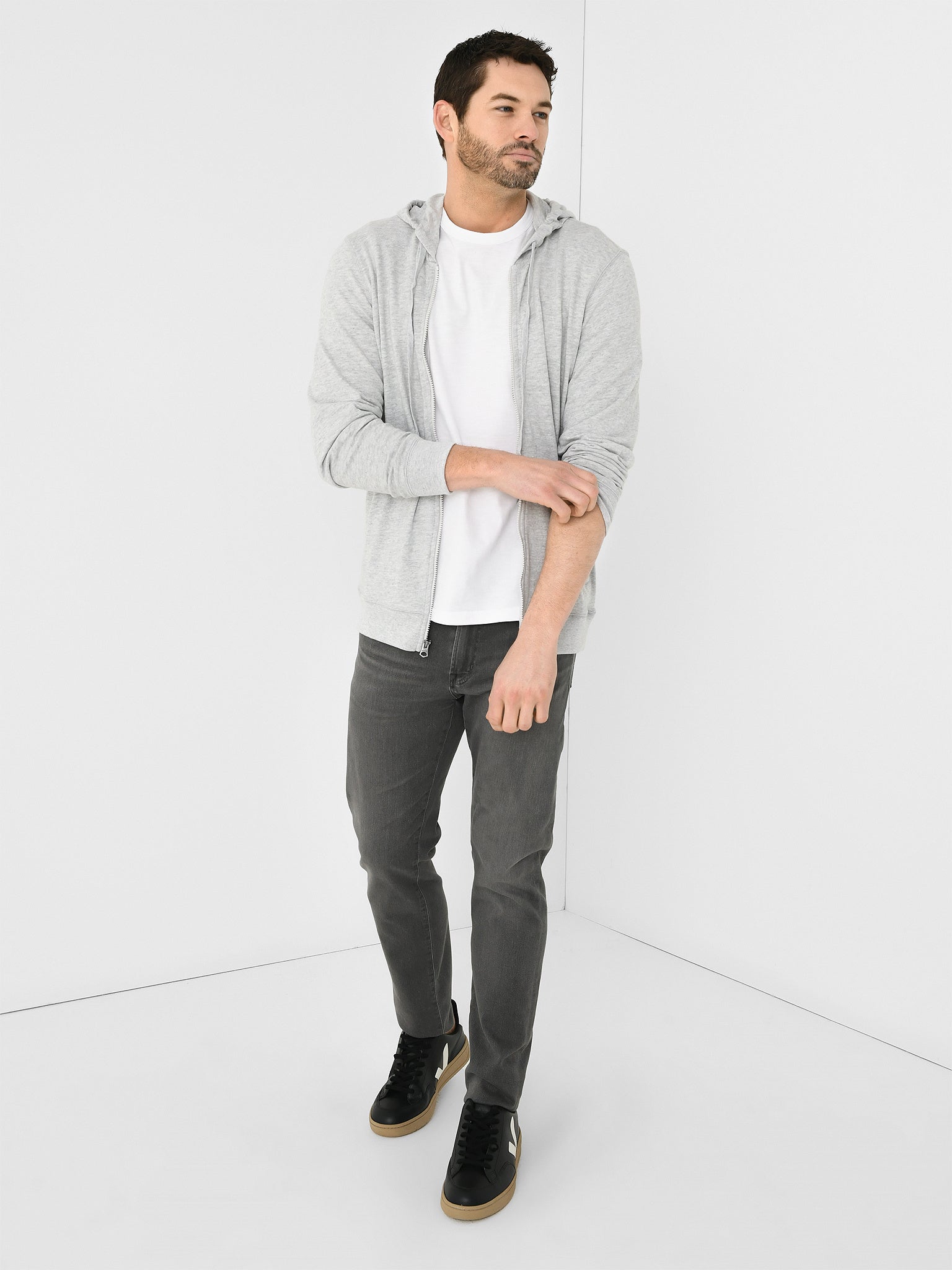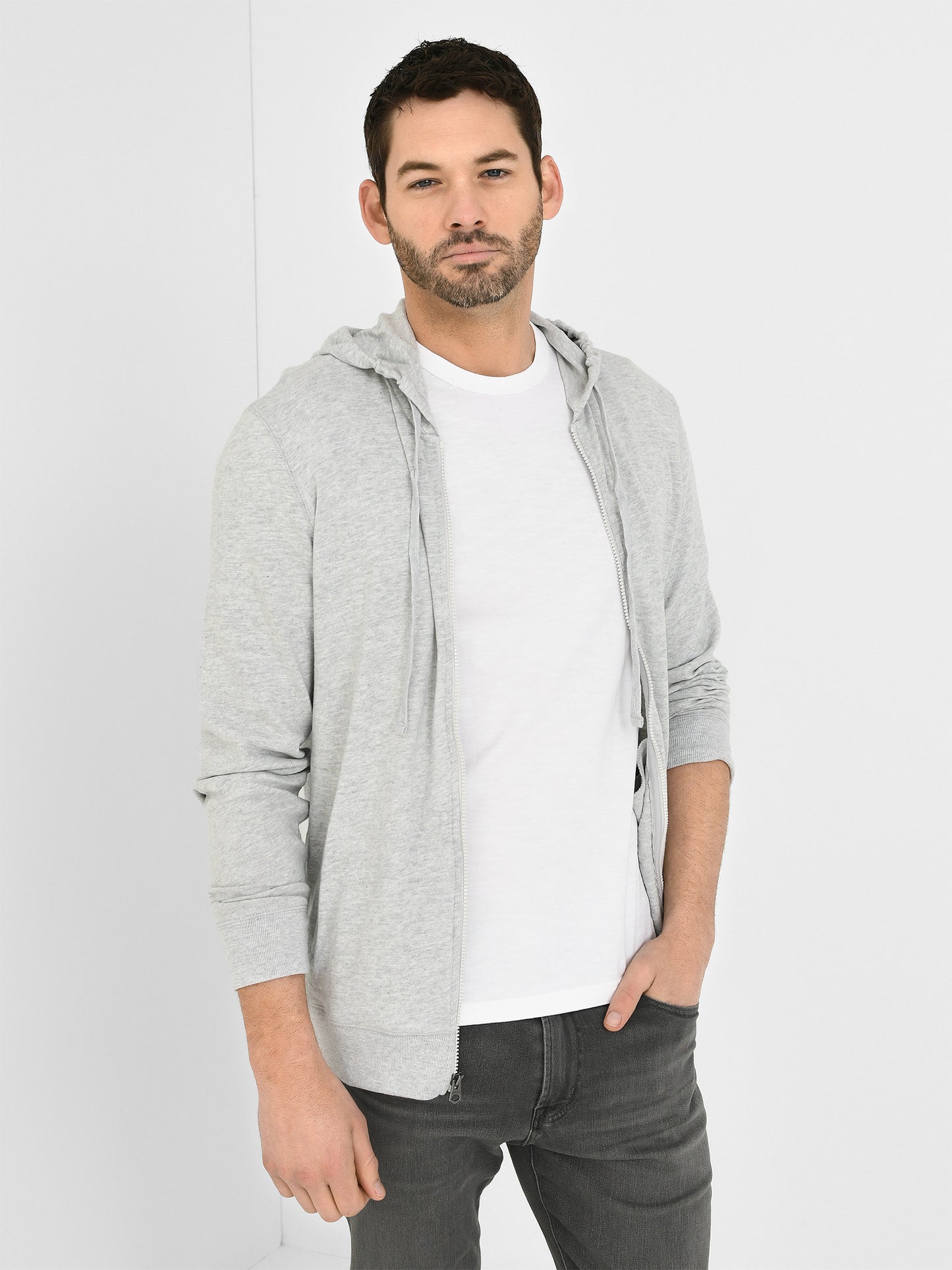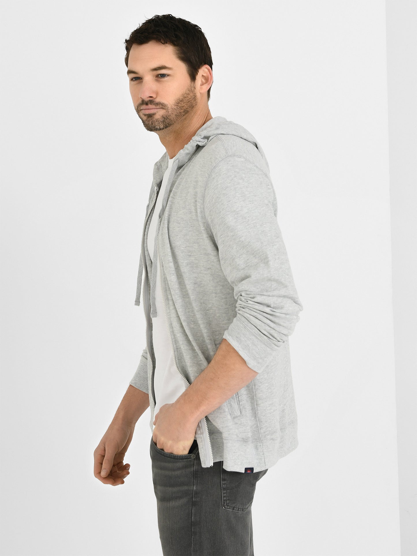 A casual zip hoodie constructed from a soft slub knit fabric designed for everyday comfort.
