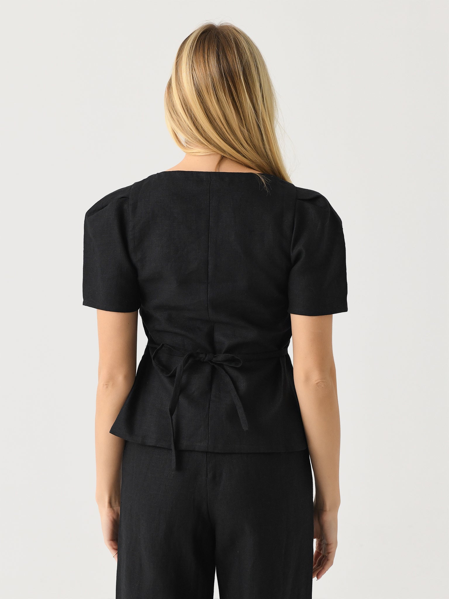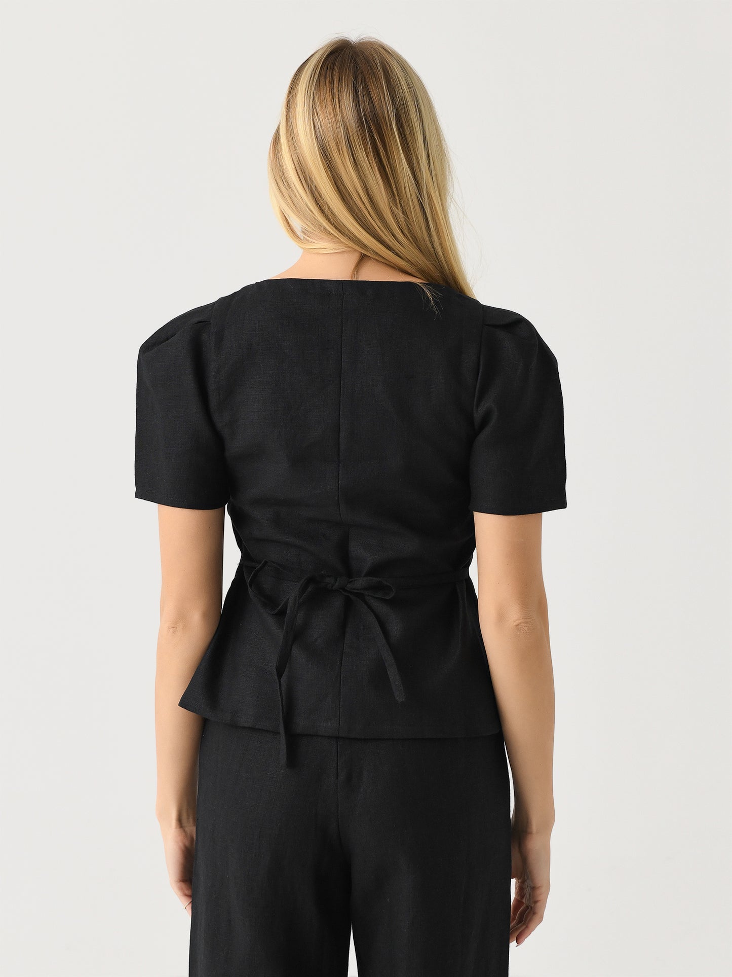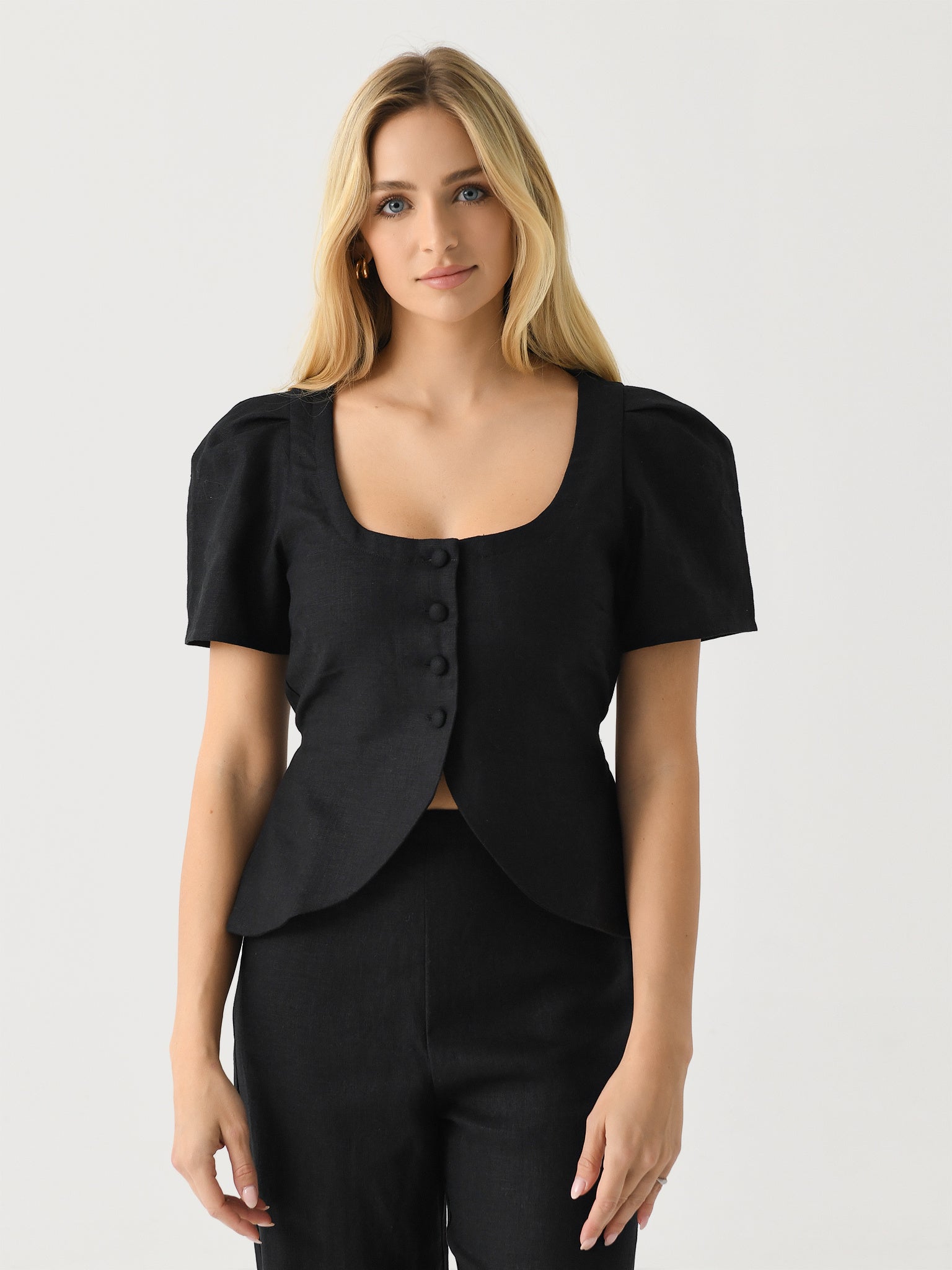 A flattering blouse made from lightweight linen with oversized cap sleeves, self-covered buttons, and a curved hem.