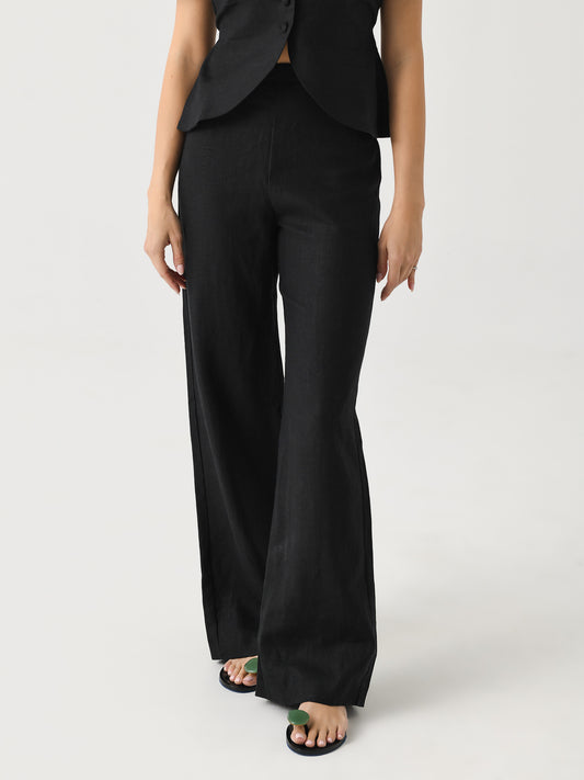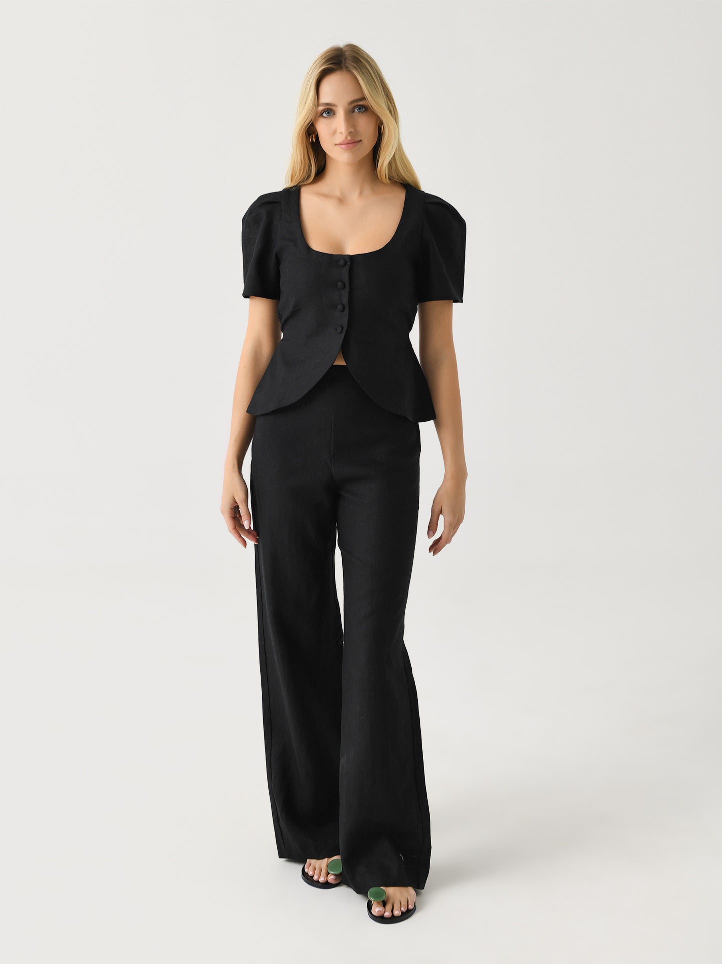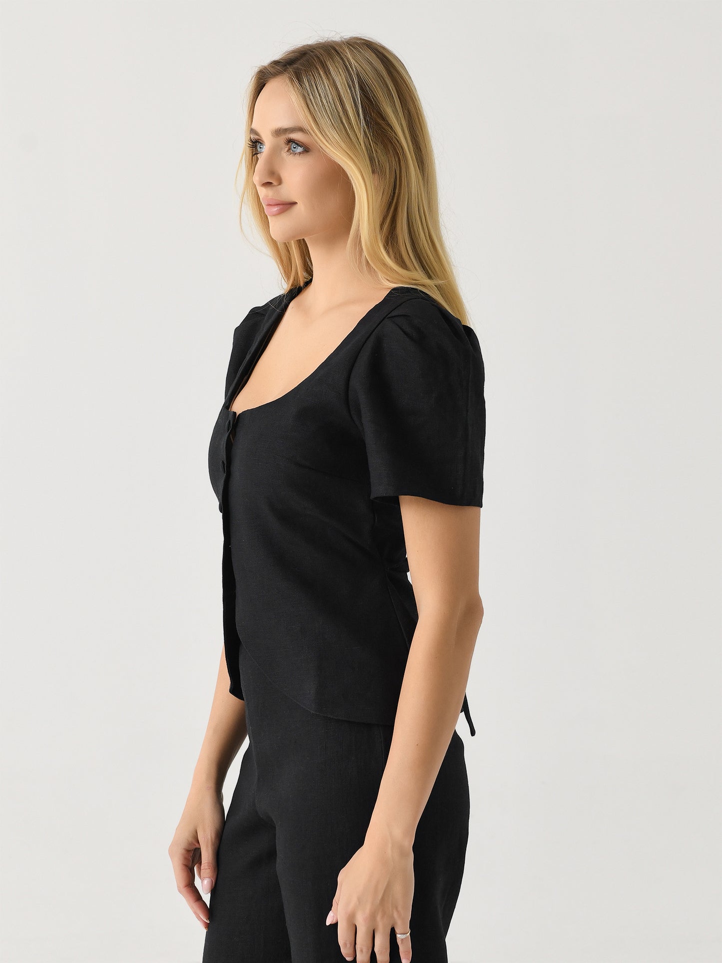 A flattering blouse made from lightweight linen with oversized cap sleeves, self-covered buttons, and a curved hem.