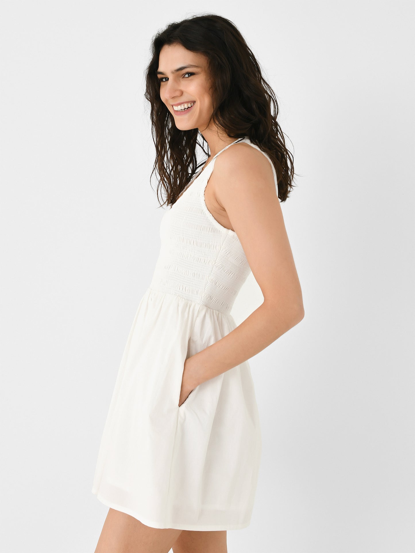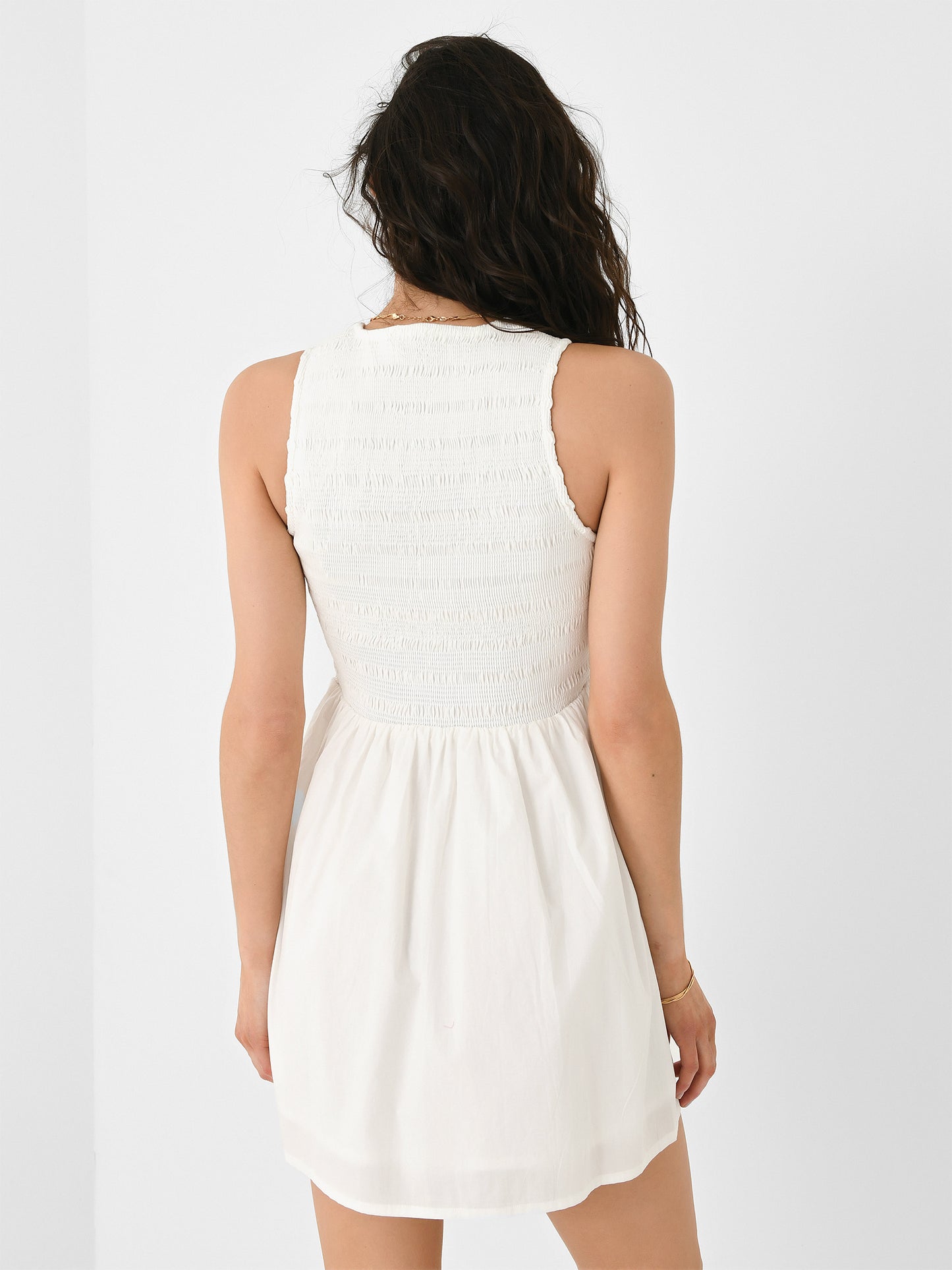 A sleeveless mini dress made from organic cotton with a smocked bodice and gathered skirt.