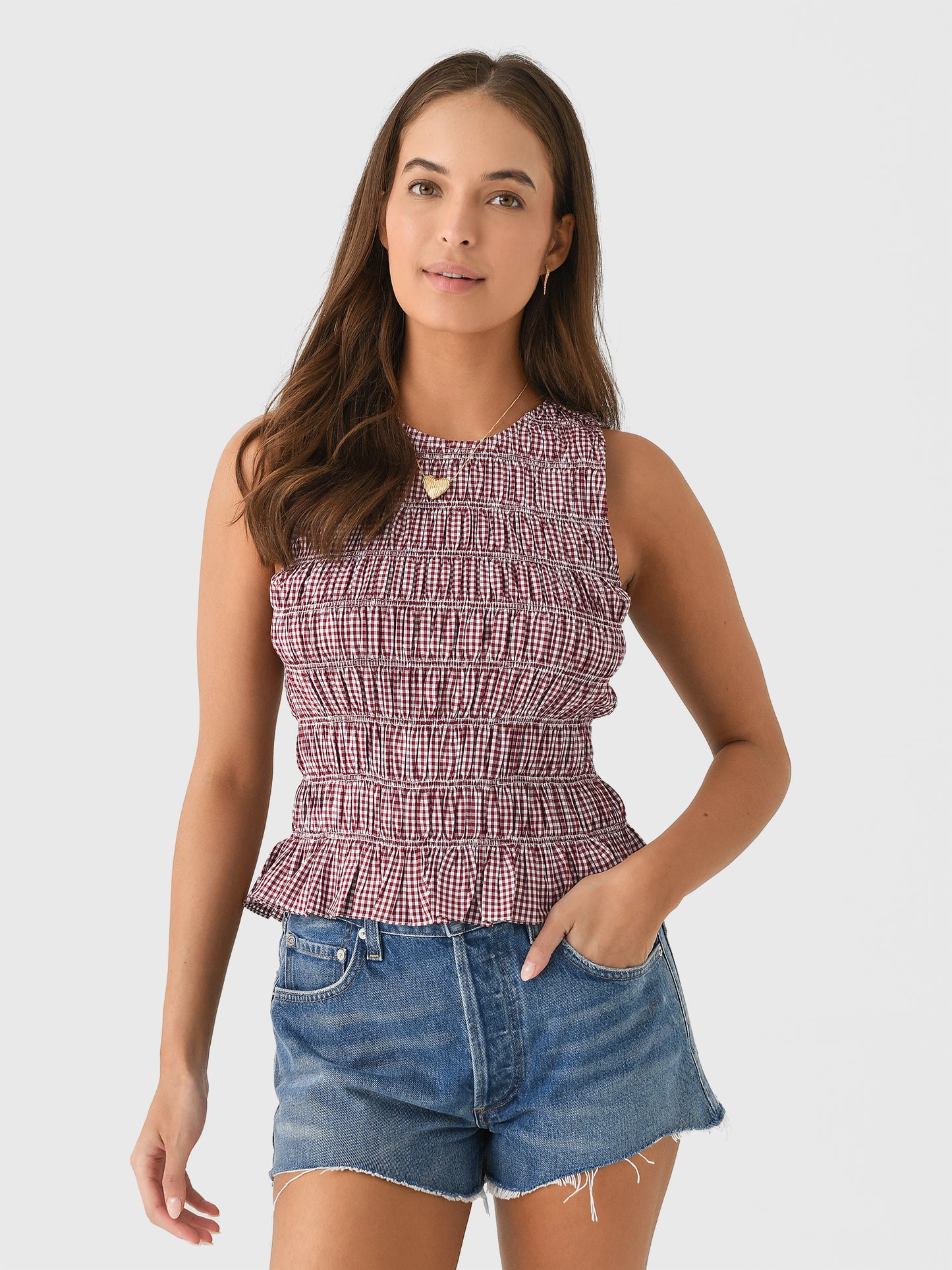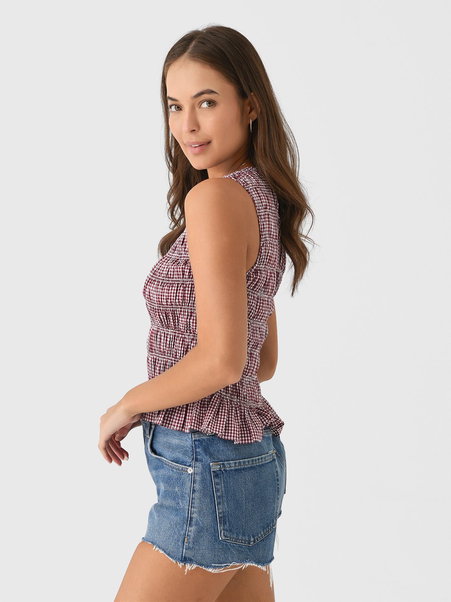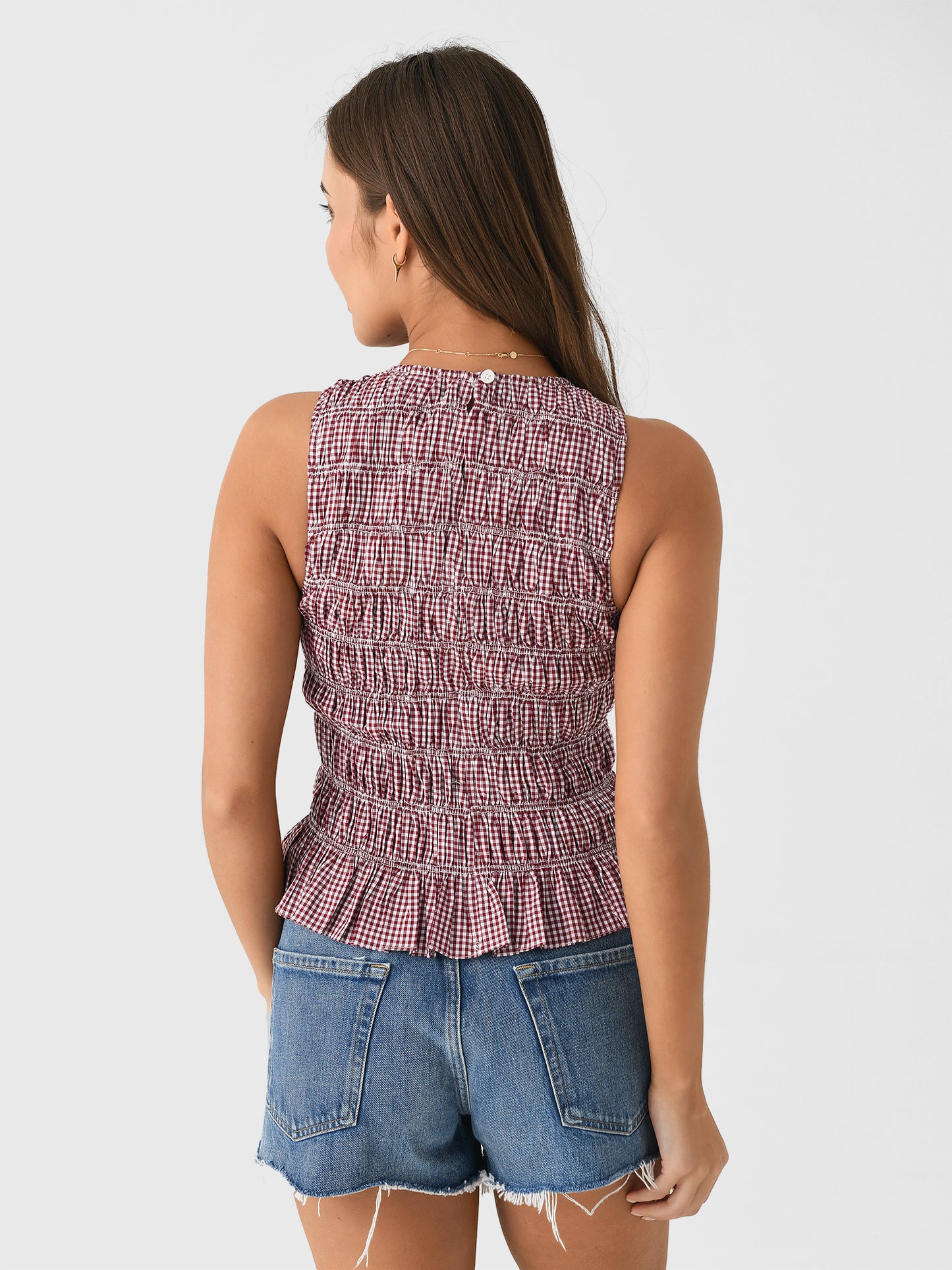 A feminine yet effortless blouse made from shirred organic cotton with a small peplum hem.
