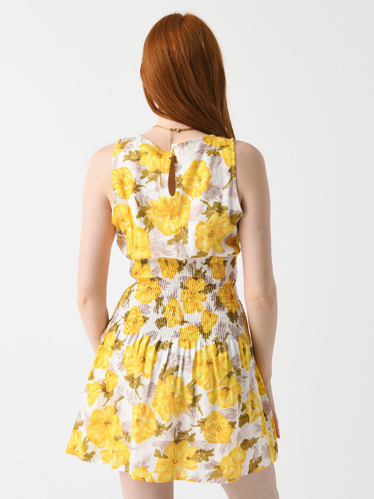 A bright, floral-printed mini dress featuring a large smocked panel and a gathered skirt.
