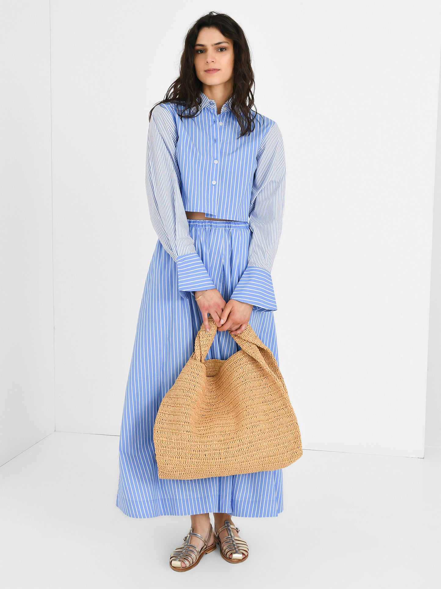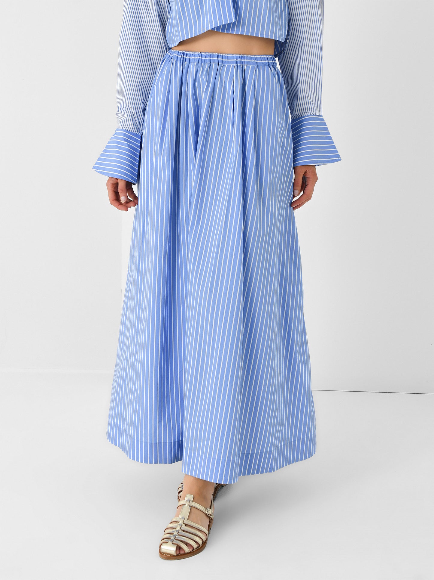 A long pull-on skirt made from lightweight, striped cotton fabric.