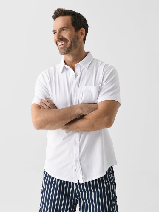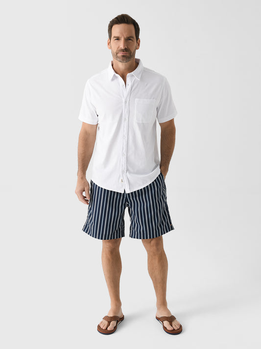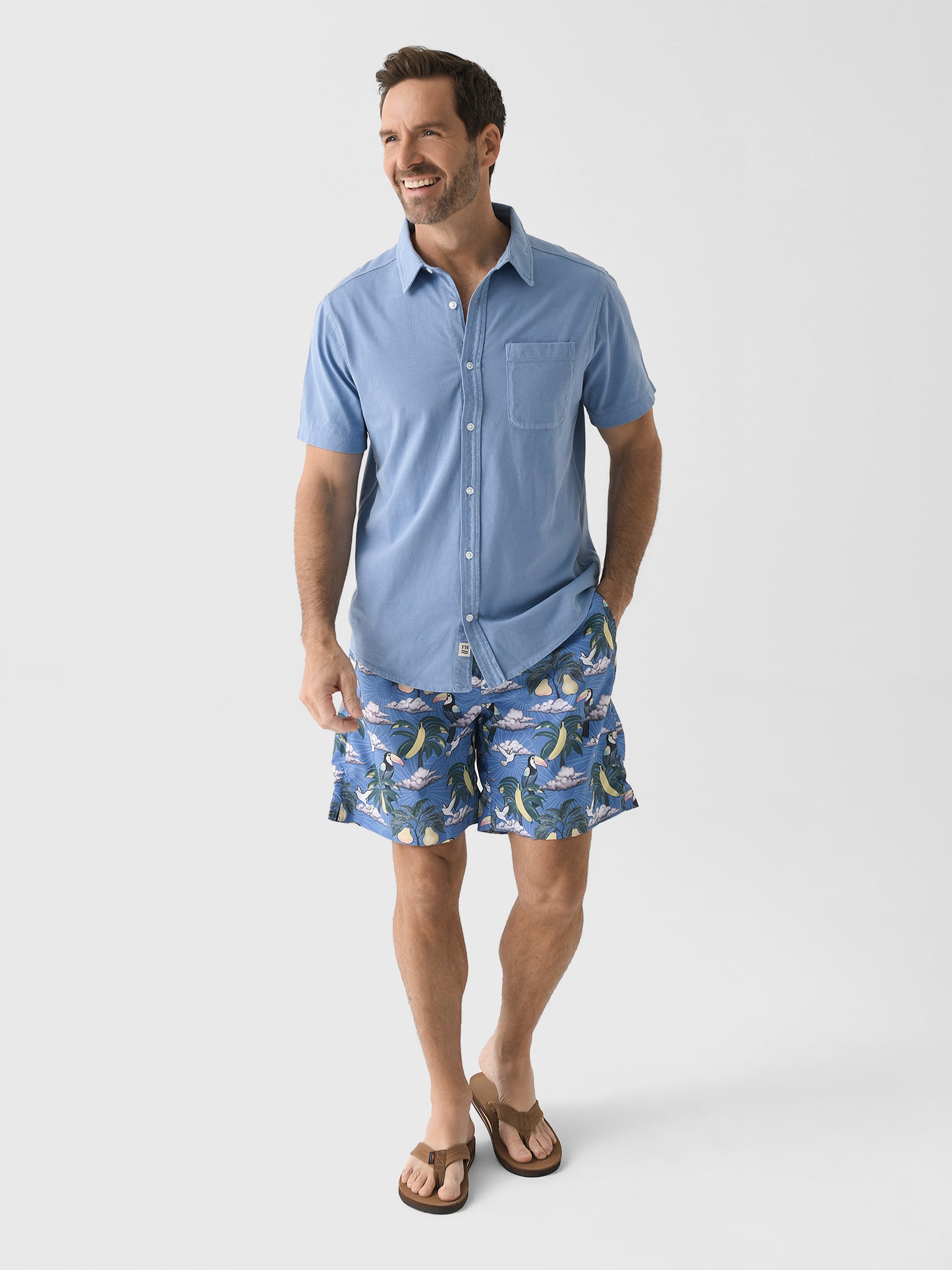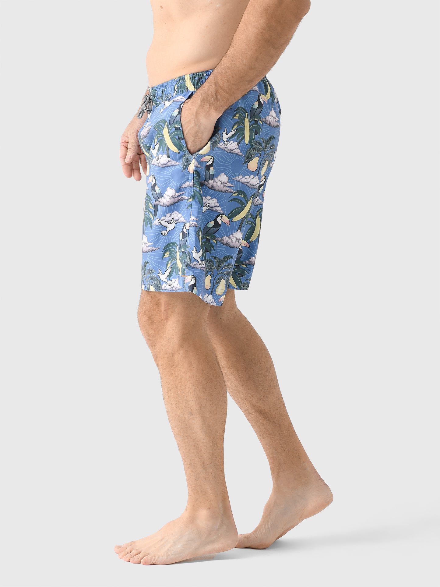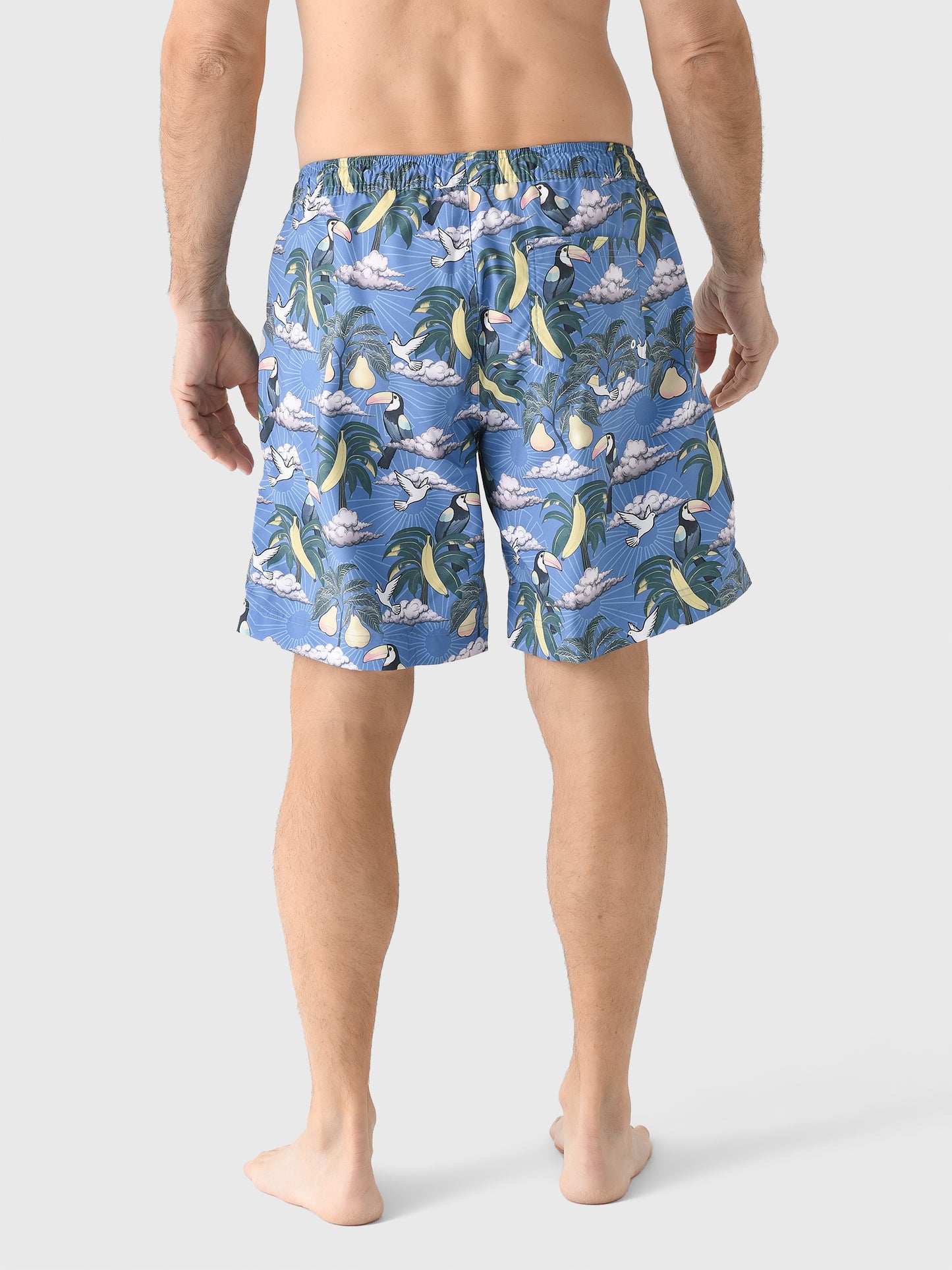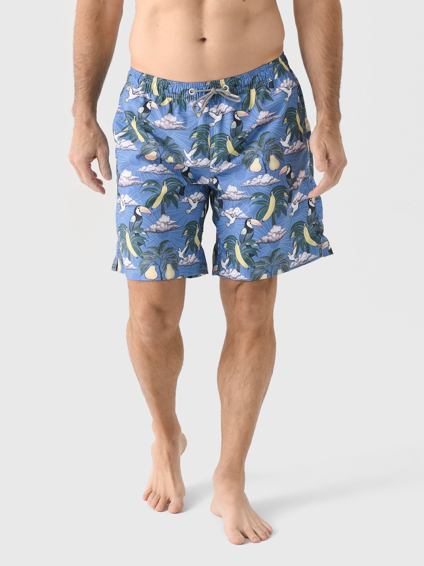 This lightweight swim trunk is made from sustainable material and features a tropical-inspired toucan print.
