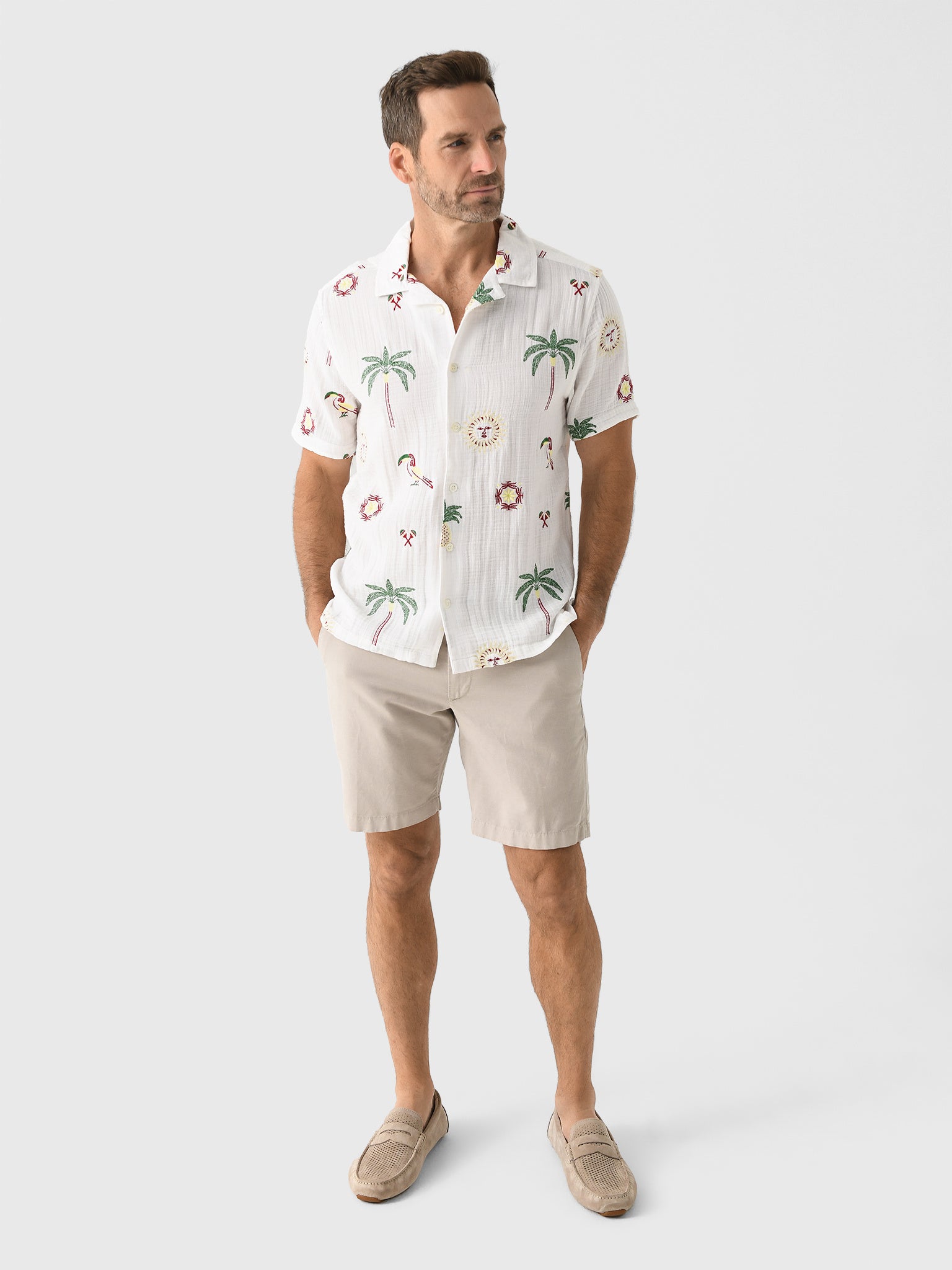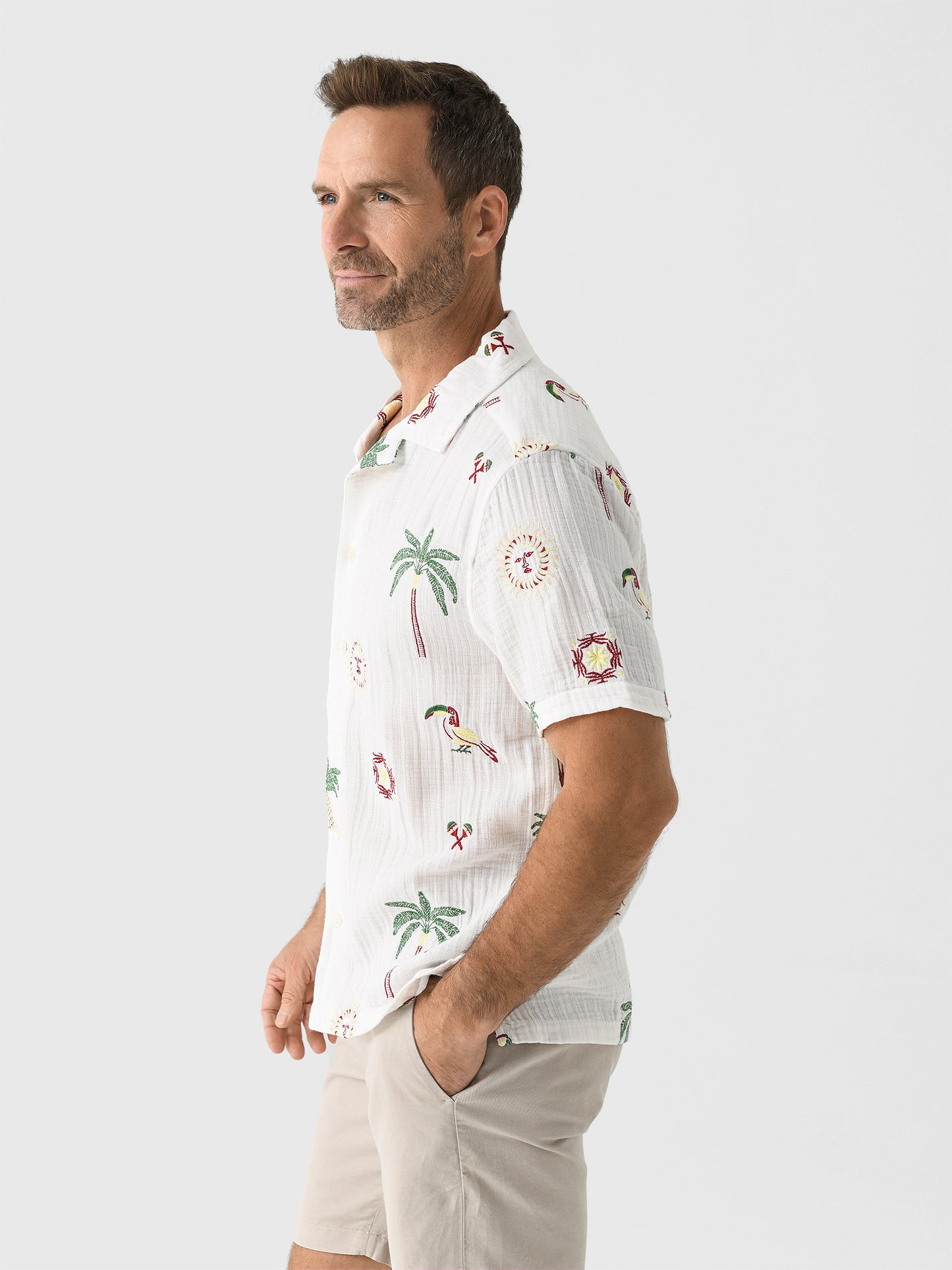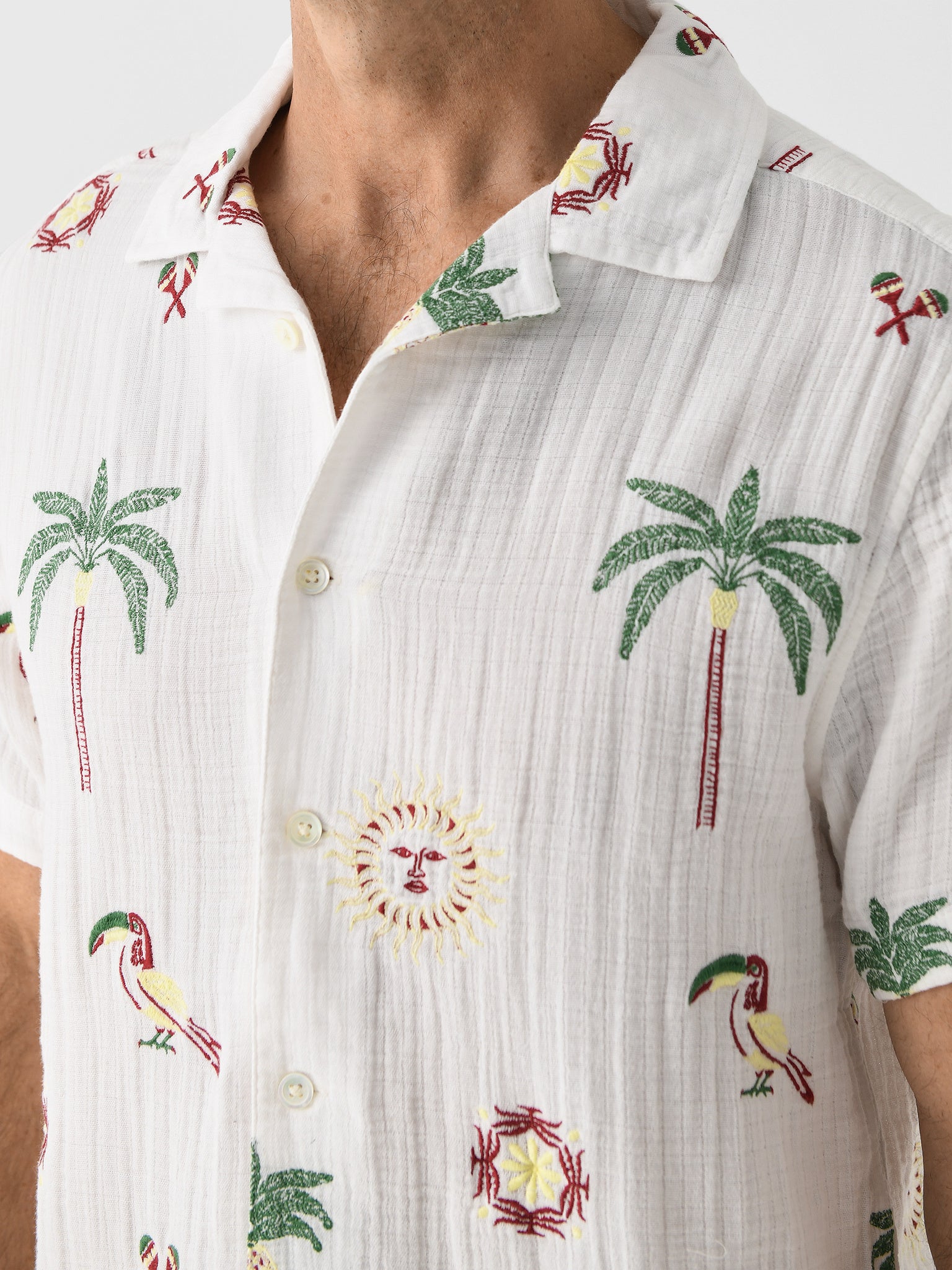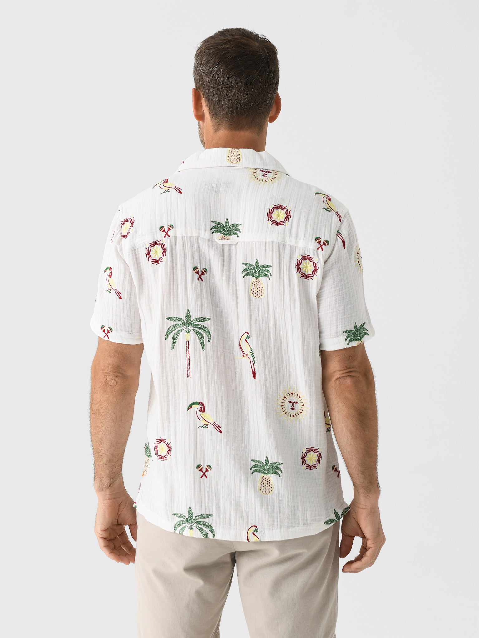 A lightweight button-down shirt made from double cloth cotton with a tropical-inspired embroidered print.