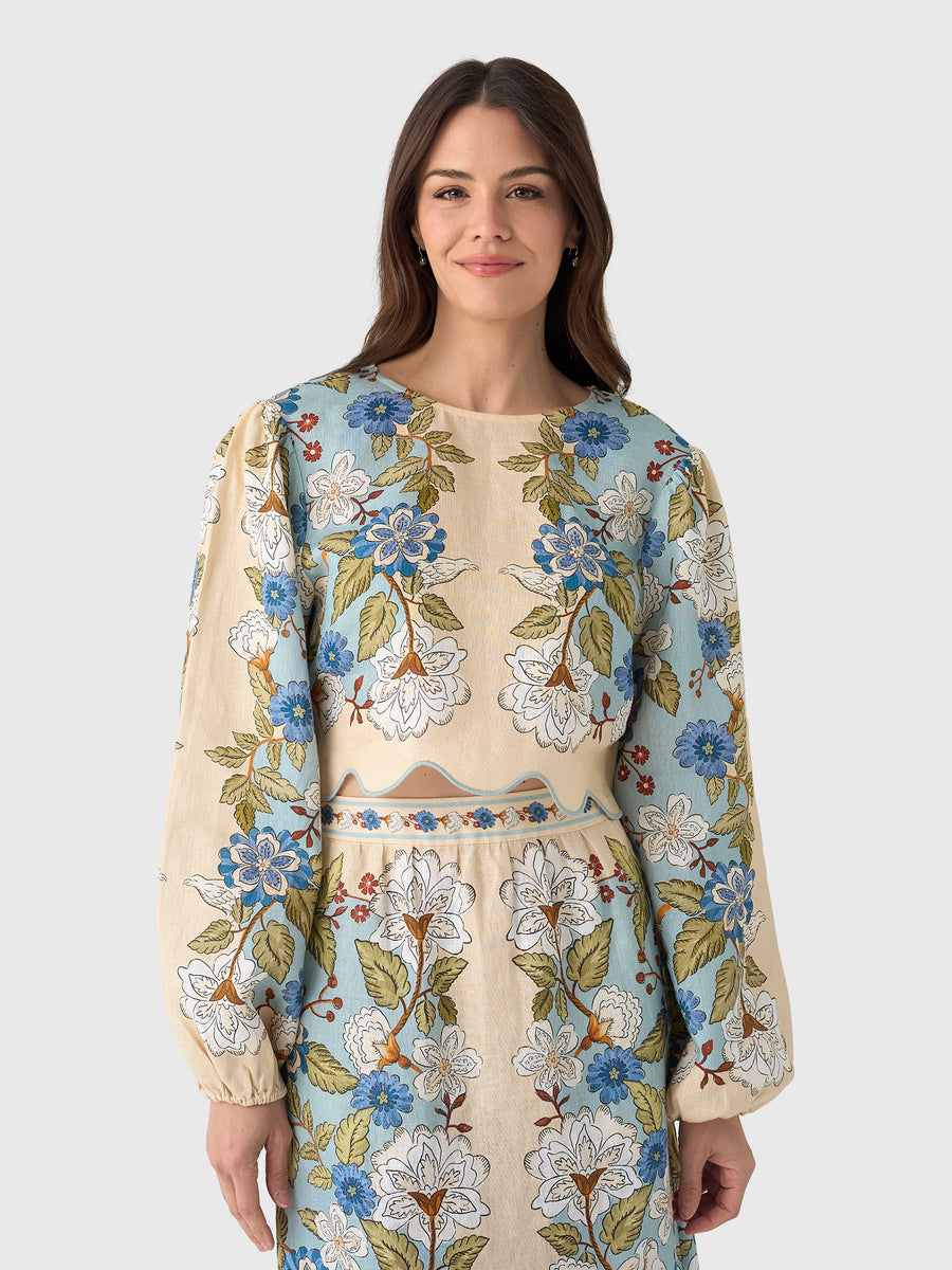 Round Neckline Back Keyhole Button Closure Puff Sleeves Scalloped Hem Cropped Silhouette All-Over Novelty Print 100% Linen Classic Fit Model is wearing size Small blouse. Model's Measurements: Height: 5'10" | Bust: 34B | Waist: 25" | Hips: 35" | Dress Size: 2 (US)