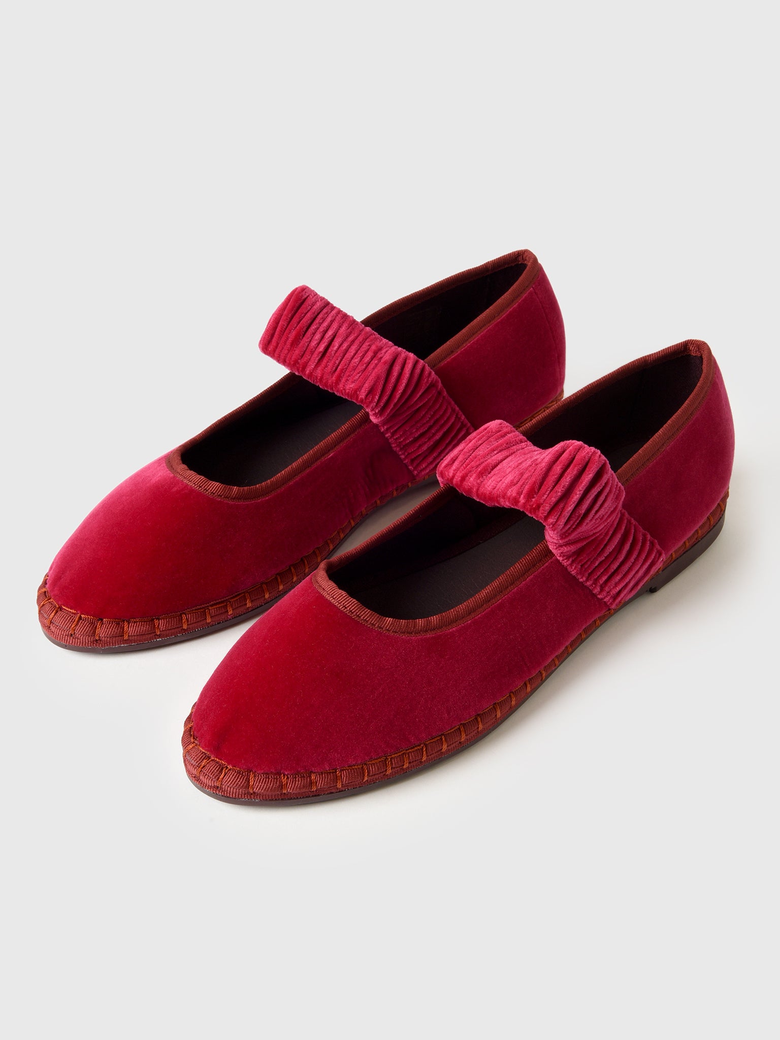 A pink velvet flat featuring a ruched vamp strap and recycled rubber sole.