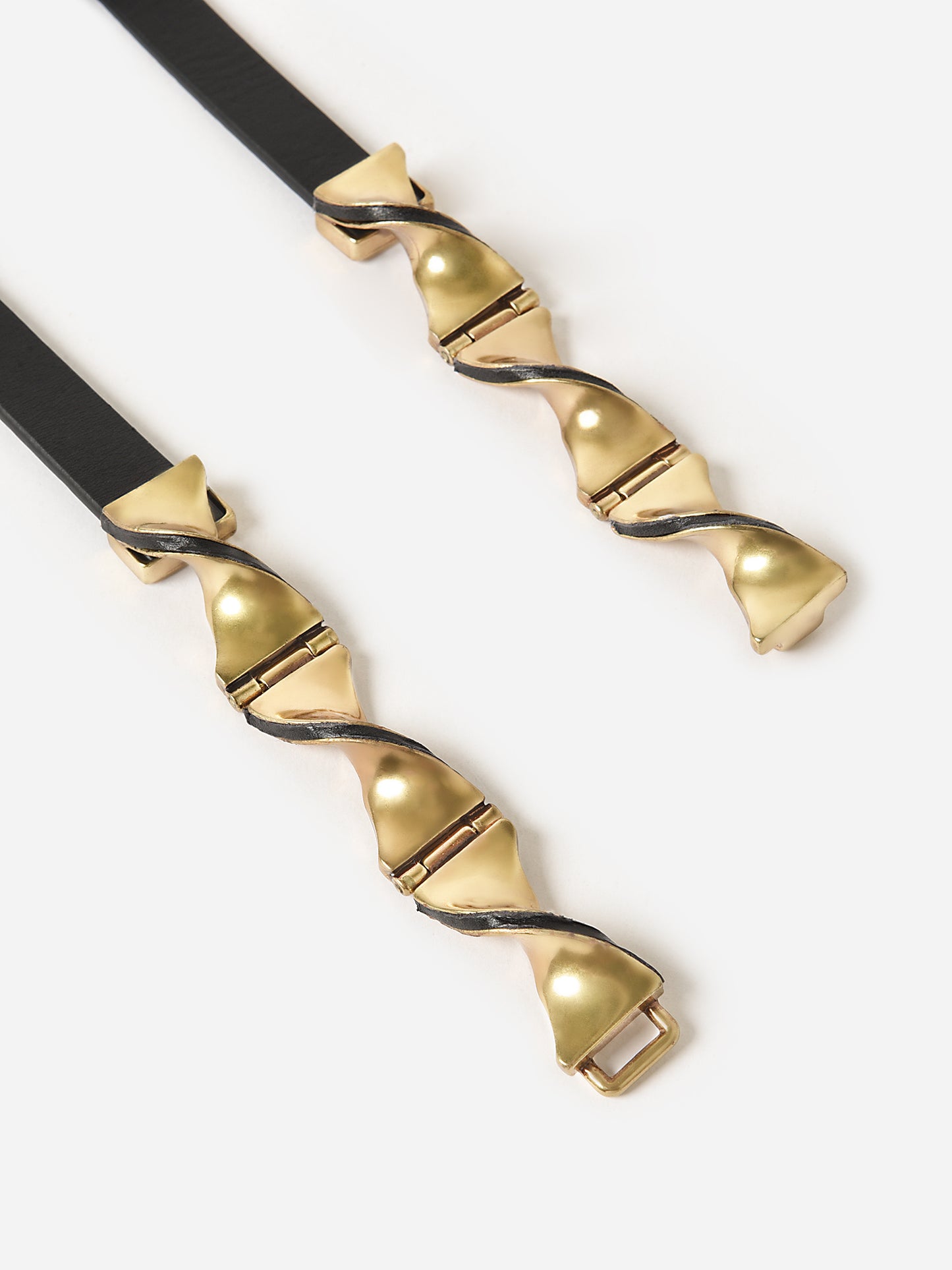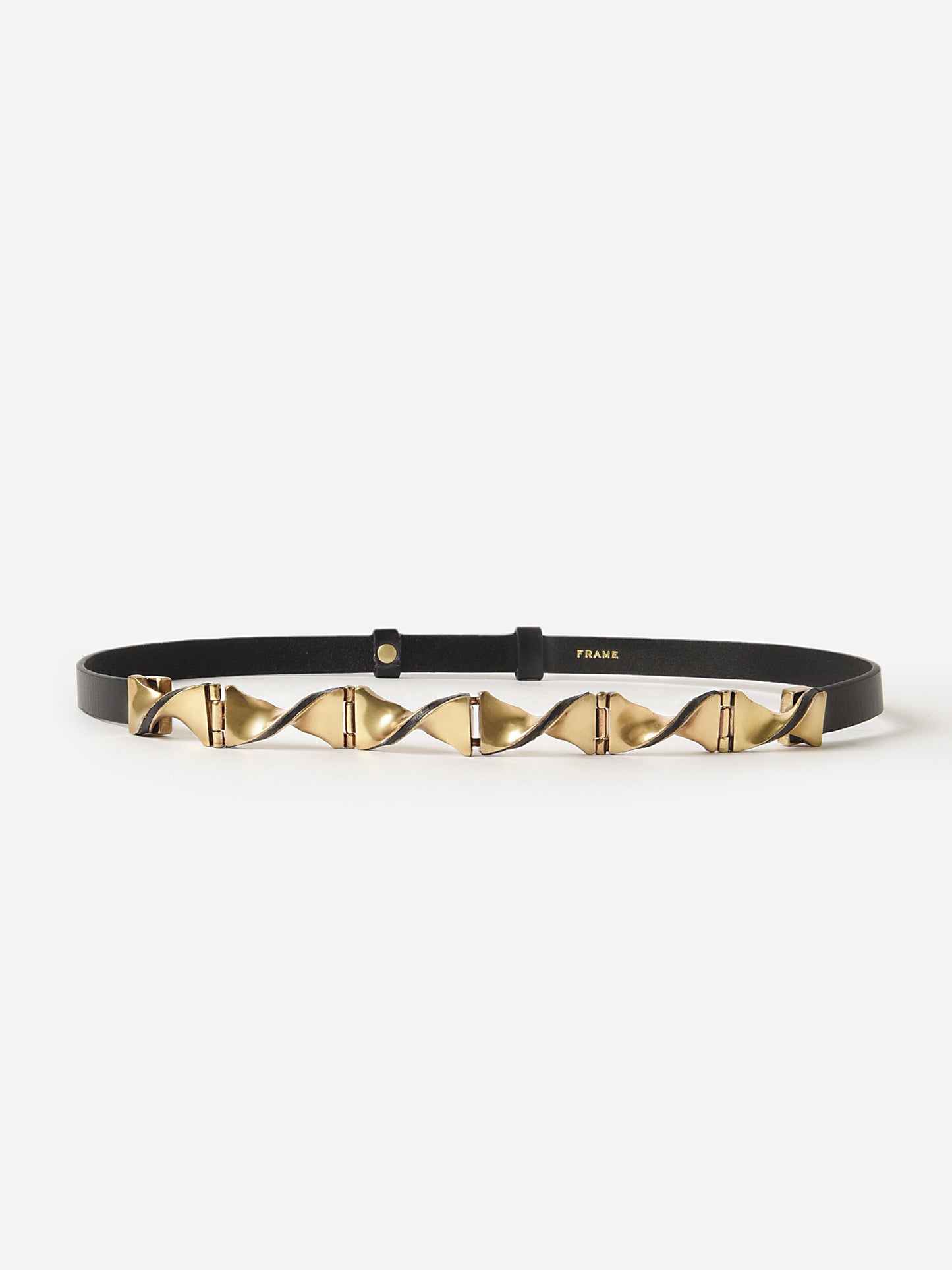 A chic leather belt featuring a unique twisted pasta-inspired brass buckle.