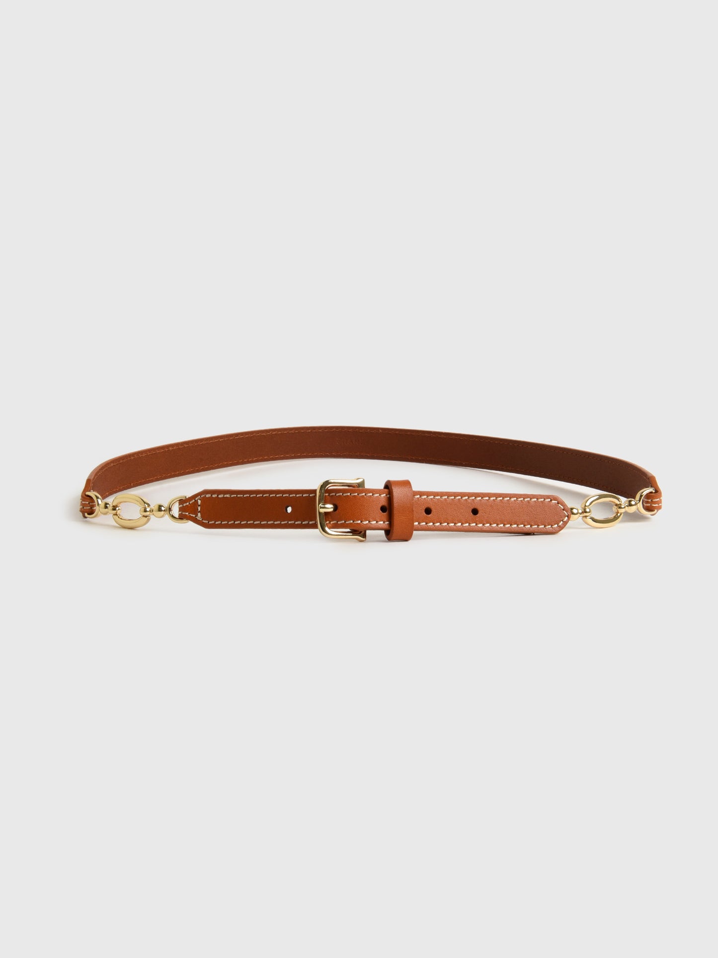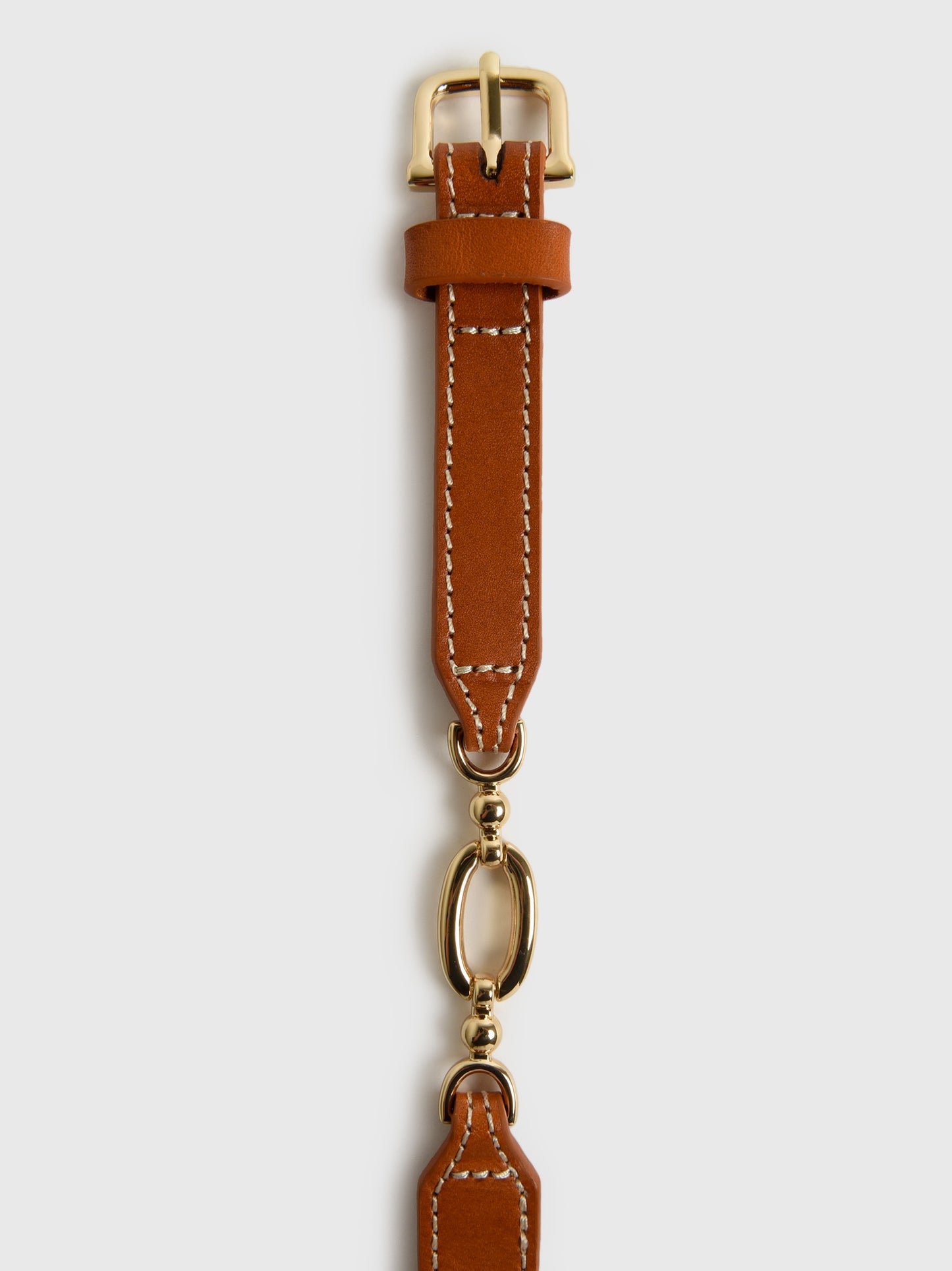 A sleek belt made from durable leather with gold-toned chain detailing.