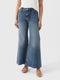 This high-waisted jean is made from comfortable stretch denim fabric and features a swingy wide-leg design with an ankle-length raw hem.