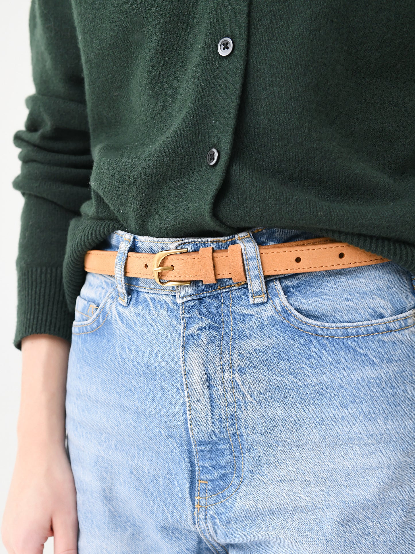 A slim leather belt with a gold twisted buckle.