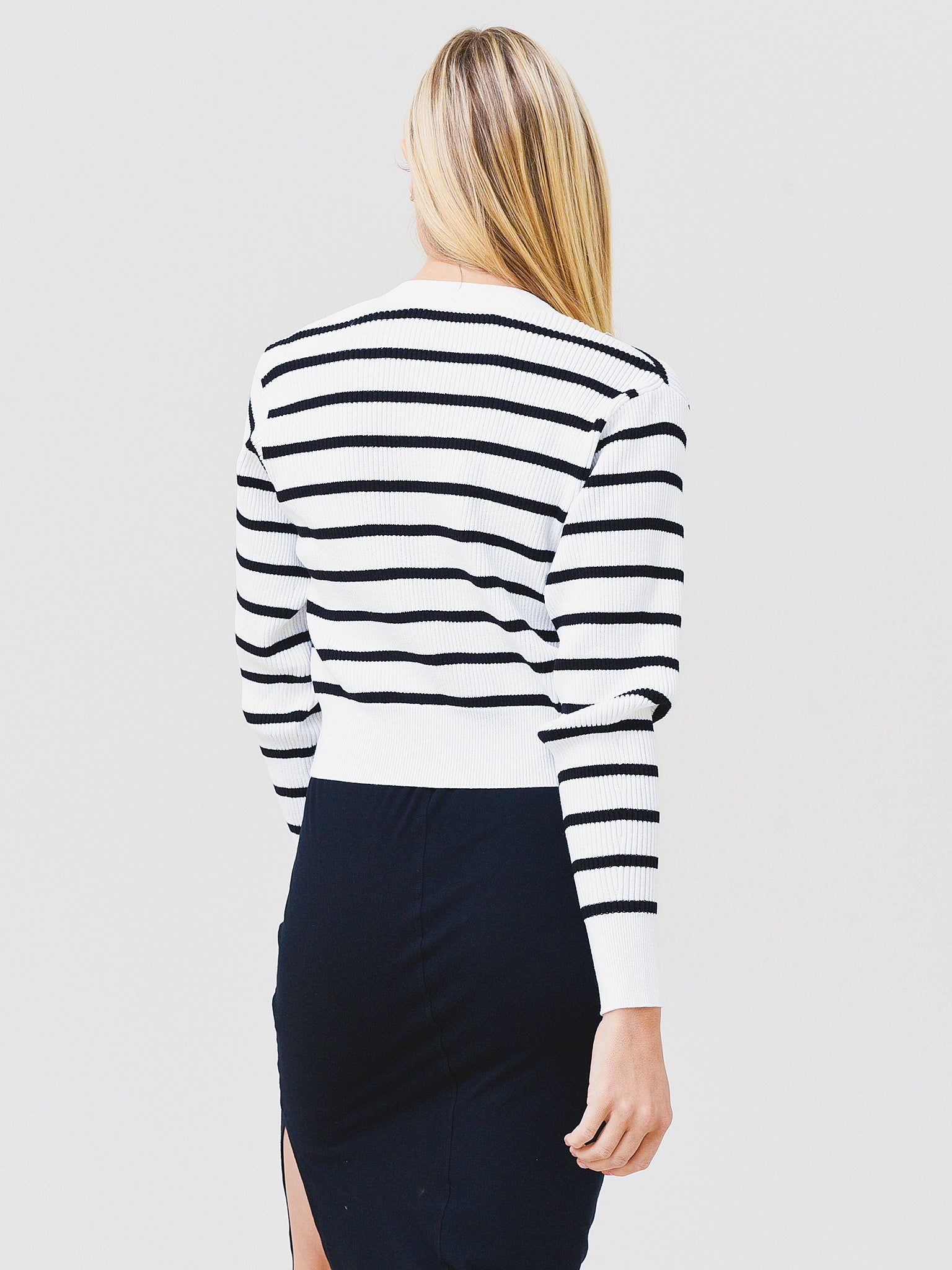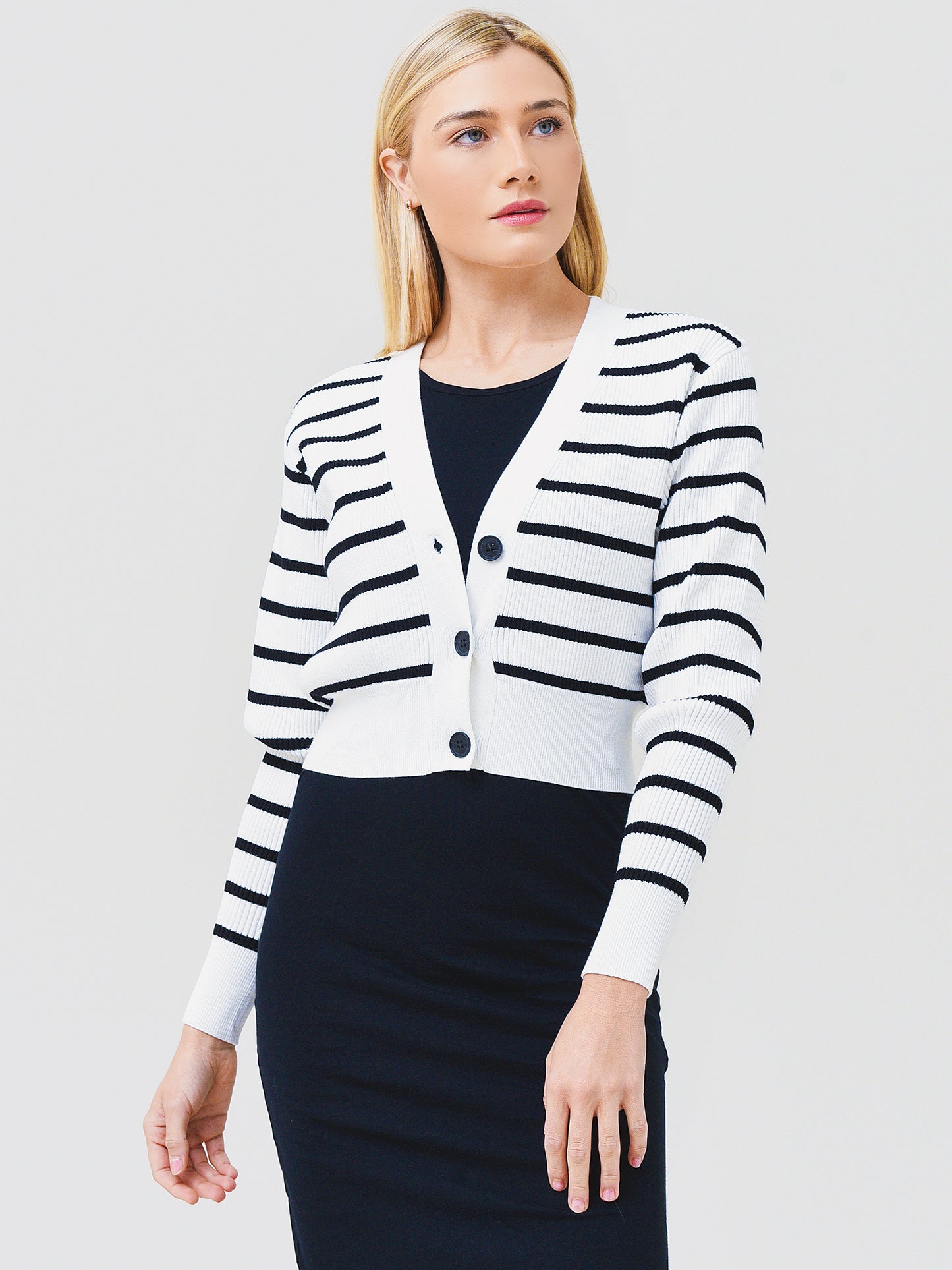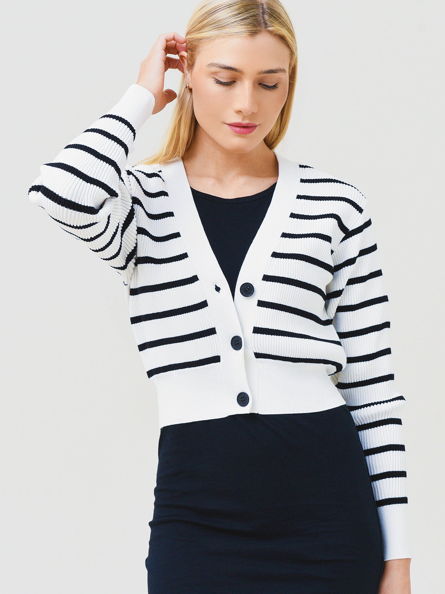 Ribbed cardigan with dropped shoulders and three-button closure.