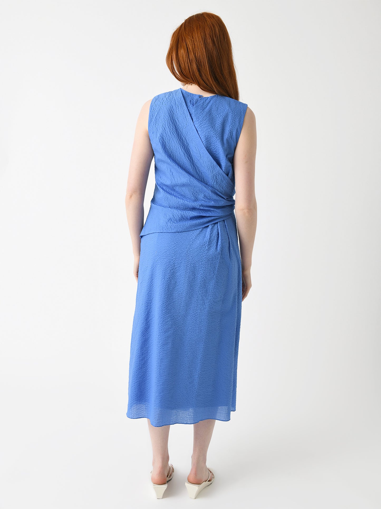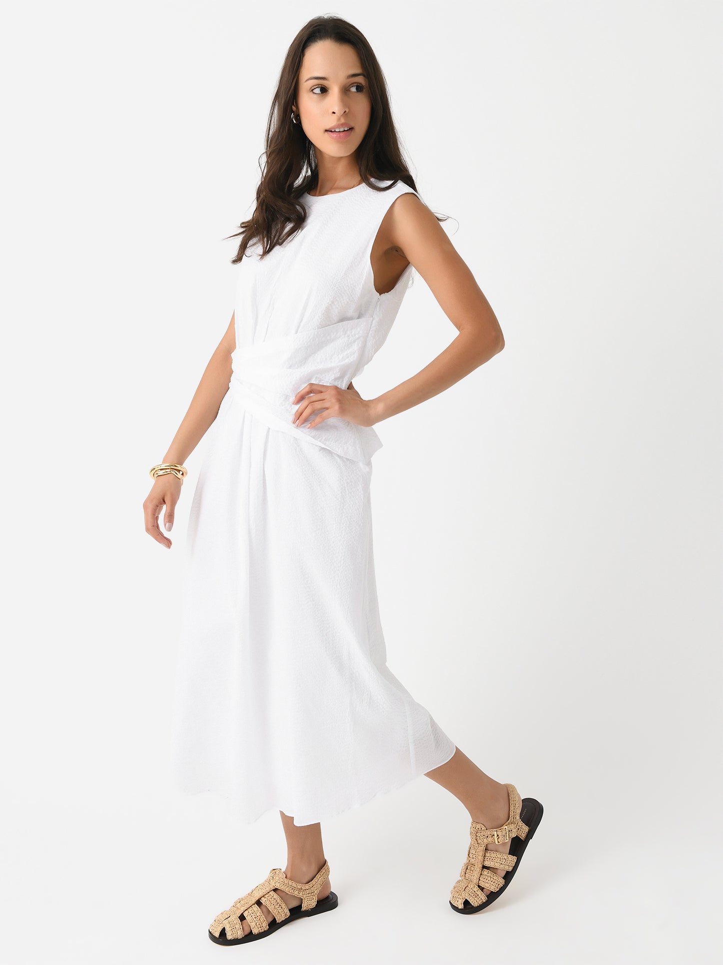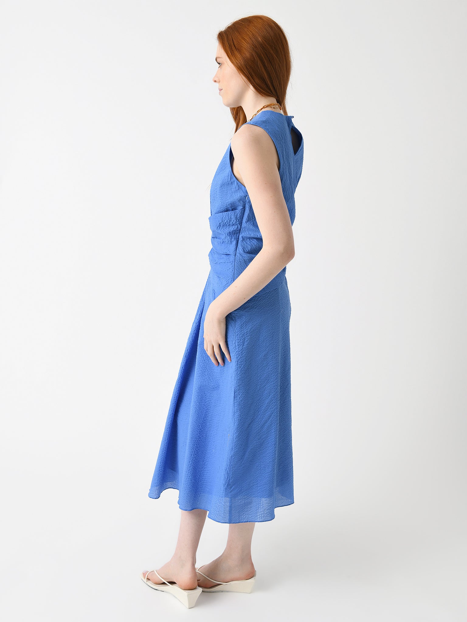 A sleeveless midi dress made from textured cotton with a shirred panel detail.